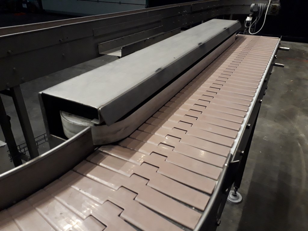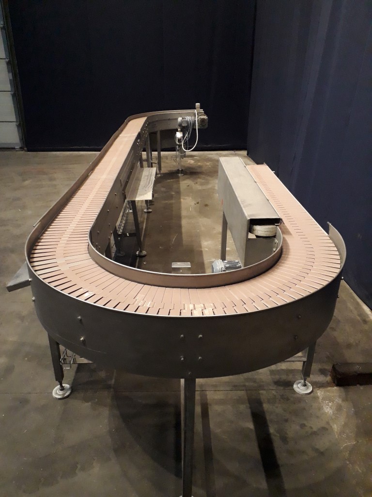 Chain conveyor with 90 ° infeed corner and 180 ° outfeed corner. Effective belt: 1.000 x 25 cm. Motor: 0,55 kW - 52 rpm. Horizontal. Total 160 x 650 x 115 cm.