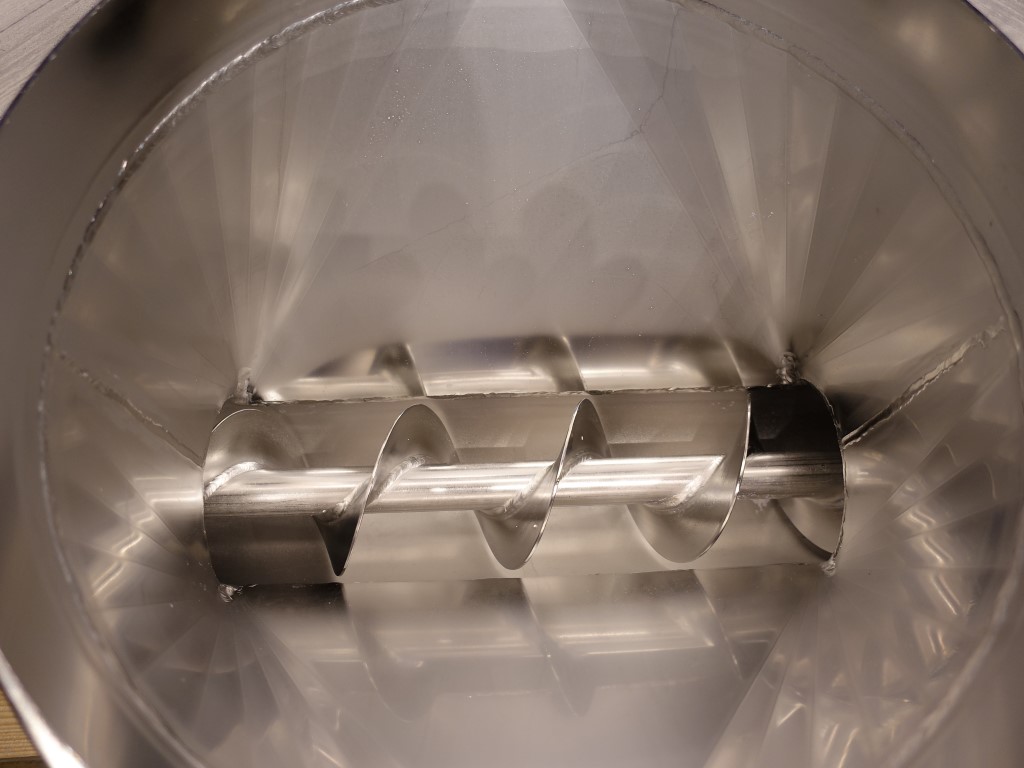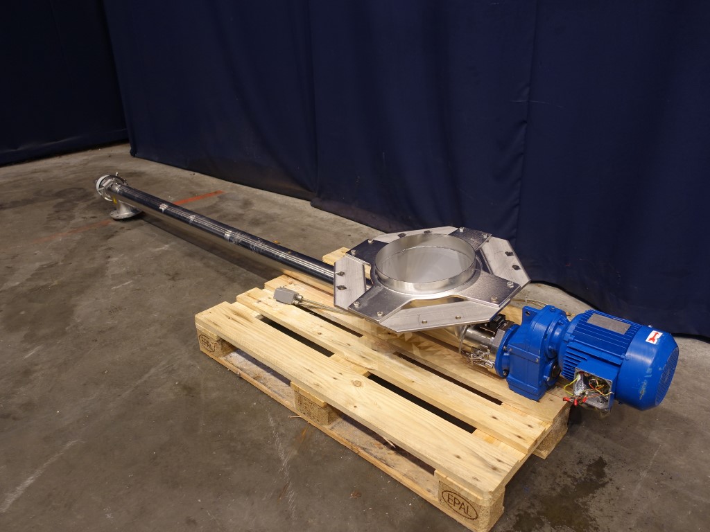 Powder transport auger. Length of auger 250 cm. Diameter auger: 10 cm. Displacement per revolution ± 9 cm length. Motor: 1,5 kW - 3,7 A - n1: 1710 rpm - n2: 100 rpm. Inlet: diameter 30 cm. Outlet diameter 10 cm flange connection.