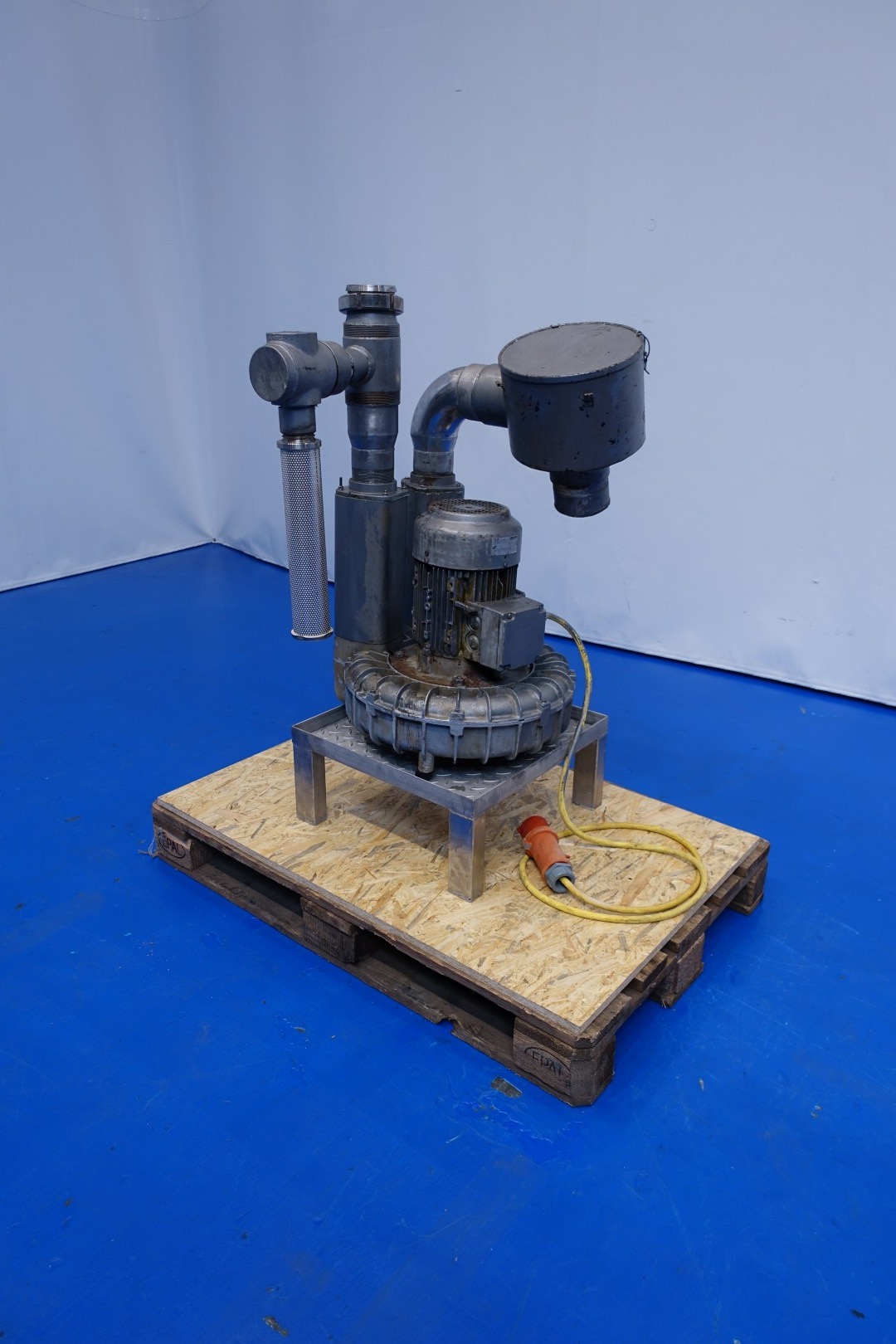 Air vacuum pump. Pressure: 150/135 mbar. Motor 4,0 kW - 7,8 A - 2.895 rpm. Connections: (Out) 1x DN80 Din. Total dimensions: 65x60x112 (lxwxh) - weight: 138 kg.