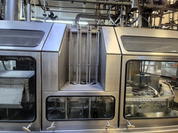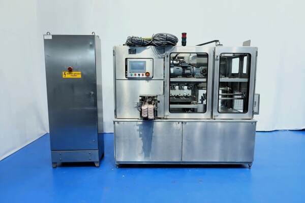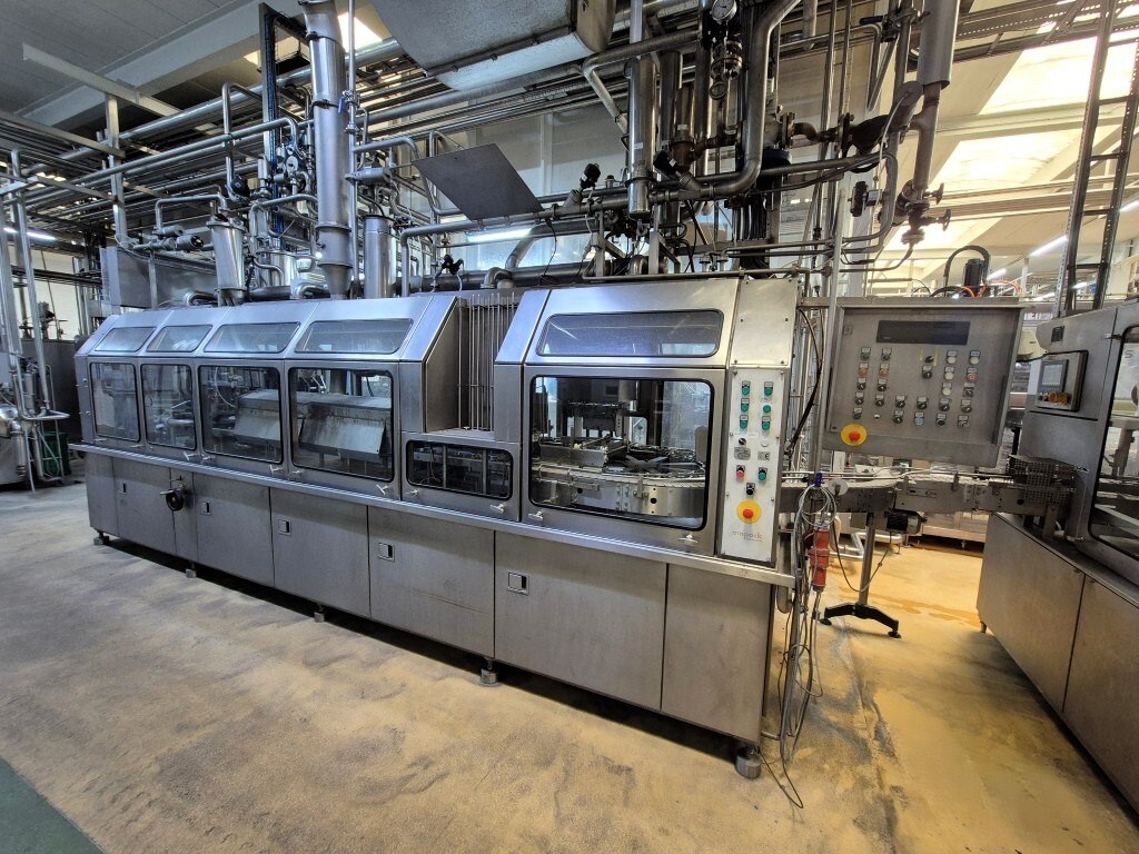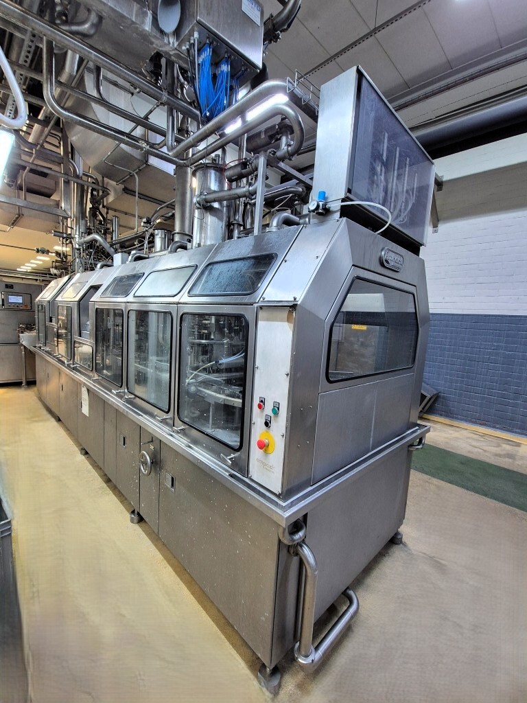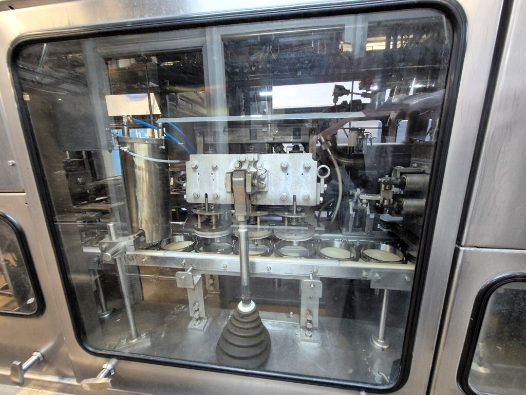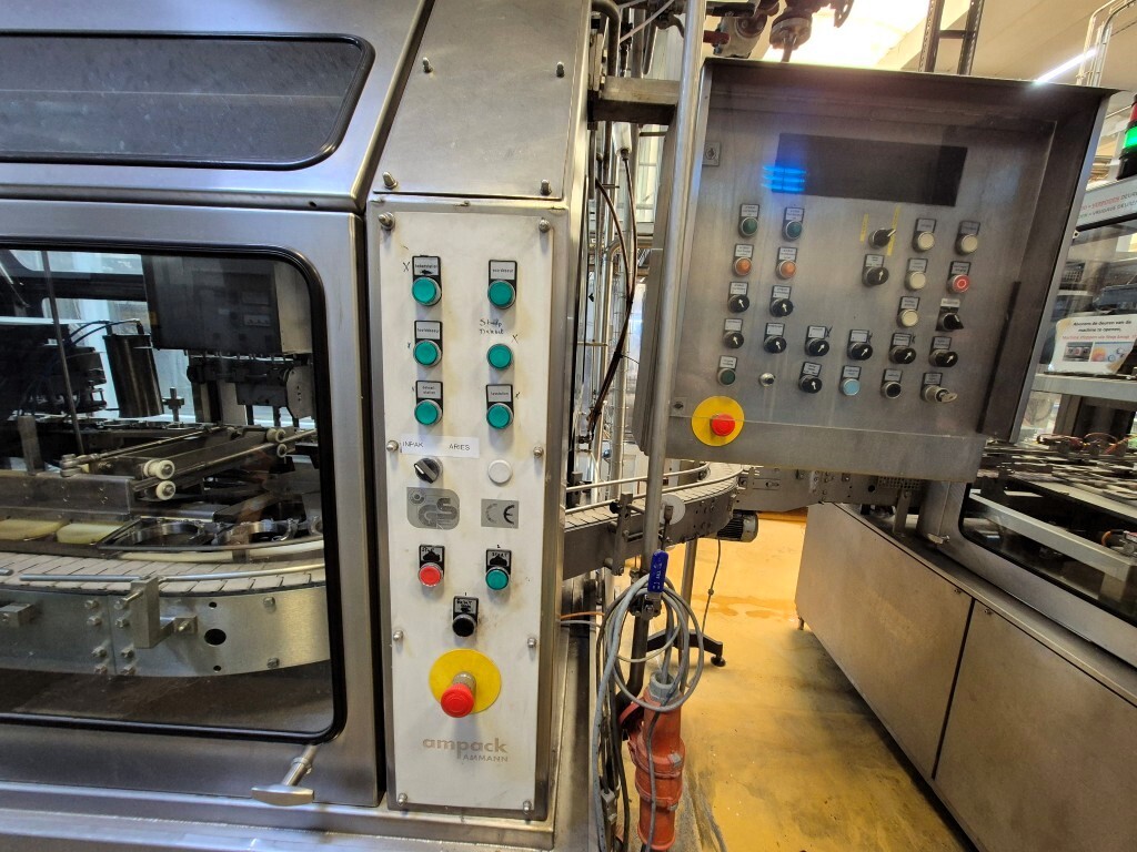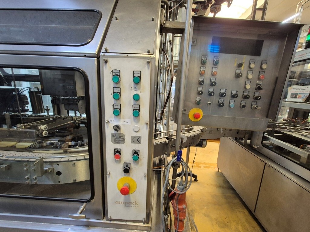 Ampack KF1/3: De carousel cupvul- en sealmachine is ontworpen voor ronde voorgevormde cups met een diameter van 95 mm. De capaciteit is afhankelijk van de viscositeit en schuimeigenschappen van het product, evenals van de vorm en de vulhoogte van de verpakking. De machine beschikt over vacuüm cupontstapeling, cupdesinfectie door peroxide-injectie met droging via oververhitte stoom in vier stappen met geïntegreerde elektrische luchtverhitter, een predoser met snijdoser voor viskeuze producten zoals fruitjam (CIP-reinigbaar door een reinigingsstaaf te plaatsen) en een hoofdpositief doser/combifiller geschikt voor zowel dunne als dikke producten, eveneens CIP-reinigbaar. Extra stations omvatten sealdesinfectie met infraroodstralers en sealing, heat sealing, sealcontrole door cupdruk en detectie, een over snap cap-dekeldrukstation voor 95 mm cups en uitloop naar een transportband. De machine wordt bestuurd via Siemens Simatic S5 en is oorspronkelijk geleverd als ASGP4.