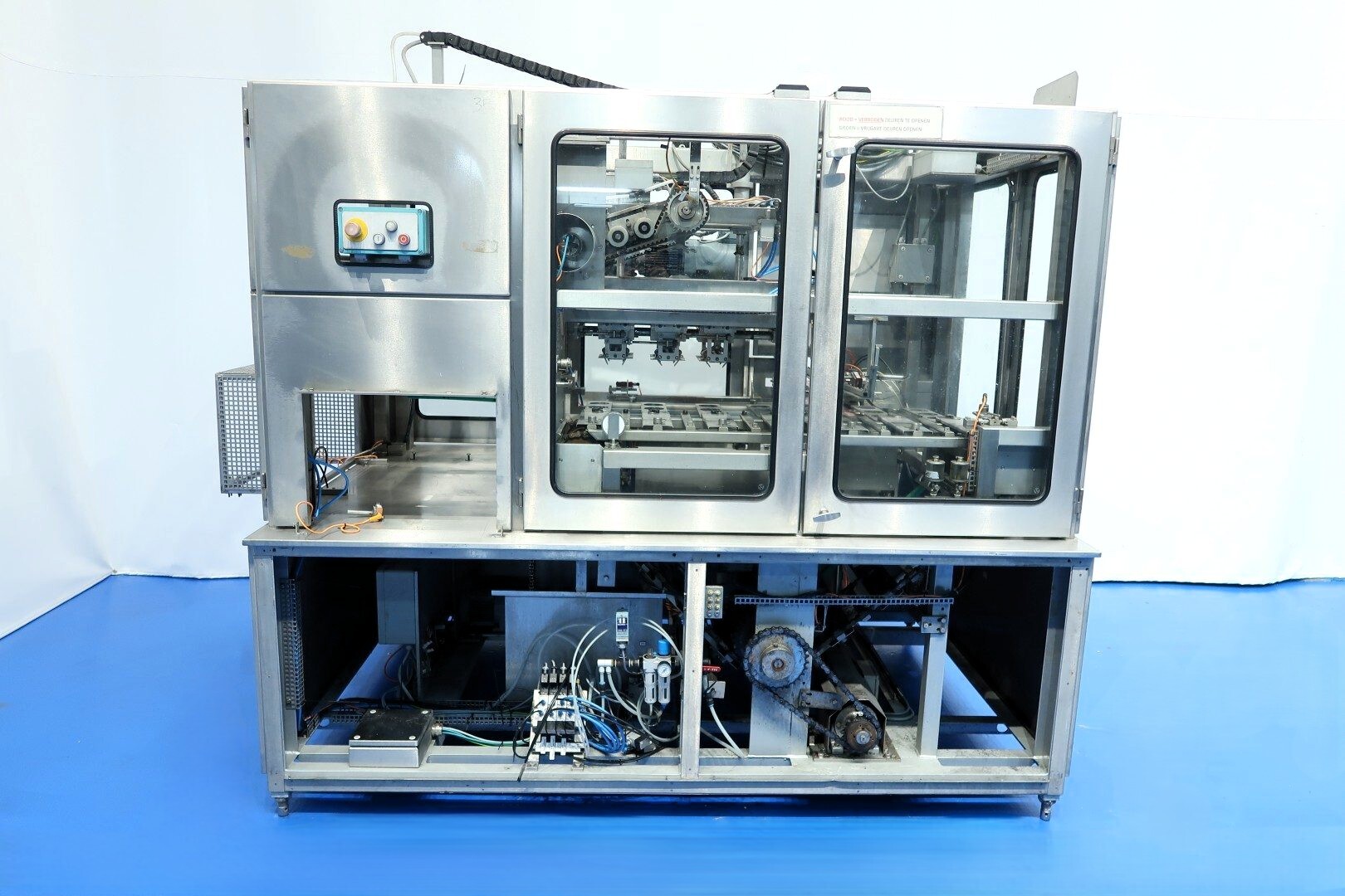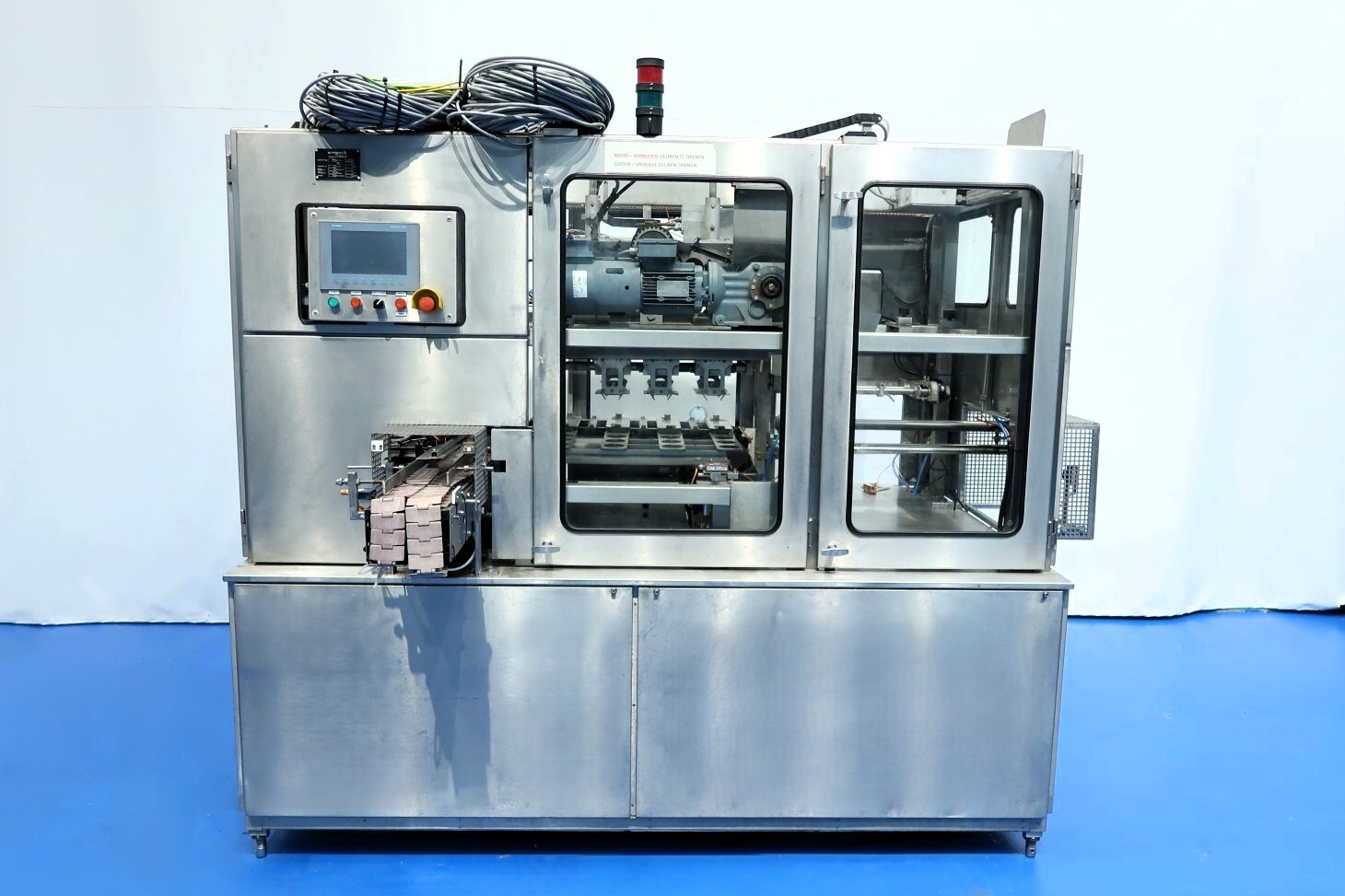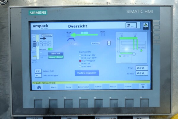 Ampack Ammann ASGP 4 ASS 1: De volledig automatische tray-packer is ontworpen voor ronde cups met een diameter van 116 mm, verpakt in een 3×2 configuratie van 6 cups per tray. De huidige tray-afmetingen zijn ca. 250 × 360 mm. De machine wordt aangedreven door een 3 kW motor (50 Hz) en vereist perslucht van 14 Nm³/h – 7 bar. De besturing geschiedt via Siemens Simatic S7-1500 en kan worden gecombineerd met de originele Ampack KF1/3 vulmachine (ook beschikbaar als STN15964). Deze robuuste en efficiënte packer biedt betrouwbaar en kwalitatief hoogstaand tray-packing voor diverse productielijnen.
