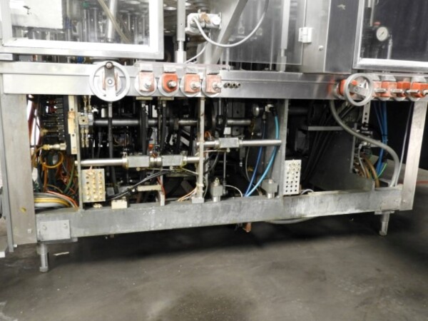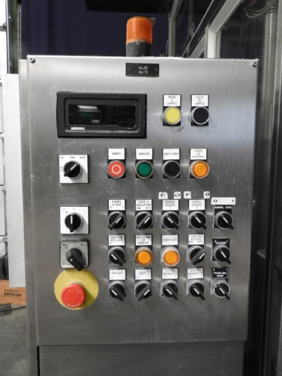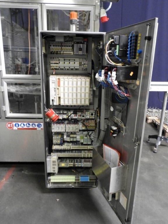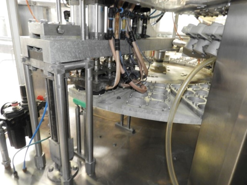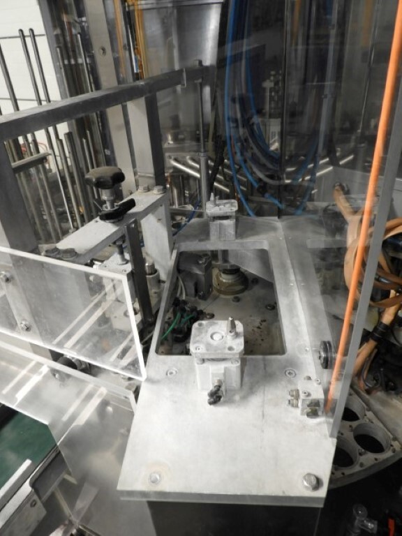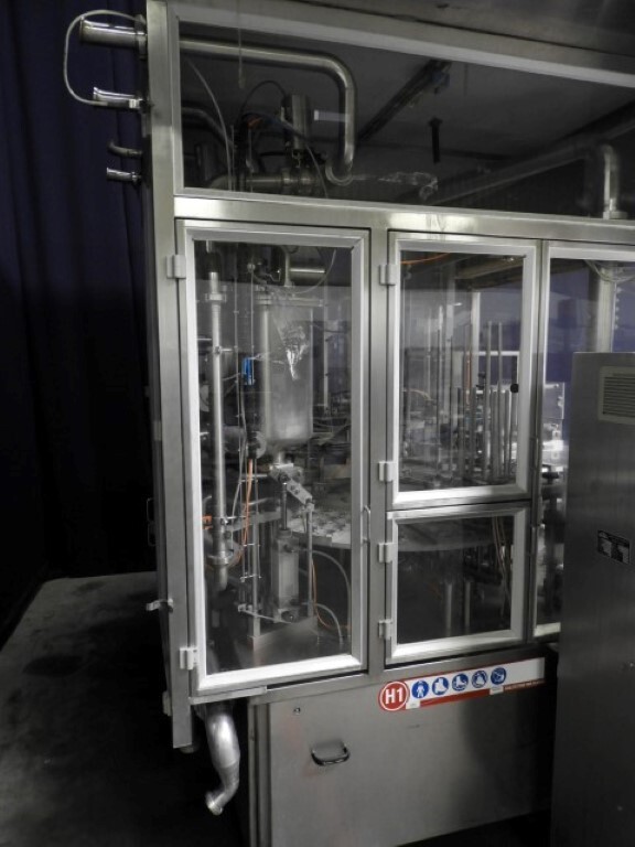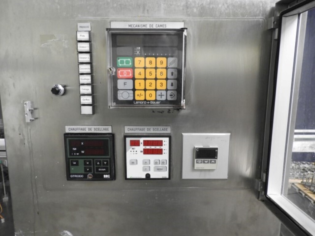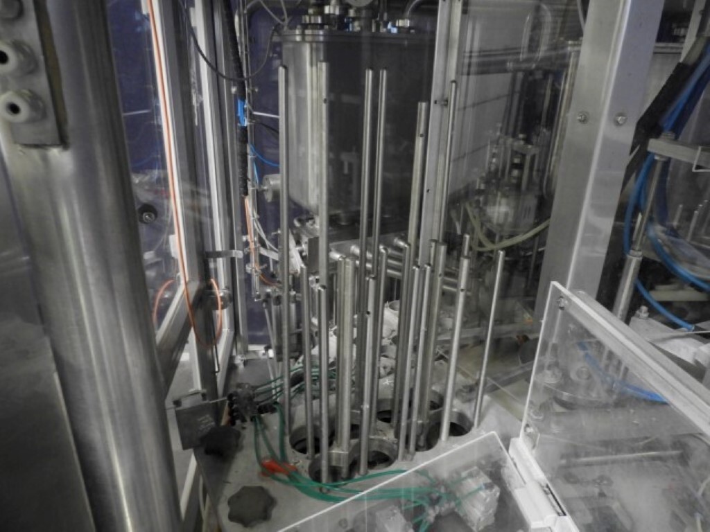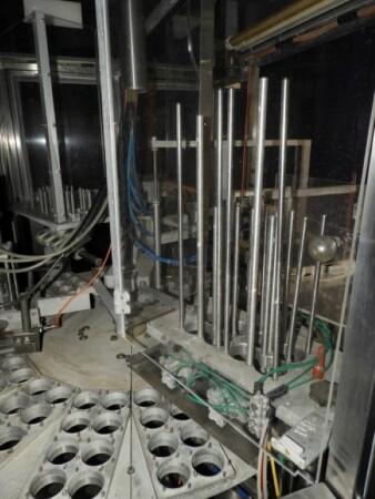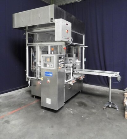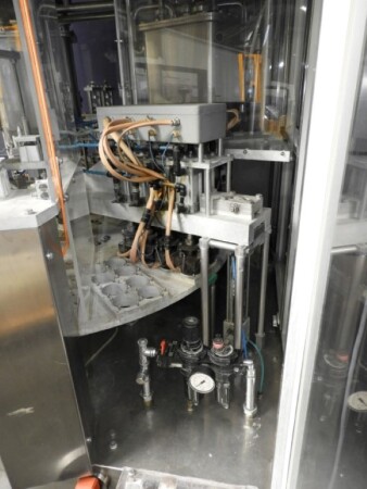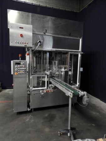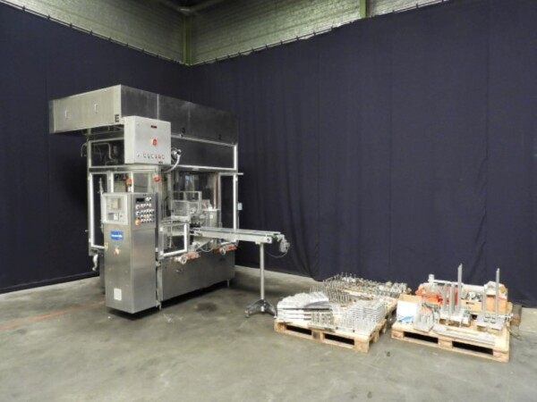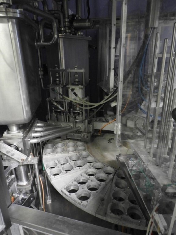 producten tegelijkertijd af te vullen. De machine werkt automatisch als volgt: beker ontstapelen, `geen beker` detectie door fotocel, piston doseurs met trechter (CIP-reinigbaar) en beker lichters, seal opleg door vacuüm, heat sealen, datumcodeerder door stempel kussen en uitvoer transporteur. Machine heeft plexiglas veiligheidsdeuren en is een schone uitvoering met een Hepa steriel luchtsysteem. Eenvoudig formaat te wijzigen (draaitabel in 4 delen). Besturing: Siemens, model: S5 en cam corder HMI. Documentatie in Franse en Duitse taal beschikbaar.