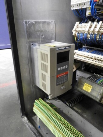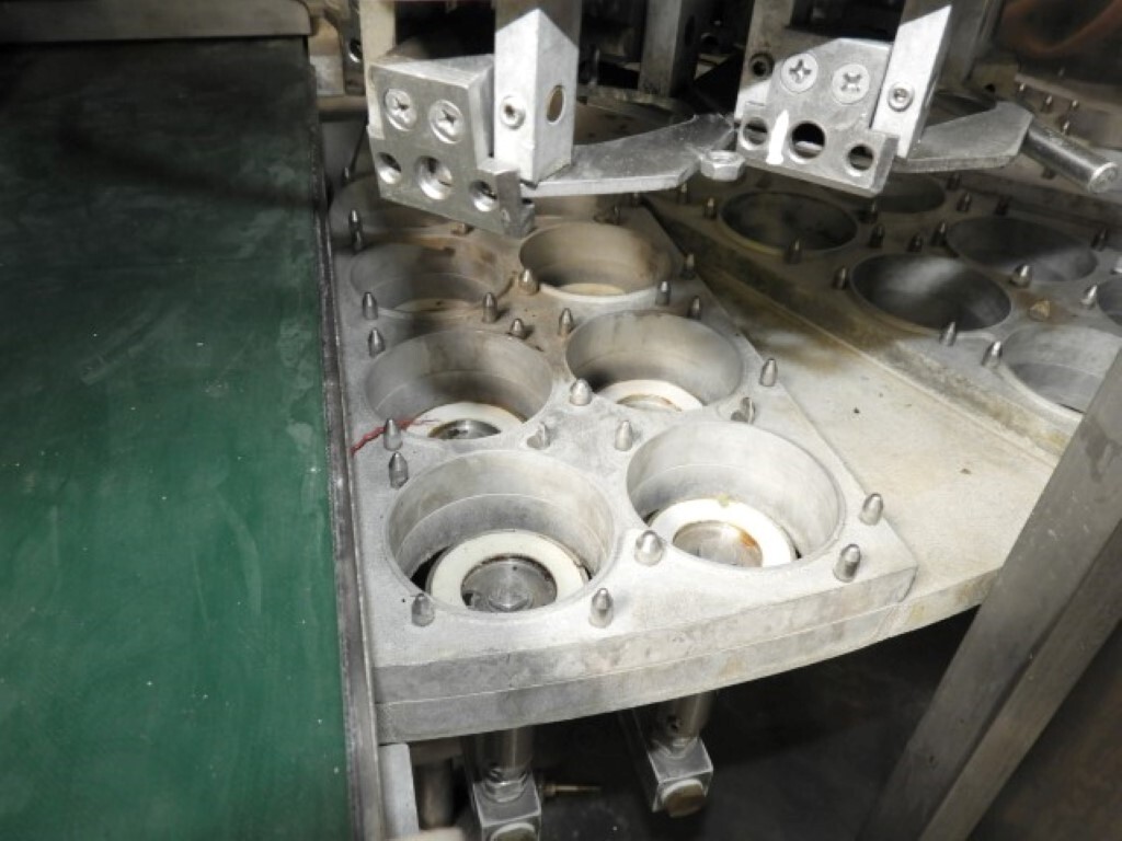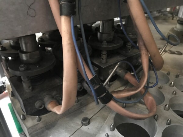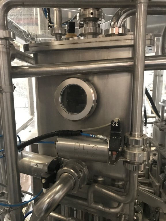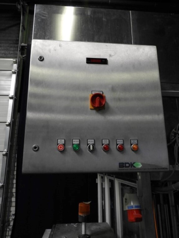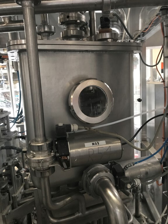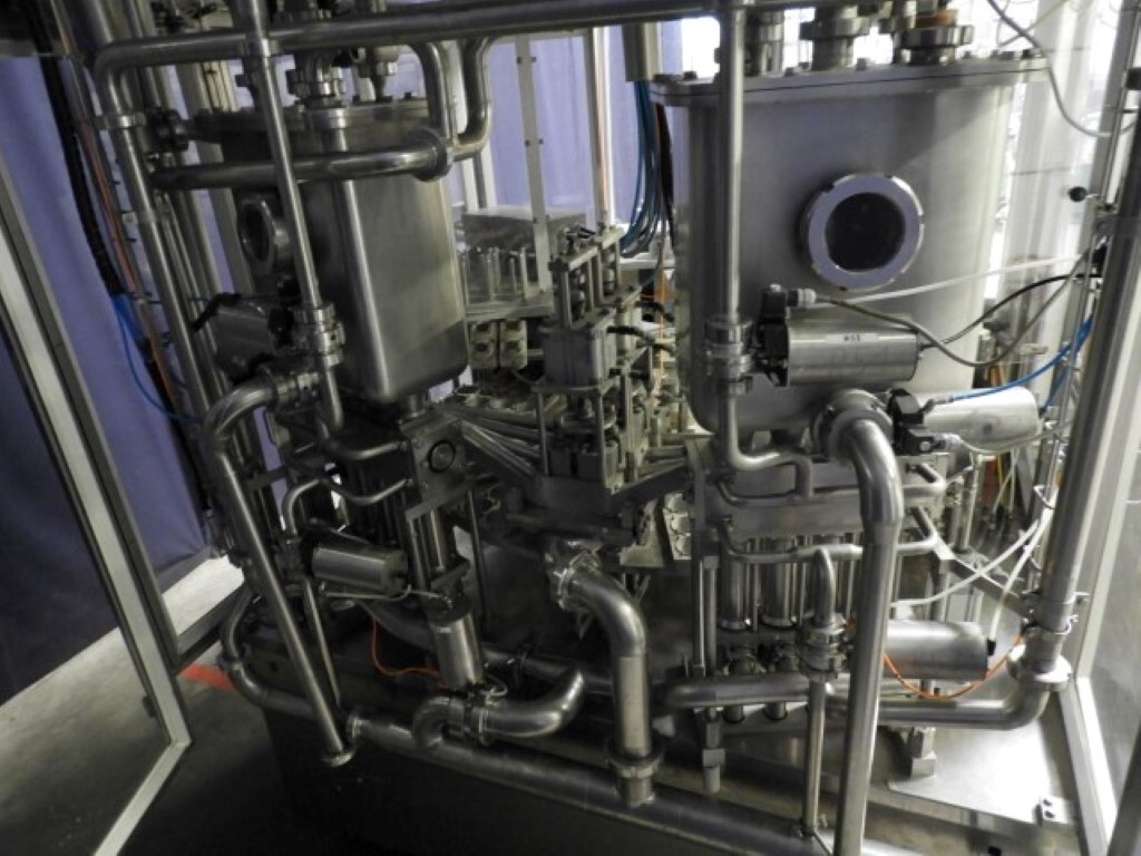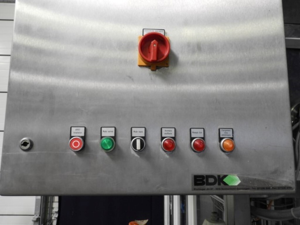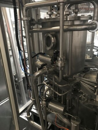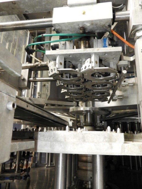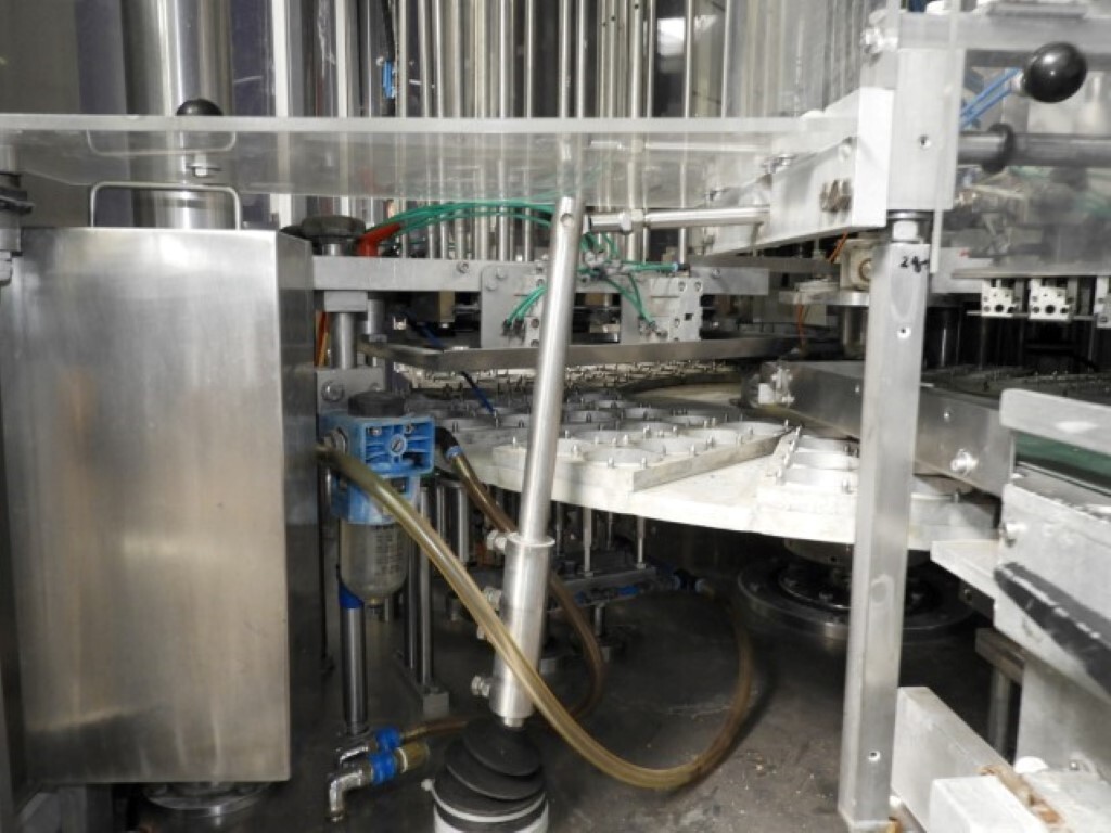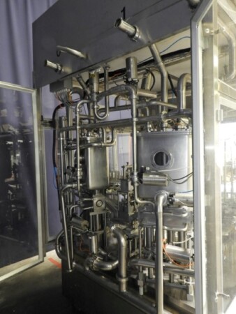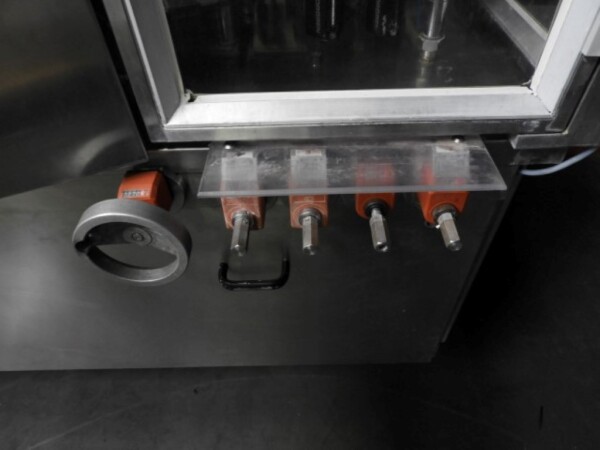 producten tegelijkertijd af te vullen. De machine werkt automatisch als volgt: beker ontstapelen, `geen beker` detectie door fotocel, piston doseurs met trechter (CIP-reinigbaar) en beker lichters, seal opleg door vacuüm, heat sealen, datumcodeerder door stempel kussen en uitvoer transporteur. Machine heeft plexiglas veiligheidsdeuren en is een schone uitvoering met een Hepa steriel luchtsysteem. Eenvoudig formaat te wijzigen (draaitabel in 4 delen). Besturing: Siemens, model: S5 en cam corder HMI. Documentatie in Franse en Duitse taal beschikbaar.