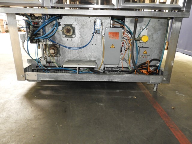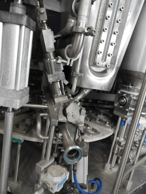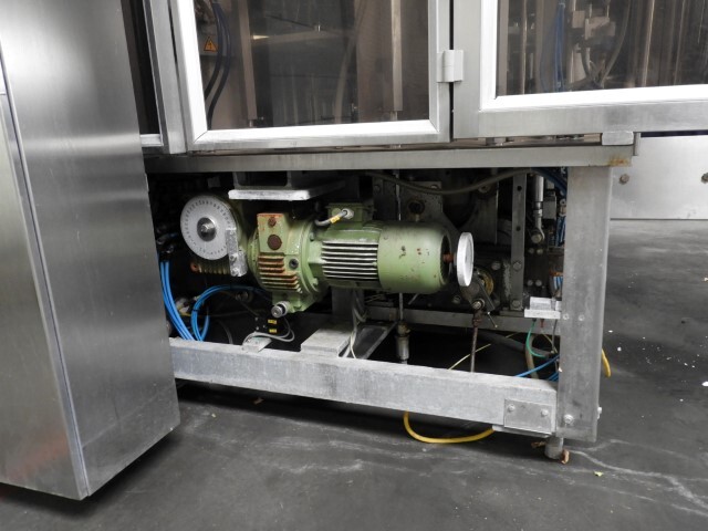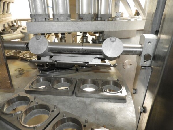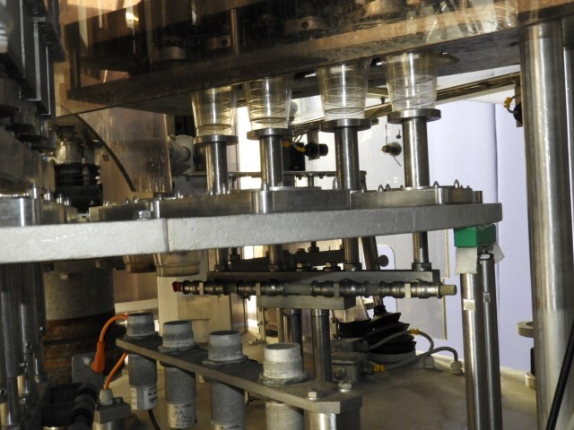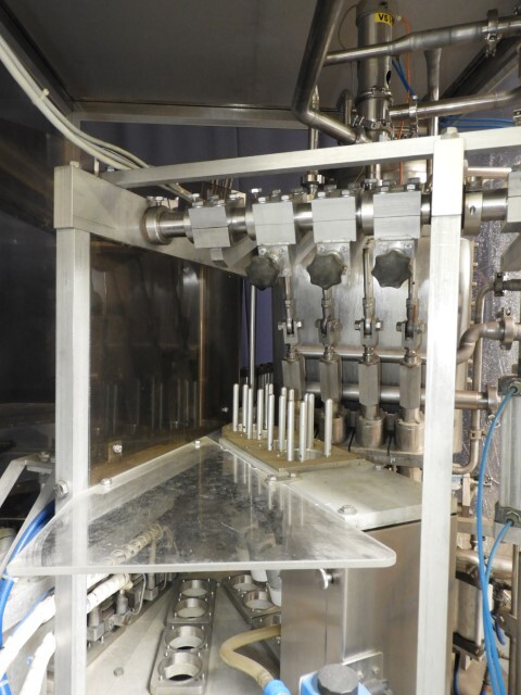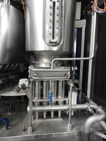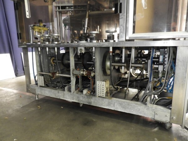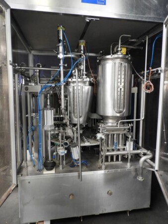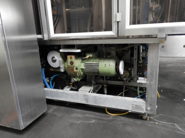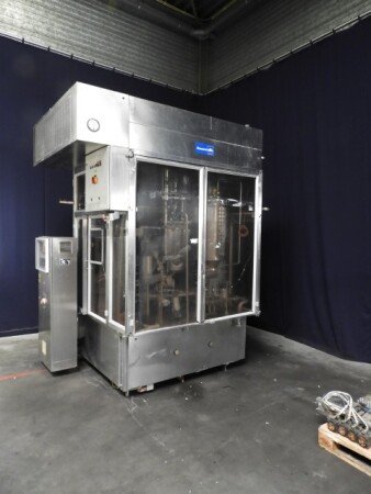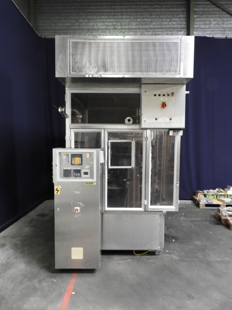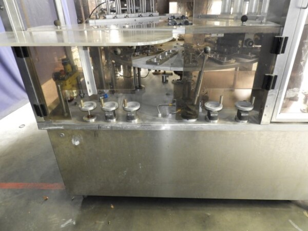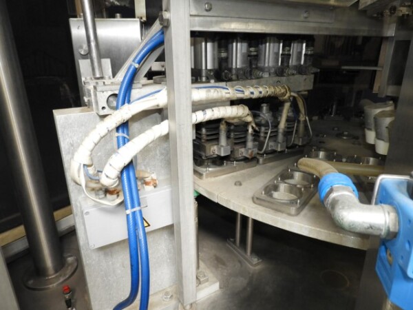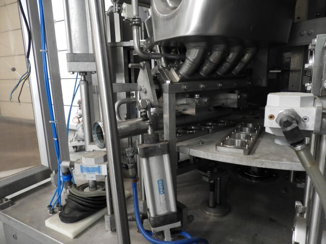 Roterende 4-kops vulmachine gebruikt voor dessertproducten. 3 formaten. Stations: beker ontstapelen, geen beker detectie door fotocel, piston hoofddoseur (+/- 100 - 250 ml) met bekerheffing tijdens het vullen en geïsoleerde trechter voor hete vulling, na doseur met geïsoleerde vultrechter voor een topping, doseurs CIP reinigbaar, , seal opleggen door vacuüm, heatsealen, datumcodeerder door embossing van inkt. Uitvoerband ontbreekt. Machine heeft plexiglas veiligheidsvoorzieningen. De machine bevindt zich in een schone configuratie met een hepa steriel luchtsysteem. Eenvoudig formaat te wijzigen (draaitafel in 4 delen). Besturing: Telemecanique, model: TSX47 en cam corder HMI. Documentatie beschikbaar.