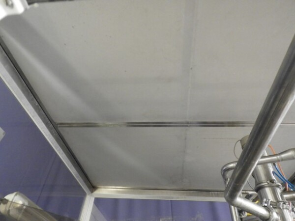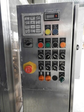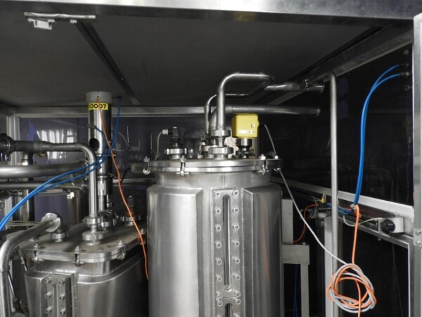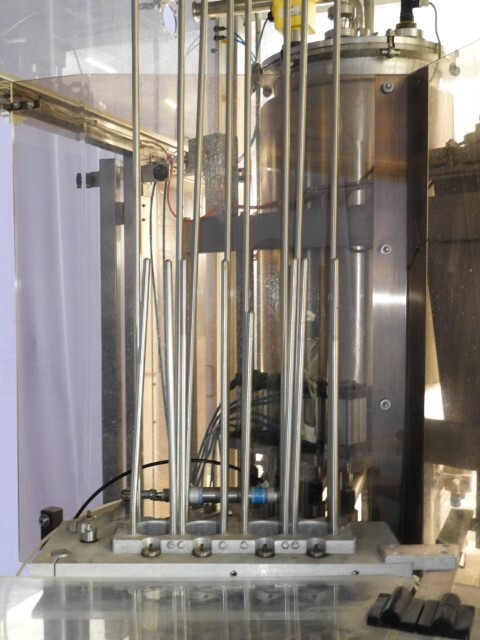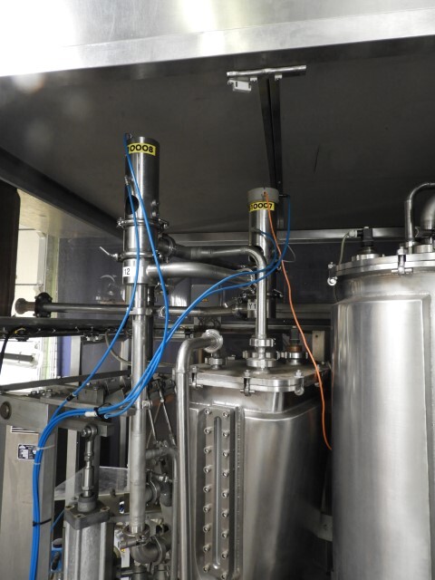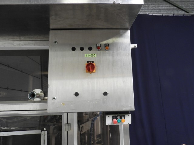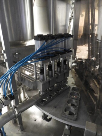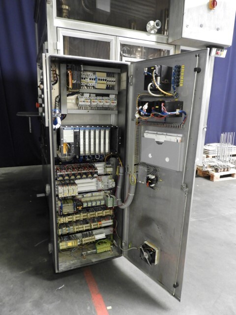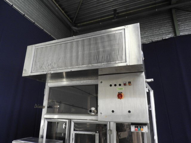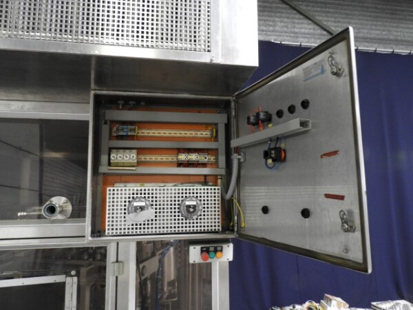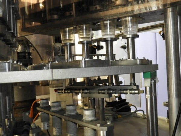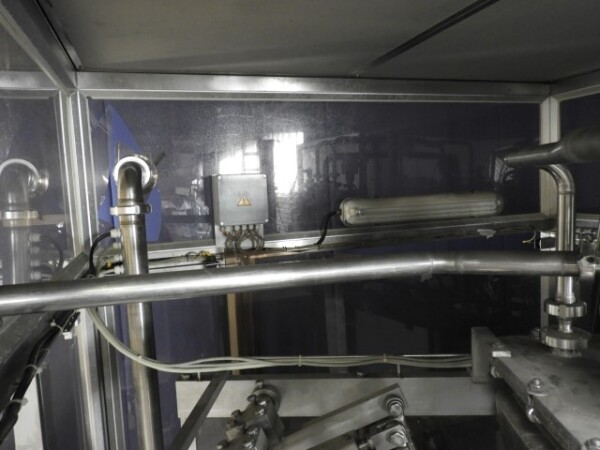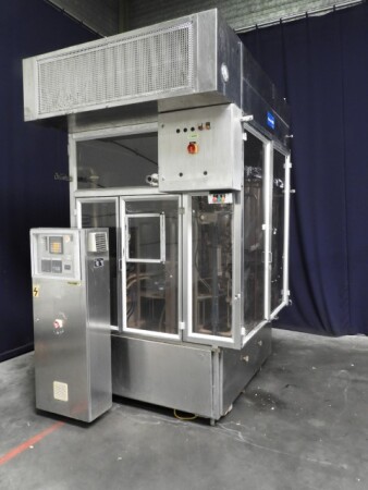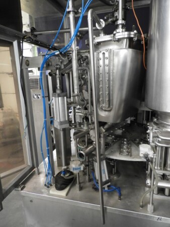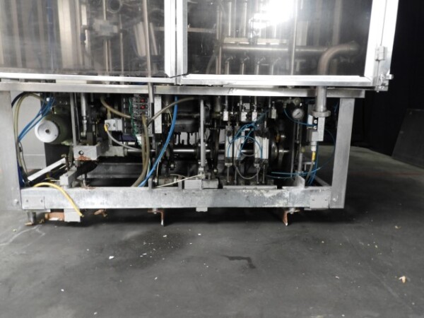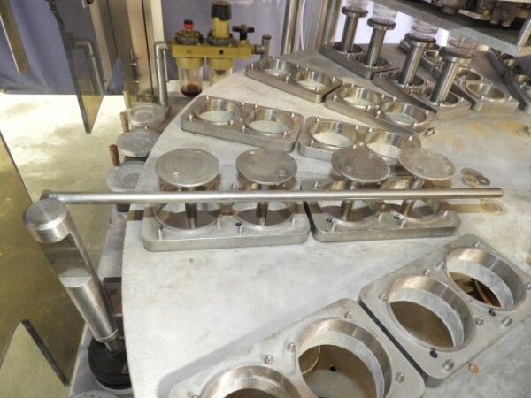 Roterende 4-kops vulmachine gebruikt voor dessertproducten. 3 formaten. Stations: beker ontstapelen, geen beker detectie door fotocel, piston hoofddoseur (+/- 100 - 250 ml) met bekerheffing tijdens het vullen en geïsoleerde trechter voor hete vulling, na doseur met geïsoleerde vultrechter voor een topping, doseurs CIP reinigbaar, , seal opleggen door vacuüm, heatsealen, datumcodeerder door embossing van inkt. Uitvoerband ontbreekt. Machine heeft plexiglas veiligheidsvoorzieningen. De machine bevindt zich in een schone configuratie met een hepa steriel luchtsysteem. Eenvoudig formaat te wijzigen (draaitafel in 4 delen). Besturing: Telemecanique, model: TSX47 en cam corder HMI. Documentatie beschikbaar.