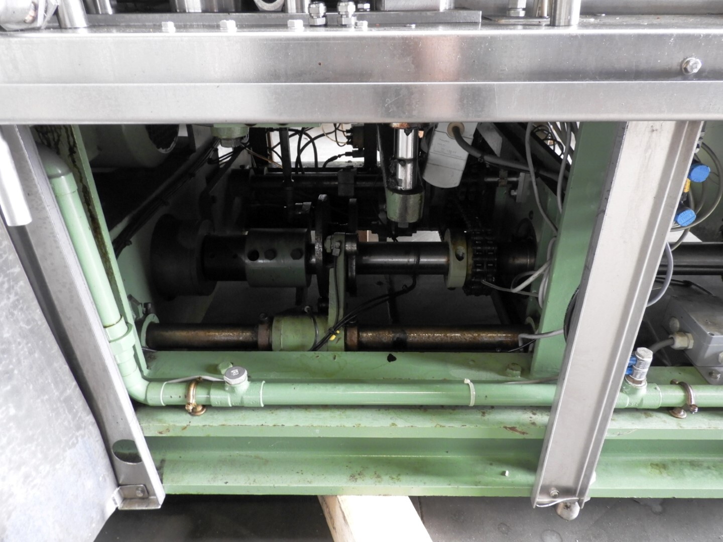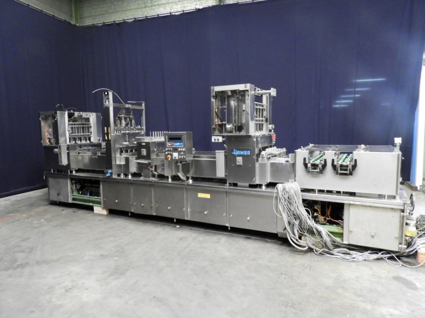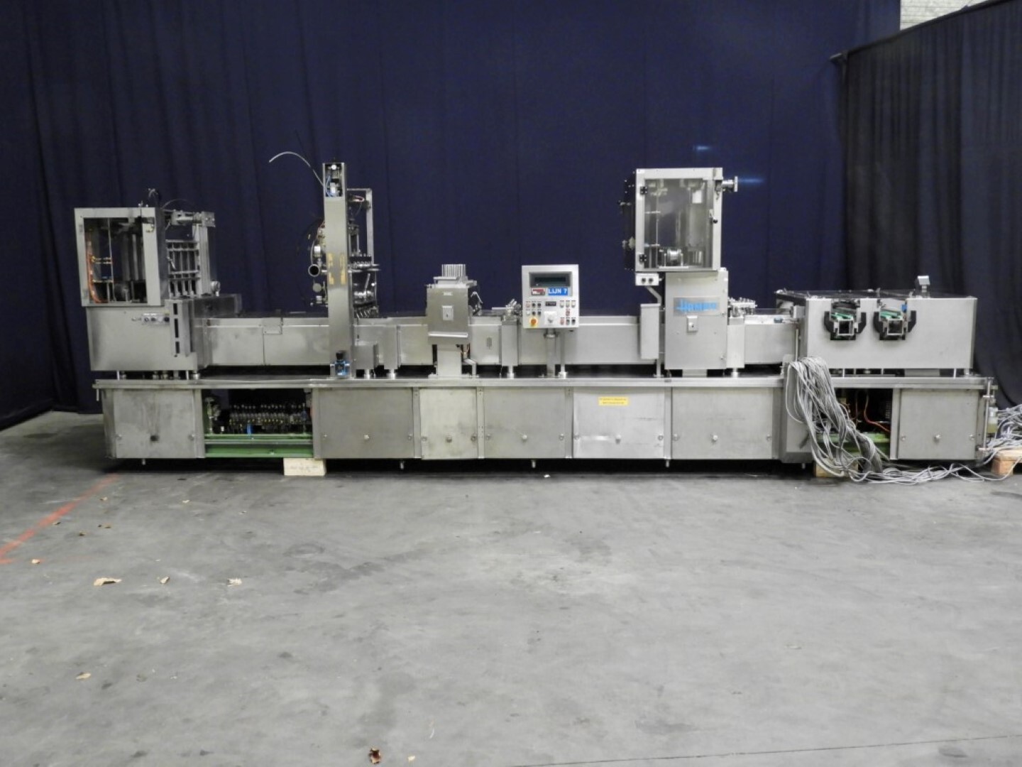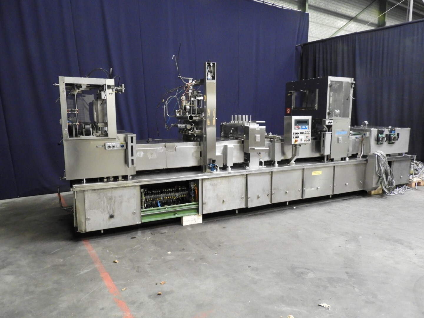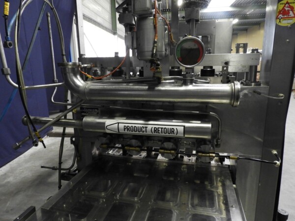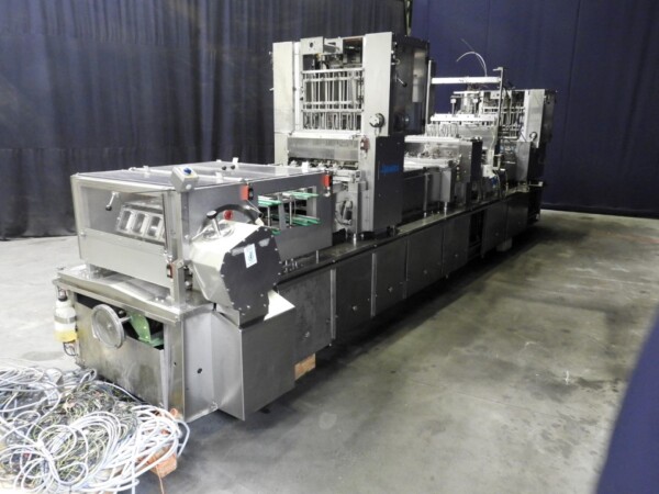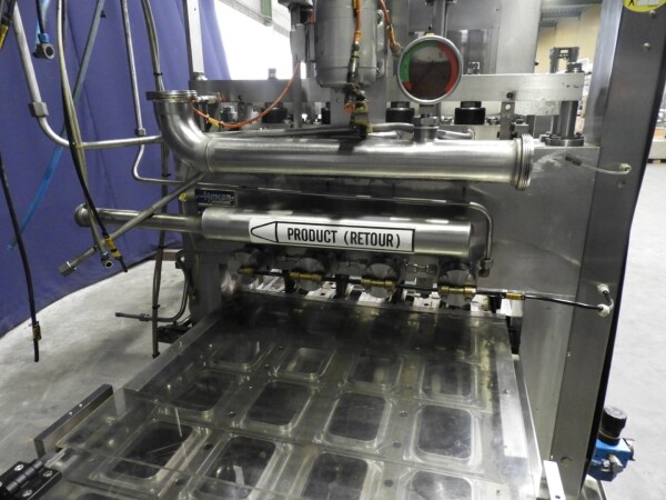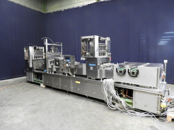 4 banen liniaire bekervuller met 4 vulkoppen voor margarine / halvarine / boter. De kopjes bevinden zich in de lengte richting van de machine. Stations: ontstapeling van de beker met automatisch bekertoevoersysteem, detectie van geen en dubbele bekers, hoofddoser (200-300 ml) voor margarine / boter / halvarine-producten met directe verbinding, verscherving van tussenlegvel door vacuüm (voorgevormde tussenelegvel papieren), na duwstation, druk- op deksel met automatisch dekselinvoersysteem en uitvoer door dubbele rijstrook loodrecht op de machine zonder transportband. Machine heeft plexiglasbeschermers en heeft een centraal smeersysteem. Exclusief bedieningspaneel. Geen documentatie beschikbaar.