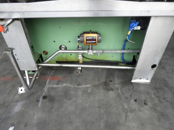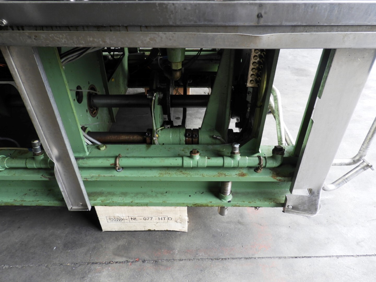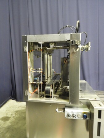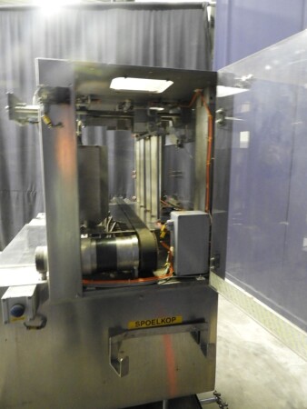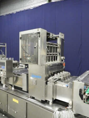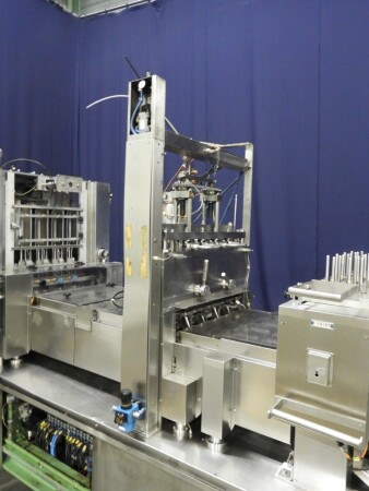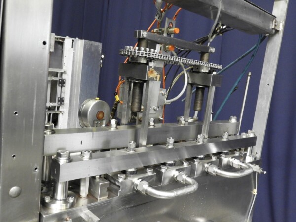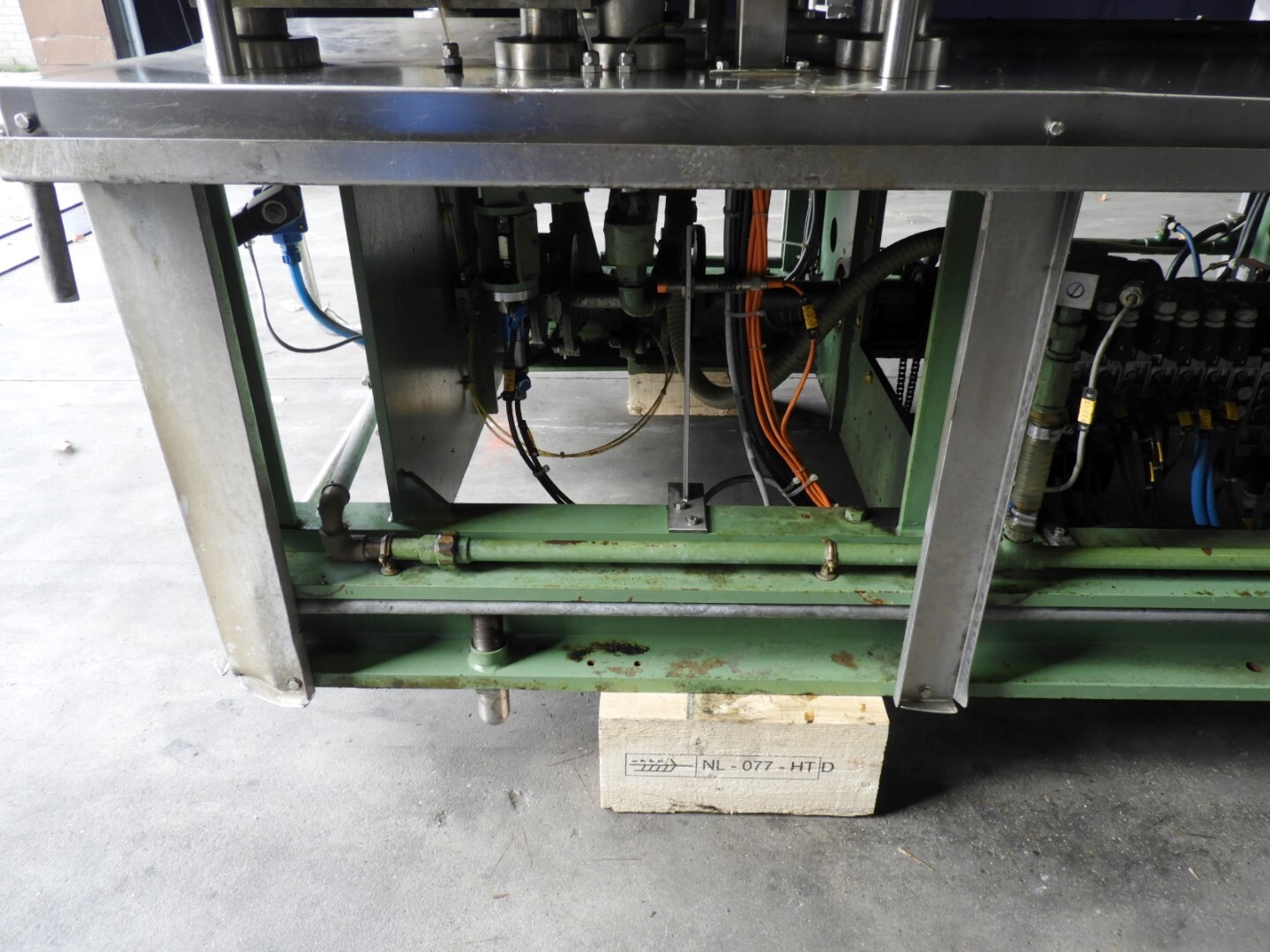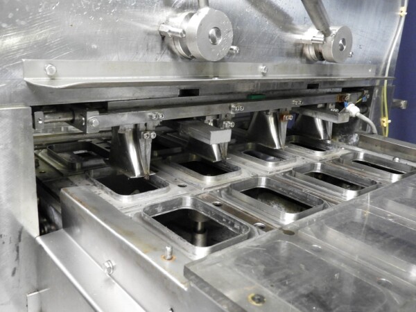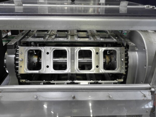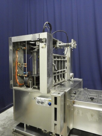 4 banen liniaire bekervuller met 4 vulkoppen voor margarine / halvarine / boter. De kopjes bevinden zich in de lengte richting van de machine. Stations: ontstapeling van de beker met automatisch bekertoevoersysteem, detectie van geen en dubbele bekers, hoofddoser (200-300 ml) voor margarine / boter / halvarine-producten met directe verbinding, verscherving van tussenlegvel door vacuüm (voorgevormde tussenelegvel papieren), na duwstation, druk- op deksel met automatisch dekselinvoersysteem en uitvoer door dubbele rijstrook loodrecht op de machine zonder transportband. Machine heeft plexiglasbeschermers en heeft een centraal smeersysteem. Exclusief bedieningspaneel. Geen documentatie beschikbaar.