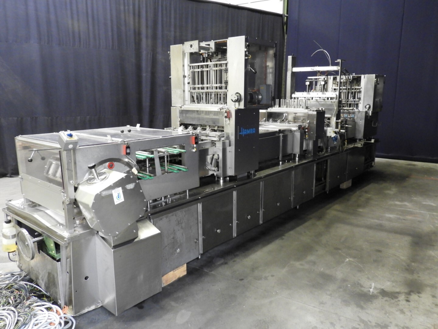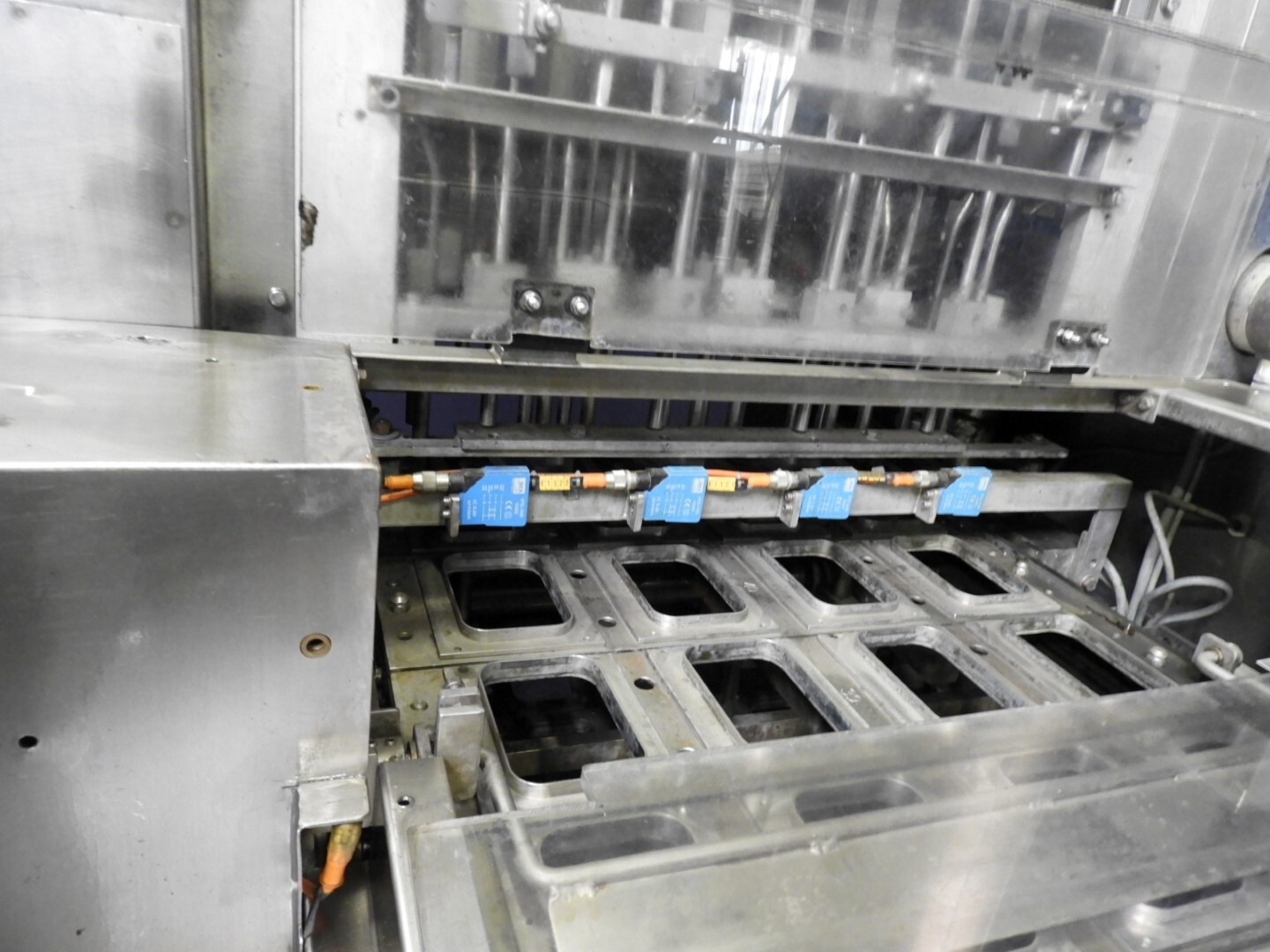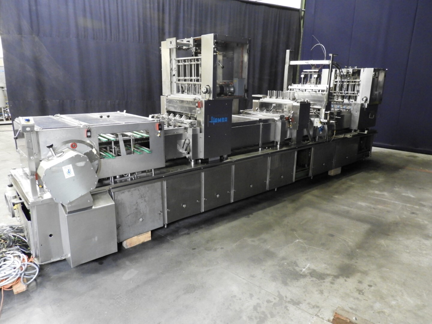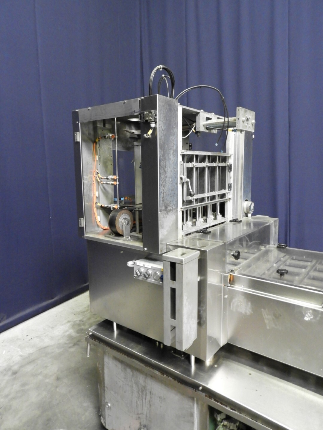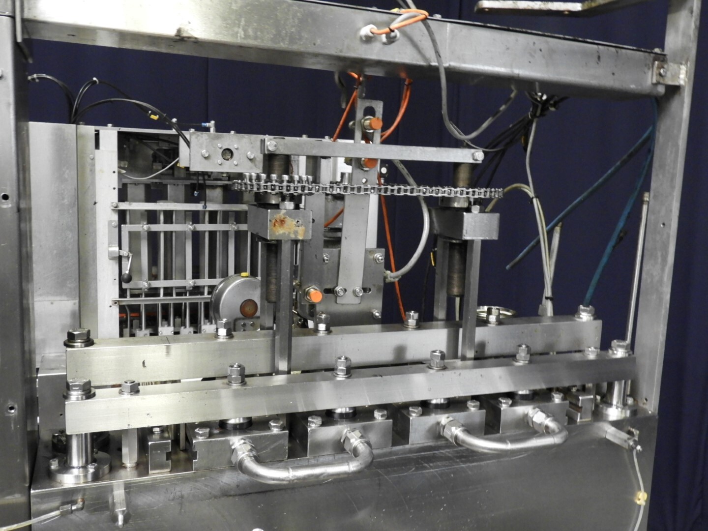 4 banen liniaire bekervuller met 4 vulkoppen voor margarine / halvarine / boter. De kopjes bevinden zich in de lengte richting van de machine. Stations: ontstapeling van de beker met automatisch bekertoevoersysteem, detectie van geen en dubbele bekers, hoofddoser (200-300 ml) voor margarine / boter / halvarine-producten met directe verbinding, verscherving van tussenlegvel door vacuüm (voorgevormde tussenelegvel papieren), na duwstation, druk- op deksel met automatisch dekselinvoersysteem en uitvoer door dubbele rijstrook loodrecht op de machine zonder transportband. Machine heeft plexiglasbeschermers en heeft een centraal smeersysteem. Exclusief bedieningspaneel. Geen documentatie beschikbaar.