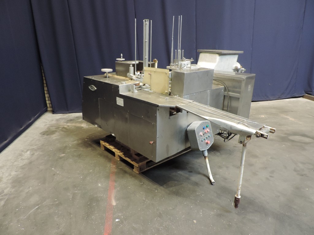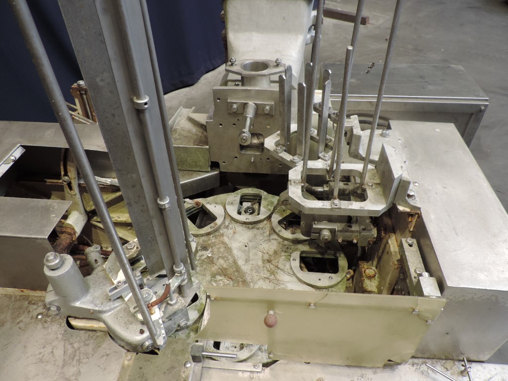 Incomplete rotary filler with 1-head for viscose products like butter or margarine. Cup size rectangular: 115 x 75 mm. Stations: cup destacking, incomplete main piston doser for viscose products (stainless steel house, volume: ± 250 ml), interleave paper dispending by vacuum, snap-on lid and outfeed on +/- 1,5 meter single lane outfeed conveyor. Feeding by aluminium through and augers. Controls: relay control. Documentation available.