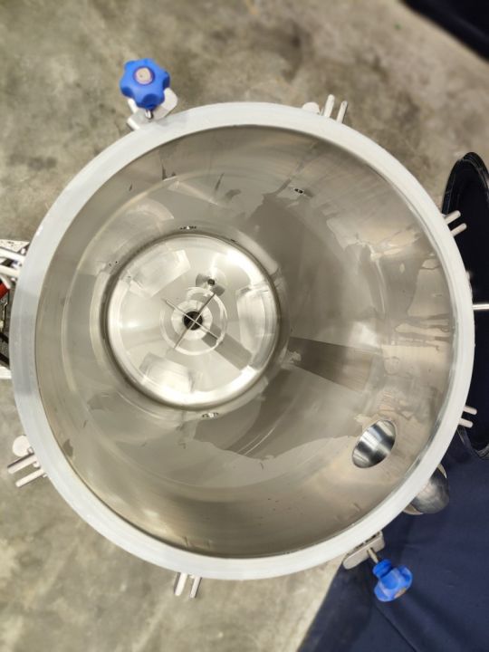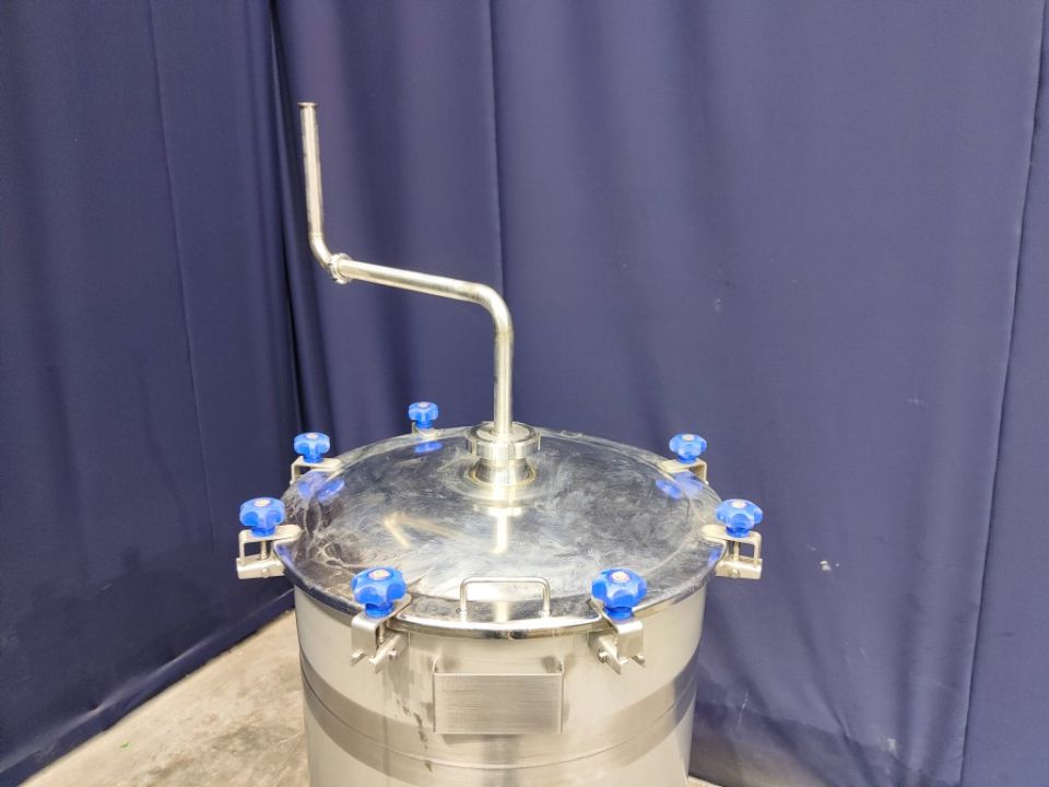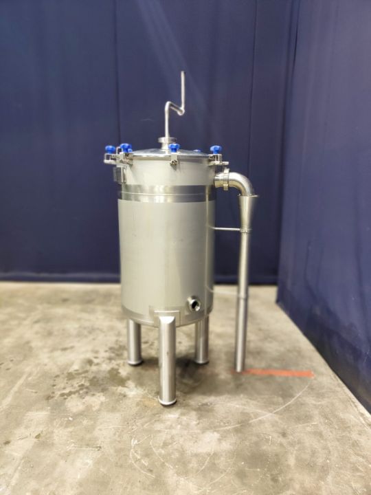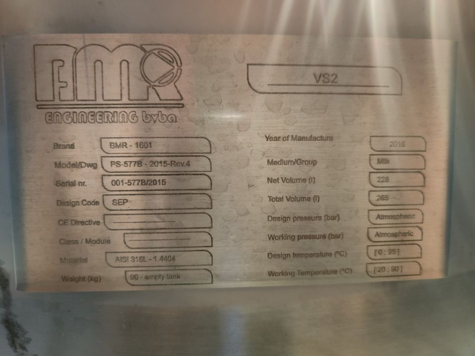 Balance tank. Open top with cover. Pressure in tank atmospheric. Overflow pipe. 3 legs. Total dimensions: 105 x 90 x 210 cm.