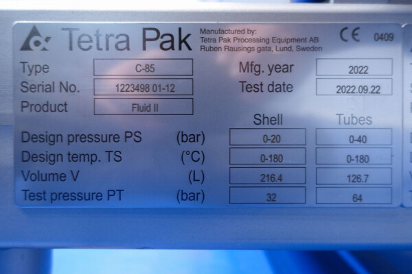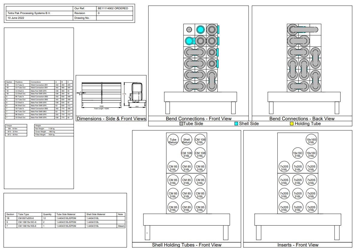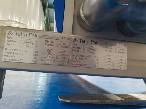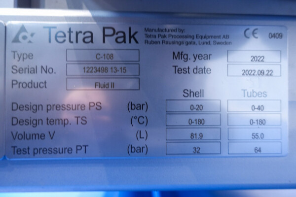 Totale capaciteit 48,78 m². Lasverbindingen product: Ø 51 en Ø 63 mm, verbindingen product: Ø 63 en Ø 76 mm SMS, inclusief bochten. Materiaal buizen: RVS 316. Gemonteerd op een roestvrijstalen frame. Mantelzijde: Circ. water/Water/Torenwater/Warm water. Verschillende thermische cycli, berekeningen beschikbaar (op aanvraag). Aanbevolen CIP-flow: 15.400 liter/uur. Voor beide typen CM85 en CM108 is een inbedrijfstelling set (met gereedschap) en een reserve-onderdelenset beschikbaar.