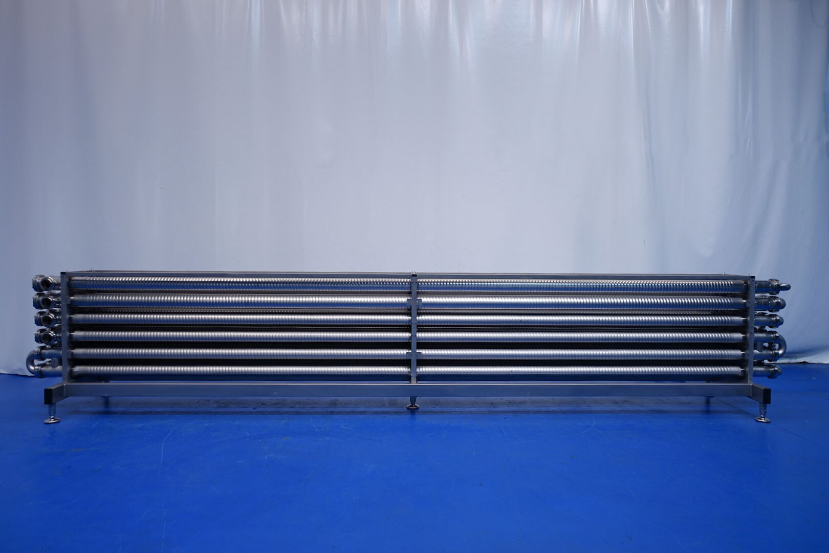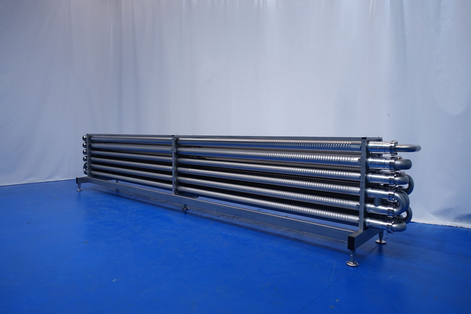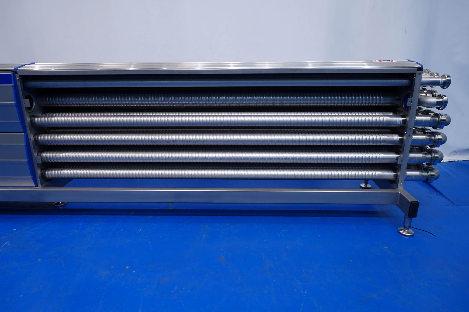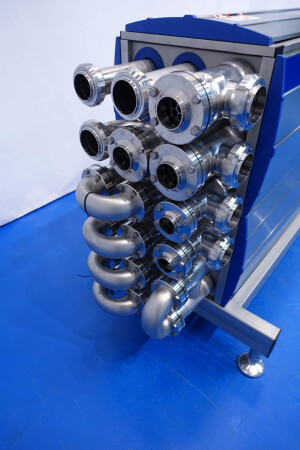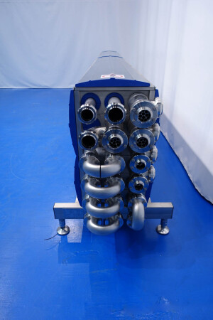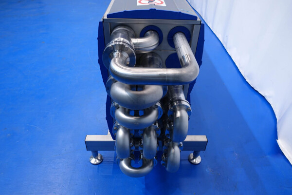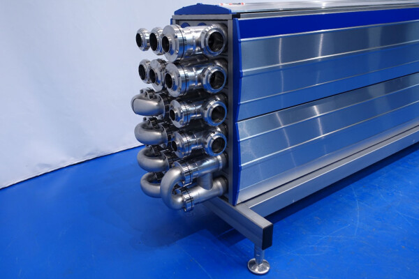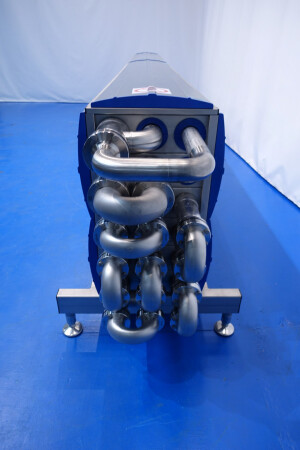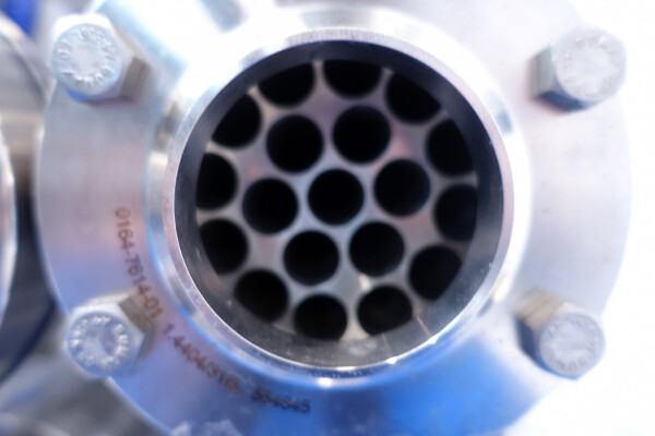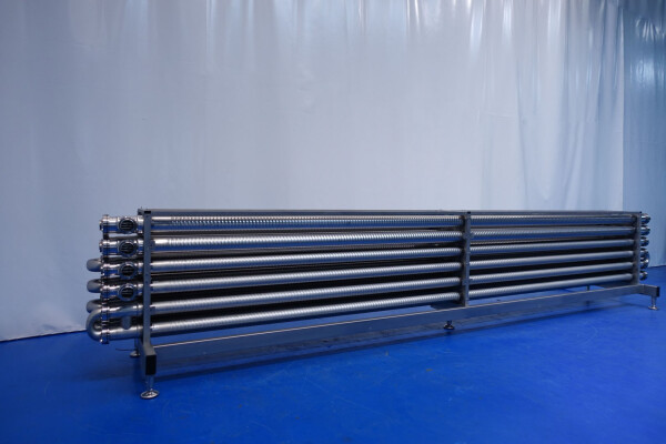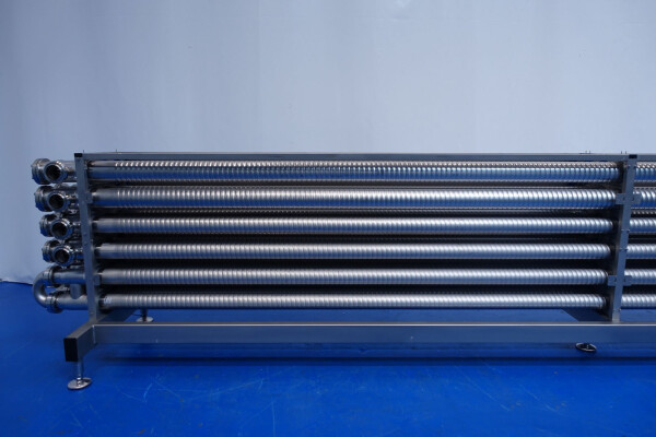 Gloednieuwe (nooit gebruikte) buizenwarmtewisselaar, sanitair (THE). Multitube voor thermische behandeling van de meeste vloeibare producten. Totaal 15 buizen (geribbeld). Configuratie in 2 secties: