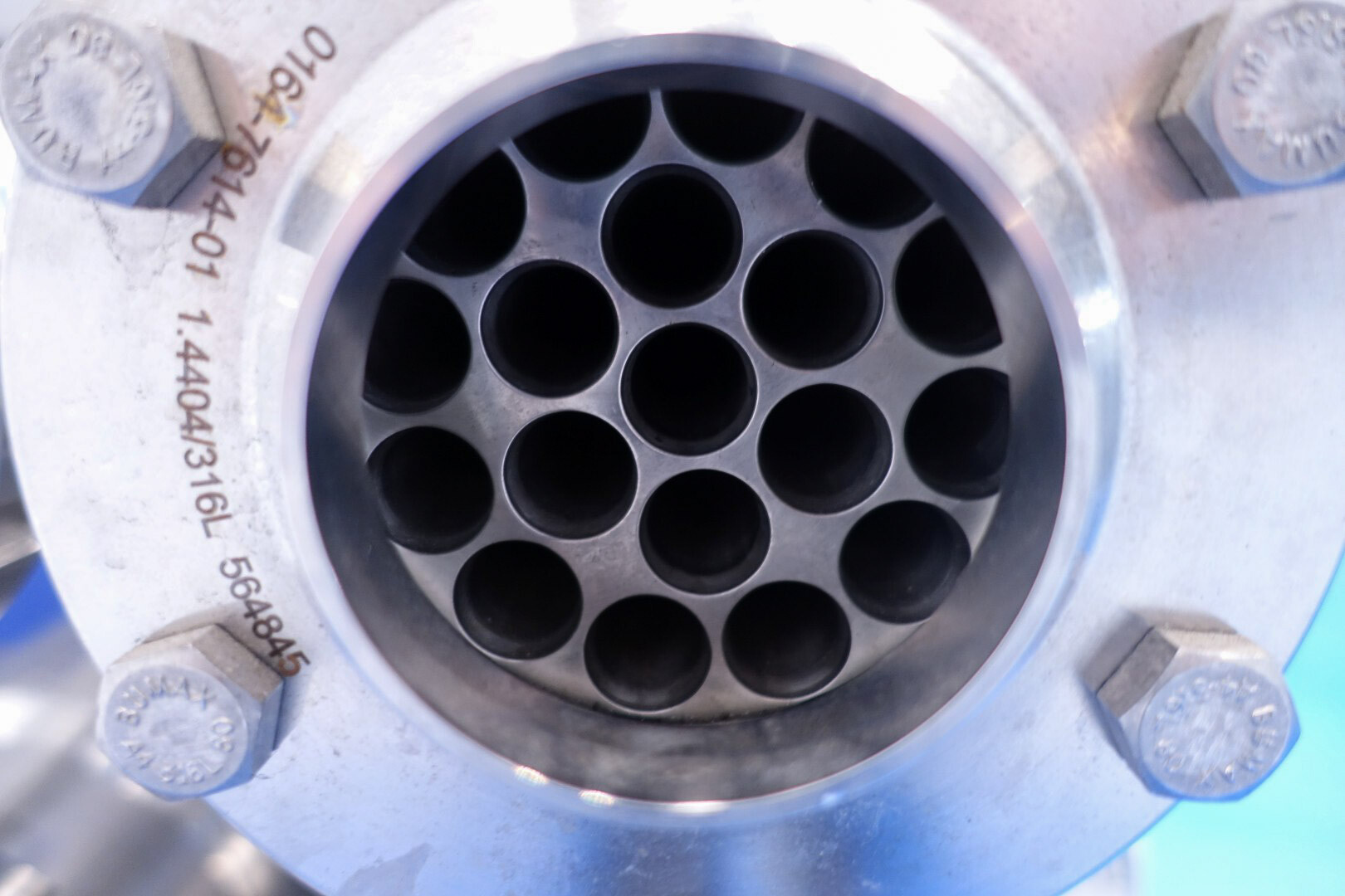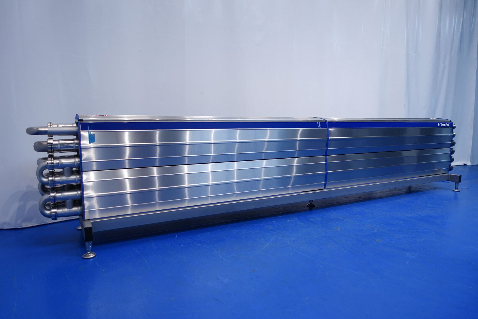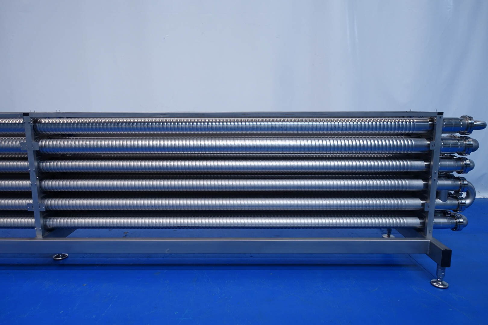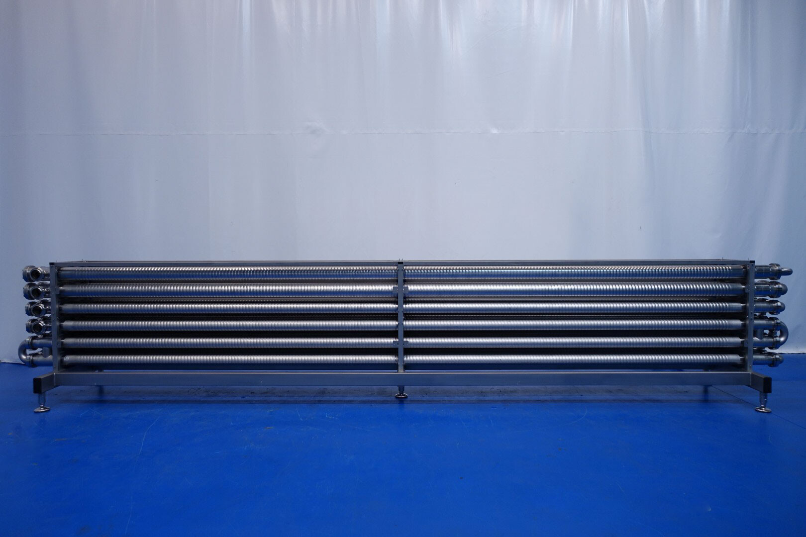 Gloednieuwe (nooit gebruikte) buizenwarmtewisselaar, sanitair (THE). Multitube voor thermische behandeling van de meeste vloeibare producten. Totaal 15 buizen (geribbeld). Configuratie in 2 secties: