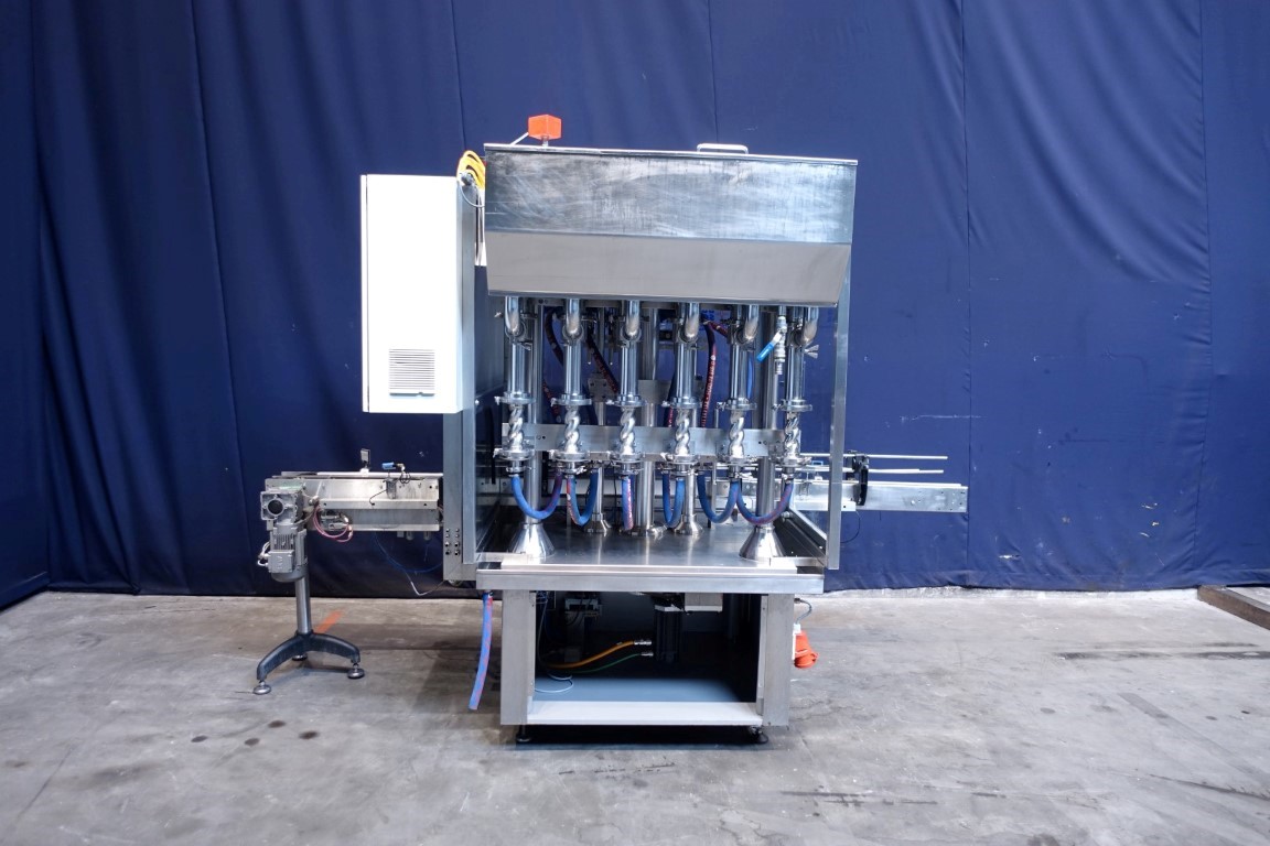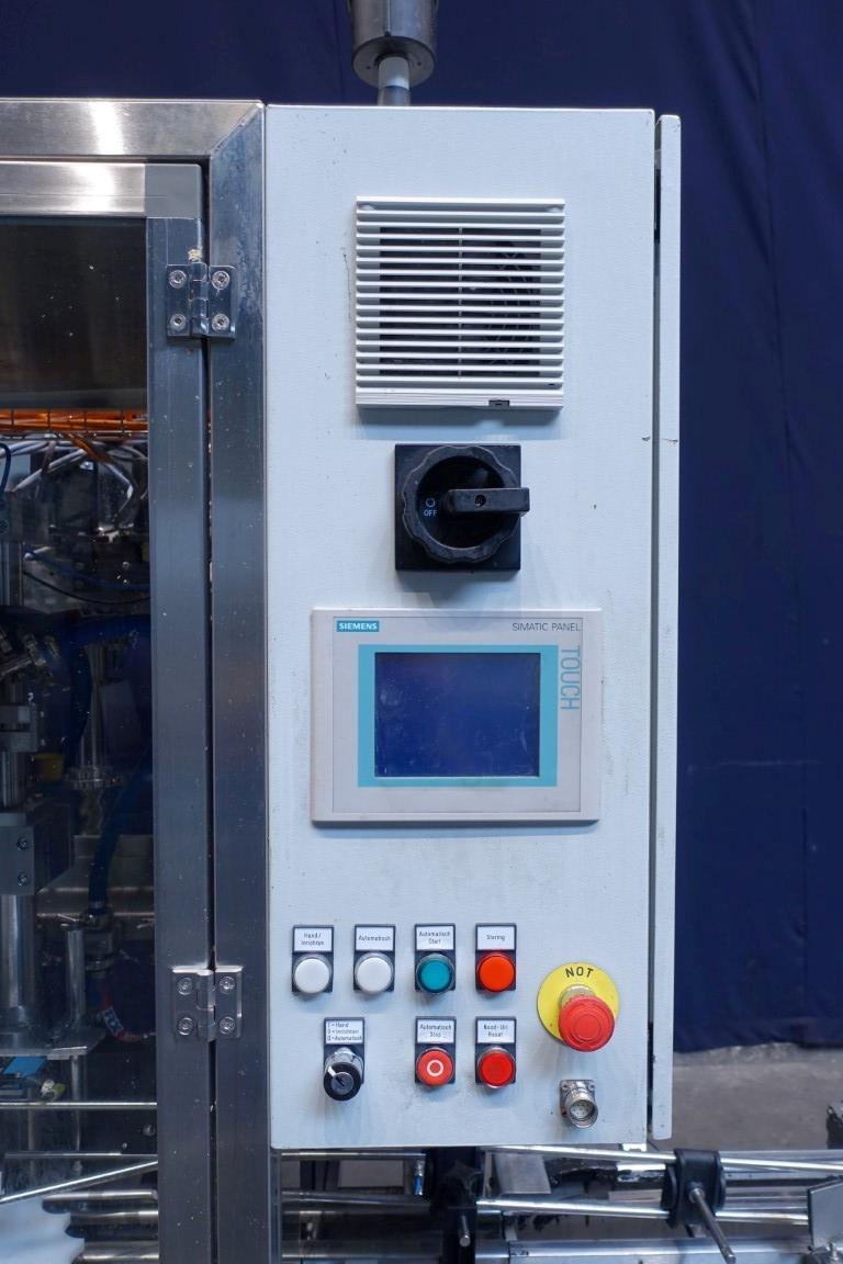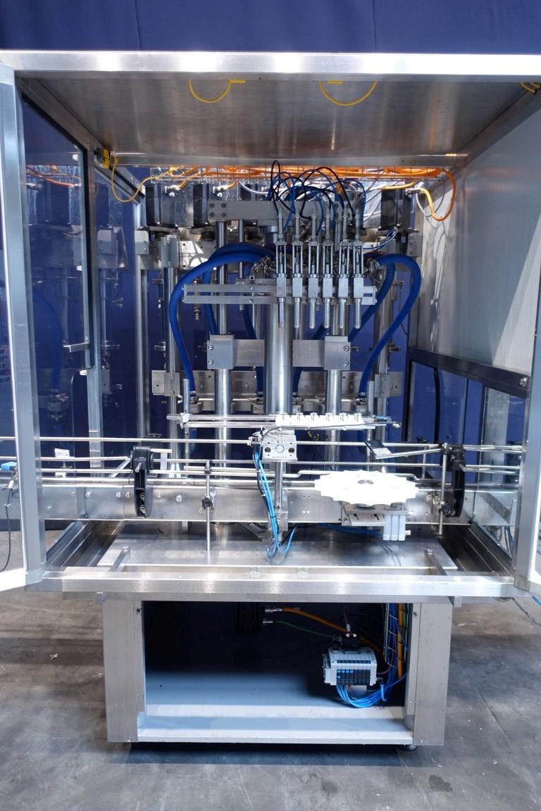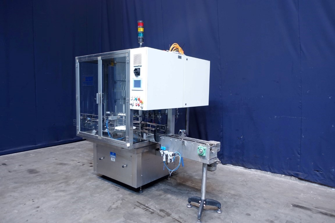 "Fully automatic linear filling machine with stop star for product singularization. The machine was equipped by eccentric screw pumps which are servo driven. By couting the rotations the volume can stepless be set invery volume, CIP cleanable. Currently 2 pumps are dismanled so machine incomplete, valves and cylinders are made of stainless steel. capacity adjustable, depending on the form of the bottles shape, volume, filling height and product Transport conveyor through the machine (belt missing) and guide railing Machine drive frequency drive The pumps have to be fed constantly with the product. Dry running of the pumps can be avoided by means of a reservoir with float command. Machine management Siemens SPS S7, control touch panel OP177B Festo pneumatic valves and cams Basic frame in solid cast-steel-aluminum-construction, lacquered, table sheets and side casing in stainless steel with collecting vat Control device running-in jam control switch and light sensor Machine stop while filling tubes setup Filler switch min./max. running-in jam control switch and light sensor Safety device. All-around covering against accidental intervention into the running machine Panes made of Sekurit safety glass Door protection by end switches Working height 900 mm +/- 50 mm"