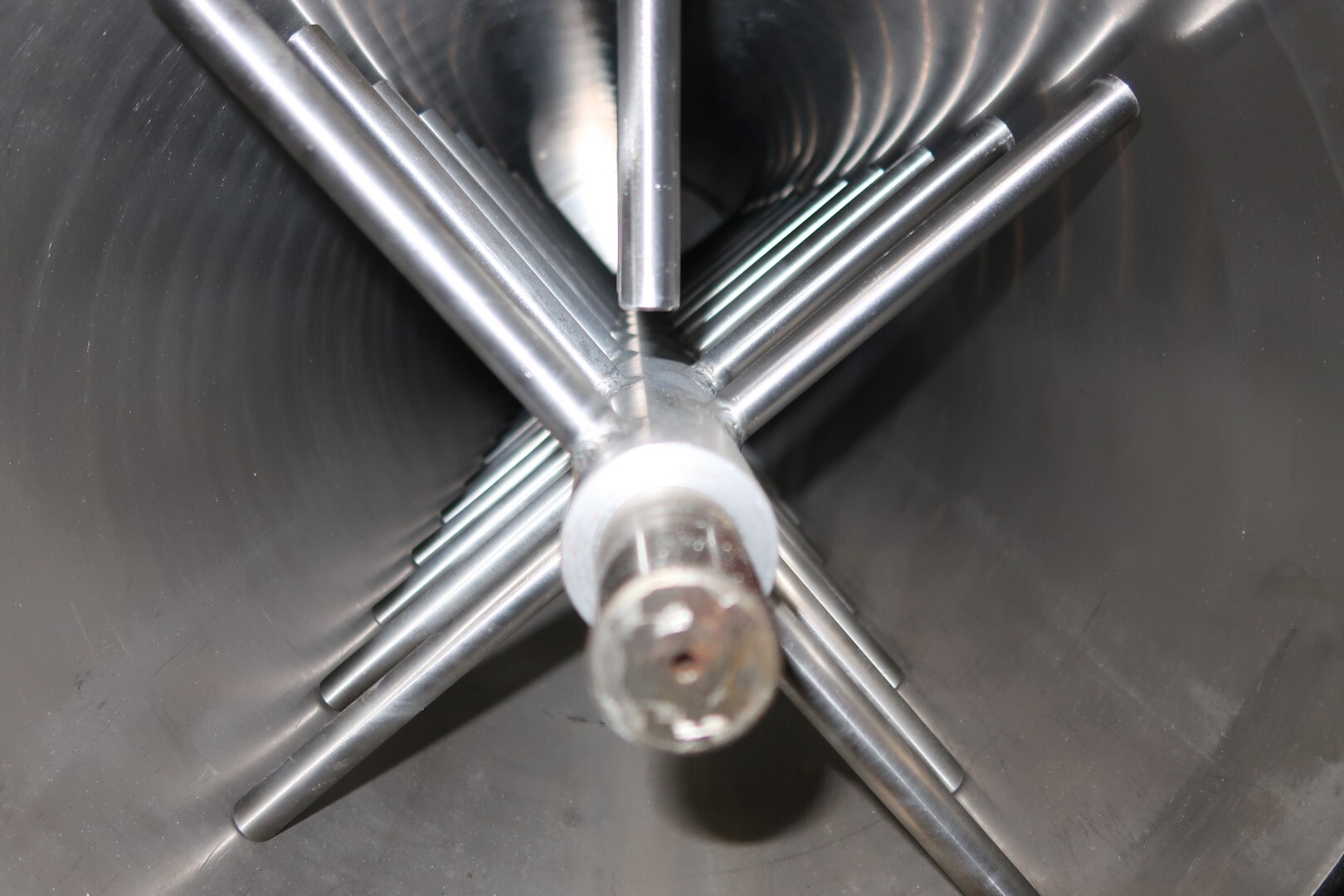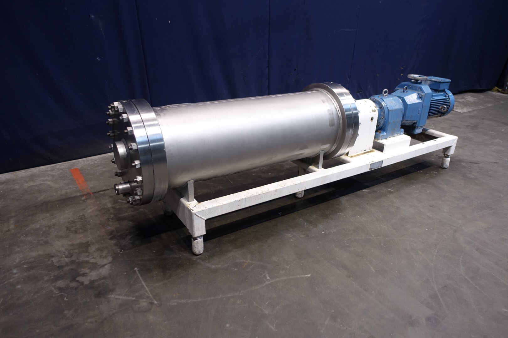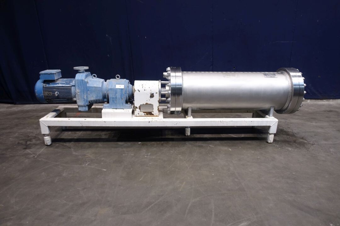 RVS pinmixer op stalen frame met 1 cilinder. Cilinderdiameter 415 mm, lengte 1370 mm. 52 pennen op de as/rotor en 23 pennen op de cilinderbehuizing. Motorvermogen: 22 kW - 40 A - 50 Hz. Met mechanische toerenregelaar: In 410/1.634 rpm - Uit 24/94 rpm - i. 17,43. Aansluitingen In - 58 mm, Uit - 58 mm met schroefdraad. Exclusief bediening en documentatie. Totale afmetingen: 304 x 56 x 86 cm - gewicht: 896 kg