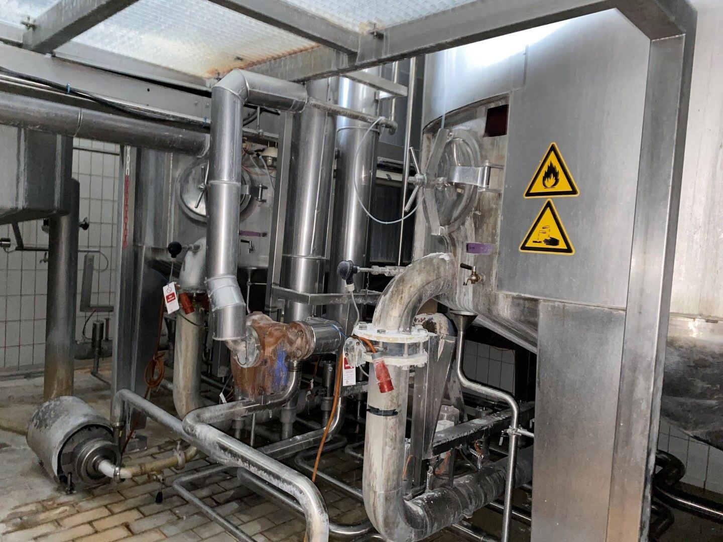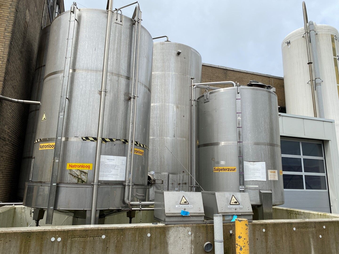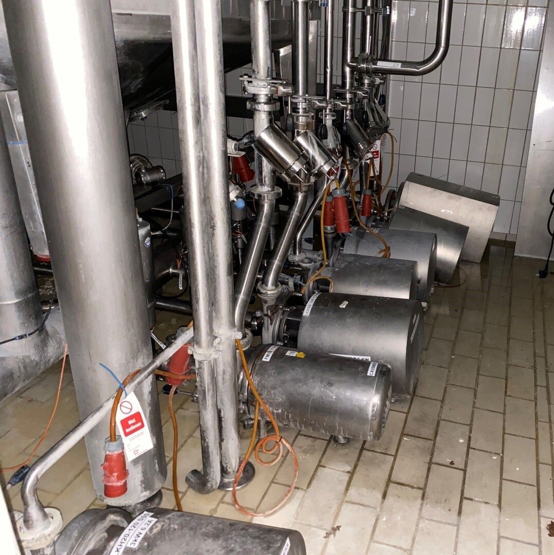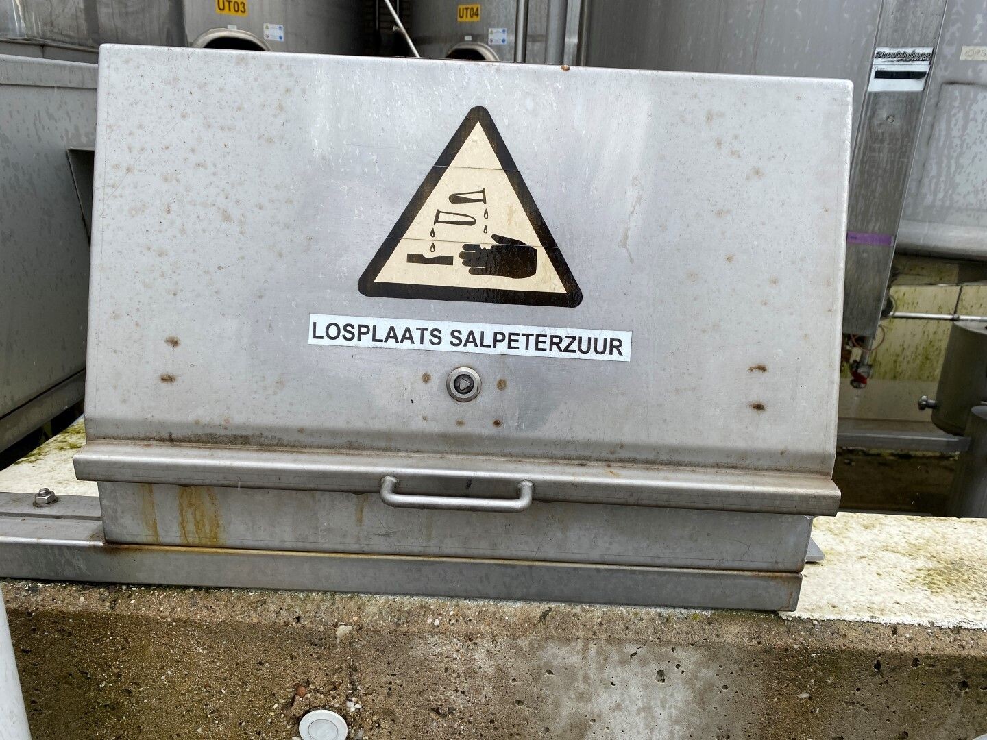 Complete CIP Unit. Bestaande uit: een voorspoel watertank, een loogtank, verwarmd door stoom, inclusief recirculatiepomp. Zuurtank, verwarmd door stoom en inclusief recirculatiepomp. Spoeltank voor schoon water en een water verzameltank. Compleet met al het leidingwerk en ca. 52 kleppen, merk Alfa-Laval model: SRC. Elke tank heeft zijn eigen mangat en kijkglas. Inclusief RVS looprek en trap om de tanks van bovenaf te bekijken. 6 uitgaande leidingen en retourleidingen naar de fabriek, elke leiding heeft zijn eigen pomp (5x 7,5 en 1x 5,5 kW vermogen), merk: Alfa- Laval, model: LKH / FM3. Externe I-O-schakelkast. Optioneel in deze aanbieding: een ontvangst-, opslag- en distributiesysteem voor loog- en zuurconcentraat. Toelichting optioneel systeem: een vrachtwagen brengt het concentraat waarna het in de concentraattank wordt gepompt voor verdere distributie naar de CIP unit of naar andere plaatsen in de fabriek. Bestaande uit een afsluitbare RVS ontvangst box, tank- en verdeelpomp.