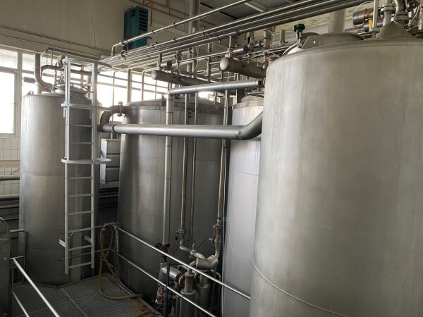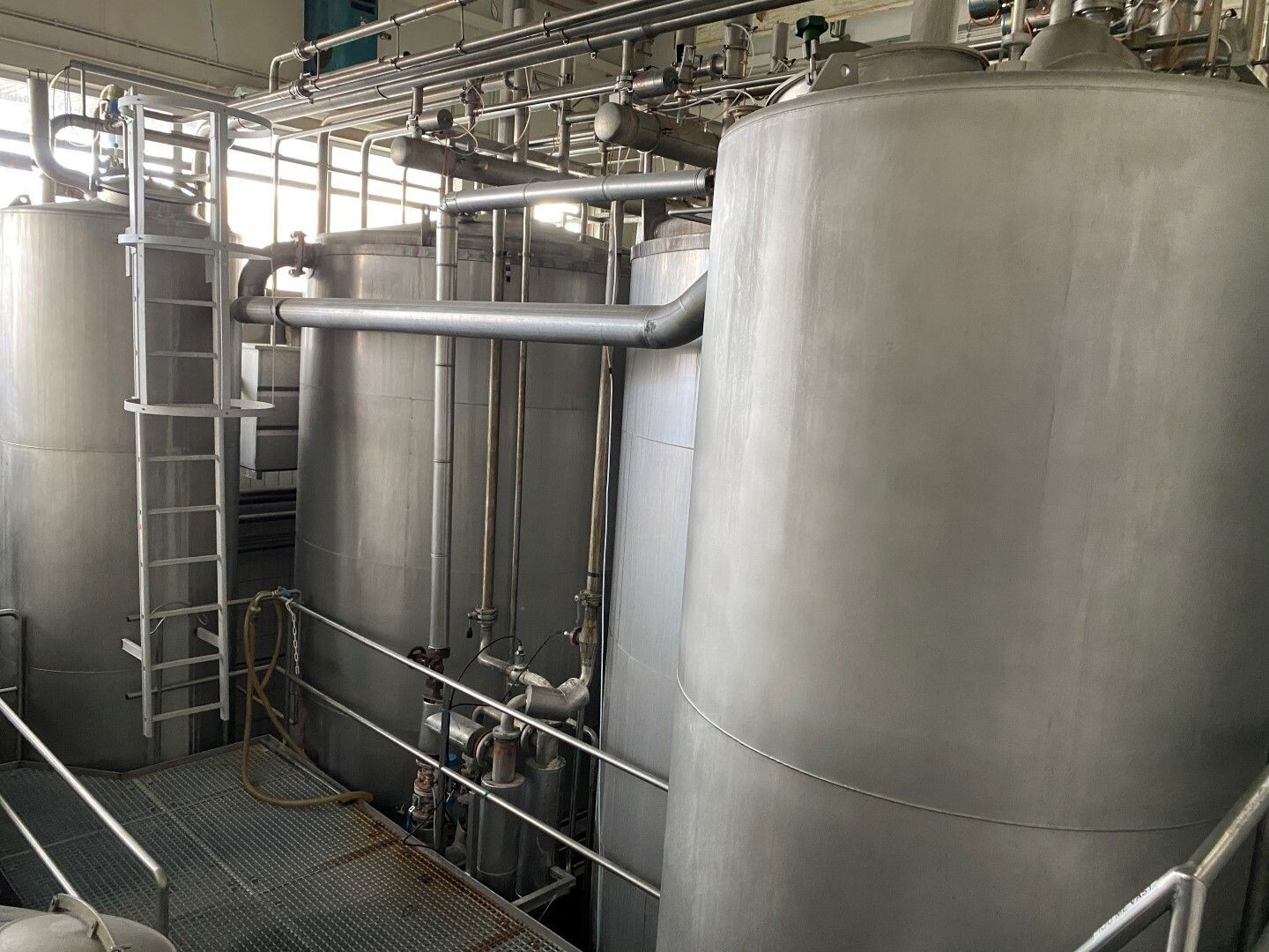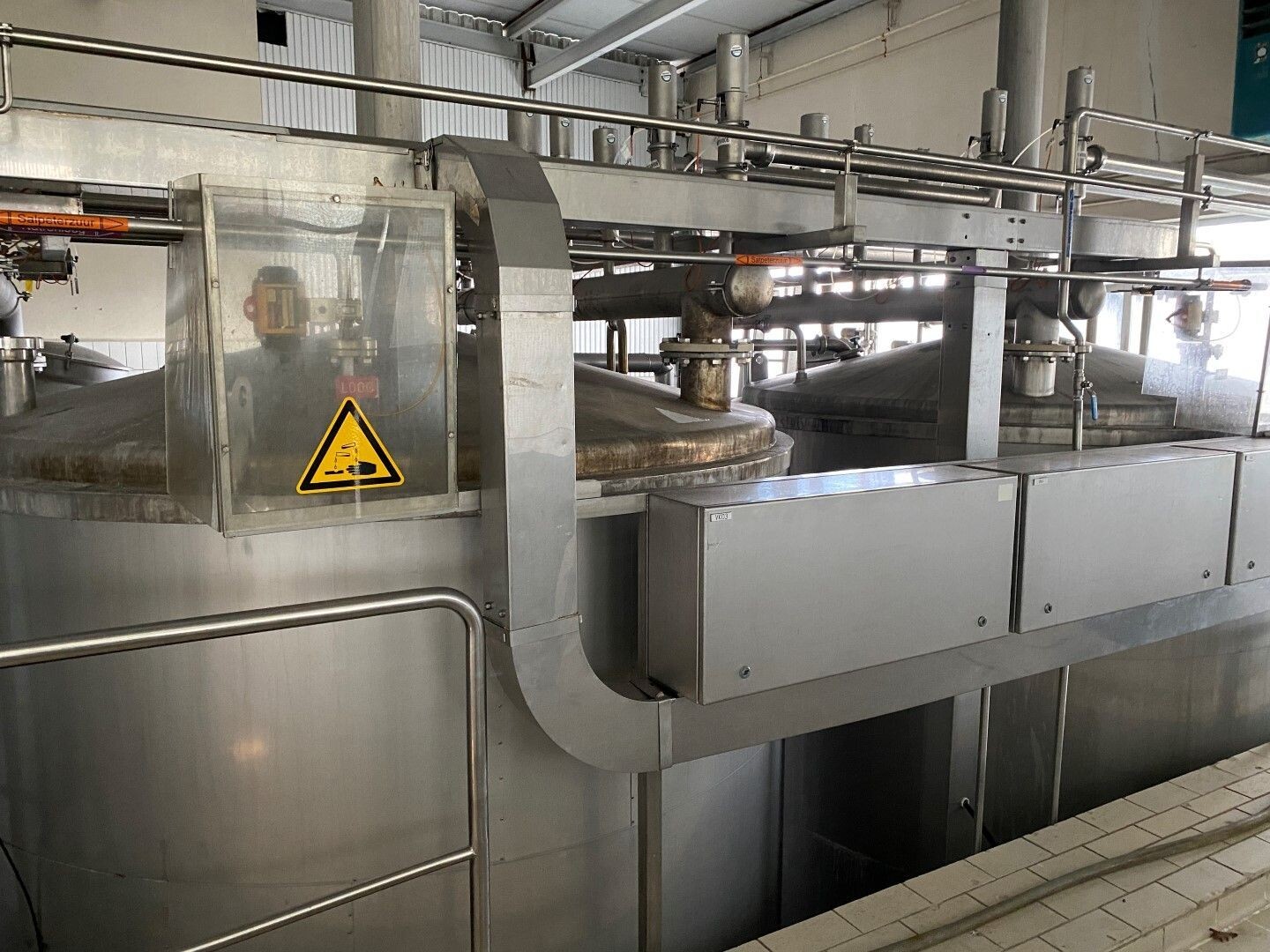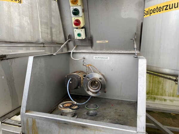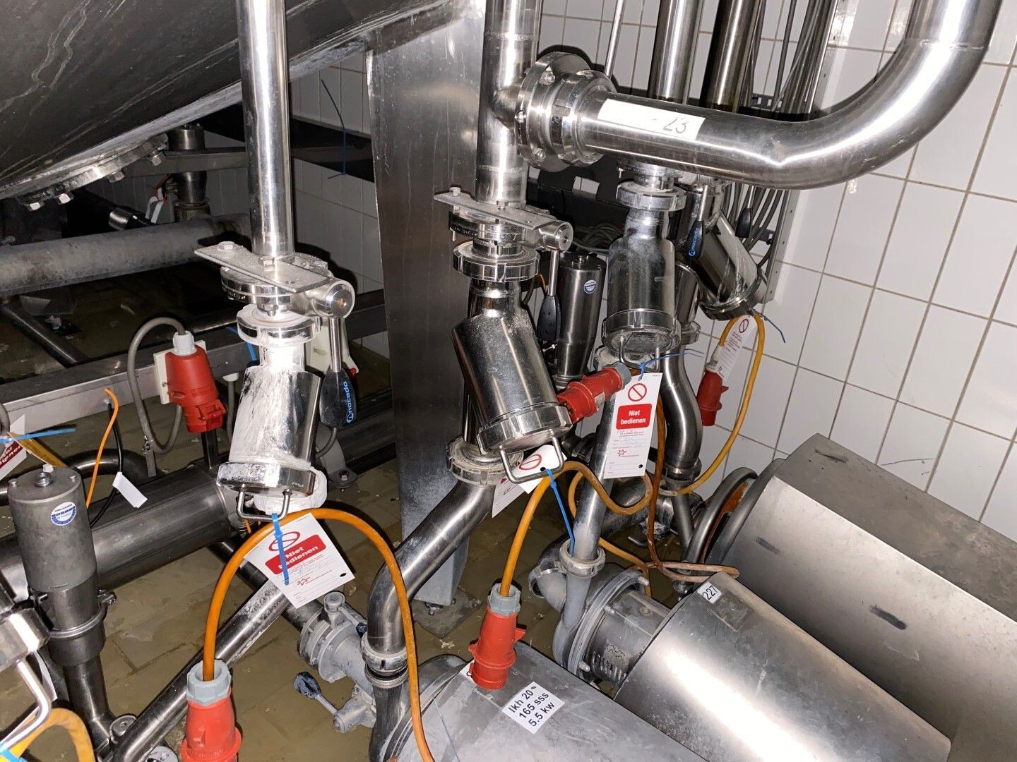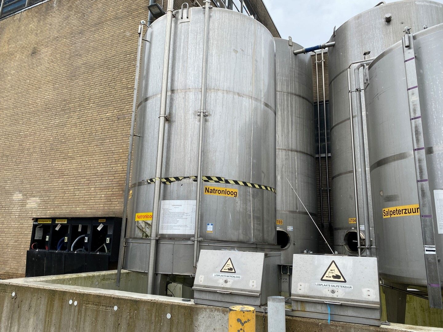 Complete CIP Unit. Bestaande uit: een voorspoel watertank, een loogtank, verwarmd door stoom, inclusief recirculatiepomp. Zuurtank, verwarmd door stoom en inclusief recirculatiepomp. Spoeltank voor schoon water en een water verzameltank. Compleet met al het leidingwerk en ca. 52 kleppen, merk Alfa-Laval model: SRC. Elke tank heeft zijn eigen mangat en kijkglas. Inclusief RVS looprek en trap om de tanks van bovenaf te bekijken. 6 uitgaande leidingen en retourleidingen naar de fabriek, elke leiding heeft zijn eigen pomp (5x 7,5 en 1x 5,5 kW vermogen), merk: Alfa- Laval, model: LKH / FM3. Externe I-O-schakelkast. Optioneel in deze aanbieding: een ontvangst-, opslag- en distributiesysteem voor loog- en zuurconcentraat. Toelichting optioneel systeem: een vrachtwagen brengt het concentraat waarna het in de concentraattank wordt gepompt voor verdere distributie naar de CIP unit of naar andere plaatsen in de fabriek. Bestaande uit een afsluitbare RVS ontvangst box, tank- en verdeelpomp.