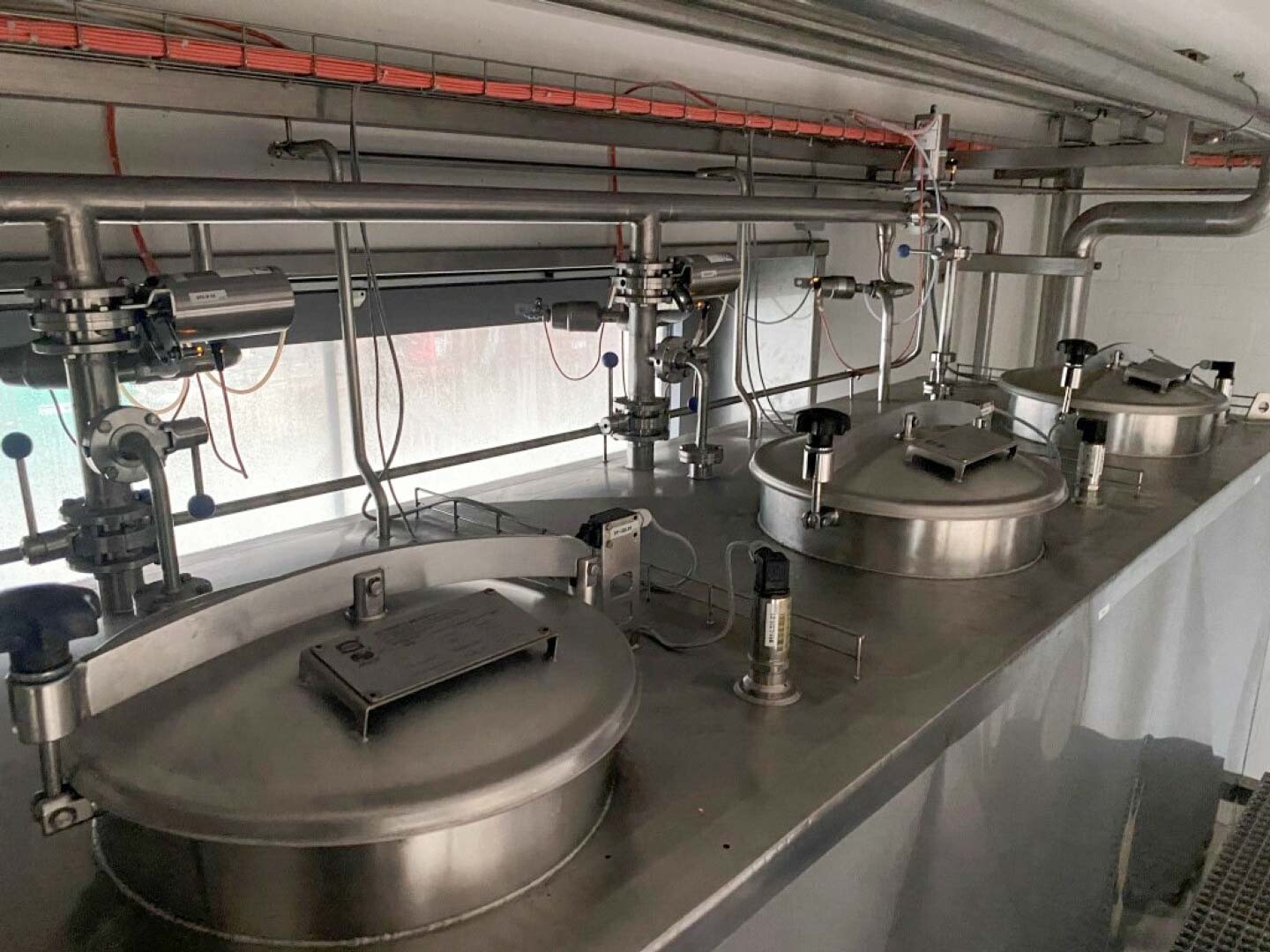 CIP-systeem met 3 tanks van 1200 ltr elk. Merk: Schwarte Milfor. Pompen, kleppen, warmtewisselaar, handmatige doseerpompen voor chemicaliën (vaten).