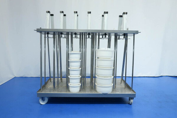 Eindpersen. Merk: ASTA Eismann. Pneumatisch met tafel en 2x6 cilinders, mobiel. Onder elke cilinder hoogte 1200 mm. 5 kazen x 4 = 20 kazen van 10/12 kg. 6 kazen x 6 = 4/5 kg.