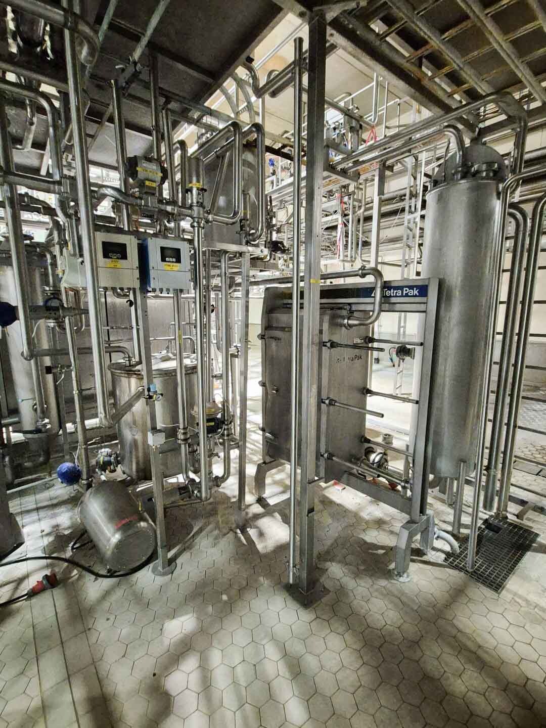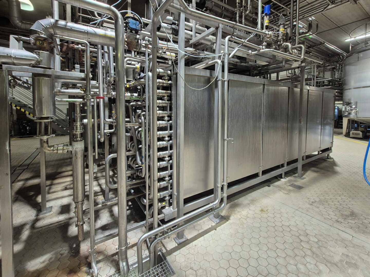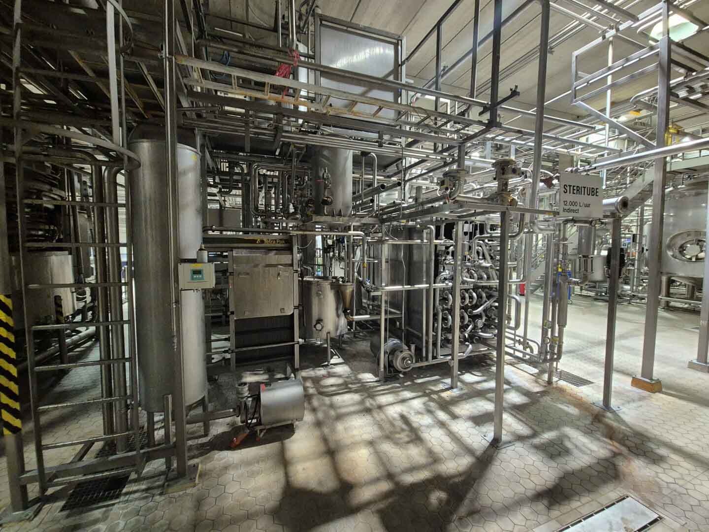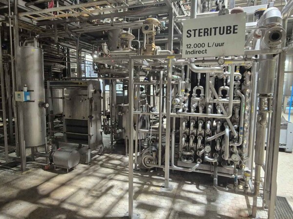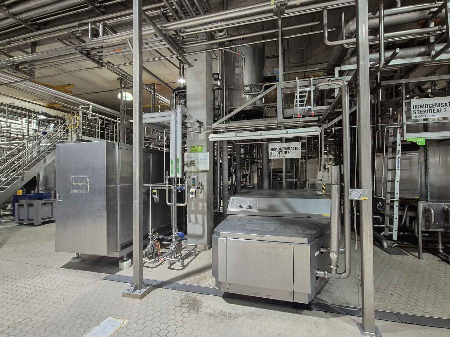 Volledige UHT-eenheid met indirect verwarmingssysteem. Indirect via buisvormige warmtewisselaar Alfa Laval Steritube B13 (Multitube). Eiwitstabilisator bij 95°C - 60 seconden en duurverhitter bij 137°C voor 2/4 seconden. Uitgang bij 25°C of via 1 sectie plaatkoeler Alfa Laval C8 voor ESL-melk 4°C uit. Met balanstank, product centrifugaalpomp, waterpompen, product- en stoomkleppen en leidingen. Stroomopwaarts geplaatst een niet-aseptische 2-traps homogenisator Tetra Pak ALH 30. 3 zuigers, zuigerdiameter: 63 mm met keramische coating, 200 bar. Huidige motorvermogen 90 kW. Inclusief een dubbelwandige koelbare afvalwatertank ETA van 2000 liter. Siemens ET200M remote control box en schakelkast met Danfoss FC302 (frequentieregelaars van 4kW & 75kW), PI&D en documentatie beschikbaar.
