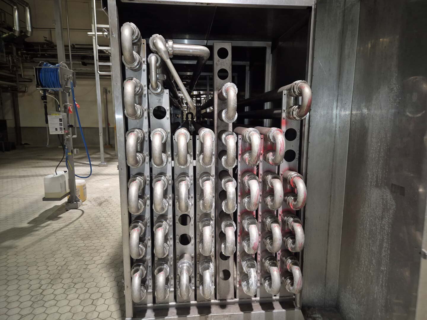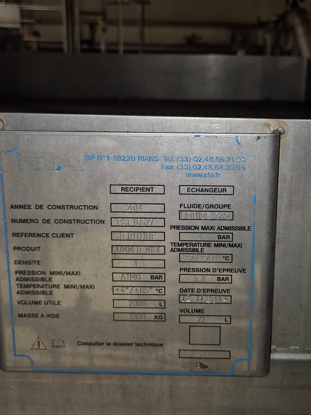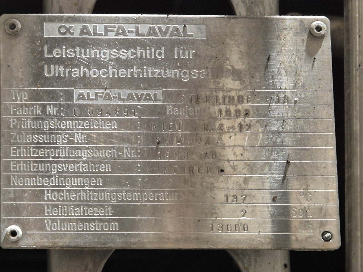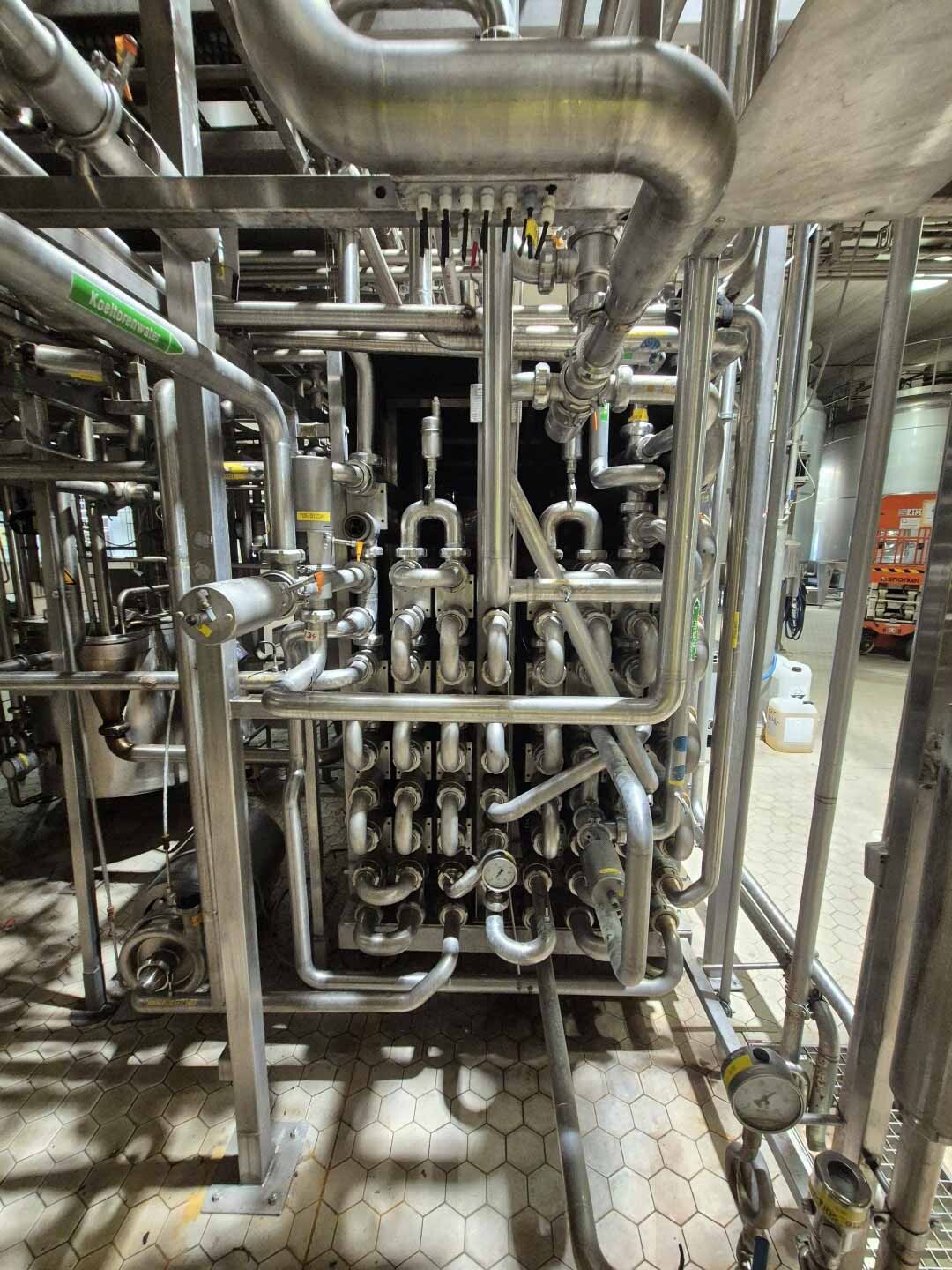 Volledige UHT-eenheid met indirect verwarmingssysteem. Indirect via buisvormige warmtewisselaar Alfa Laval Steritube B13 (Multitube). Eiwitstabilisator bij 95°C - 60 seconden en duurverhitter bij 137°C voor 2/4 seconden. Uitgang bij 25°C of via 1 sectie plaatkoeler Alfa Laval C8 voor ESL-melk 4°C uit. Met balanstank, product centrifugaalpomp, waterpompen, product- en stoomkleppen en leidingen. Stroomopwaarts geplaatst een niet-aseptische 2-traps homogenisator Tetra Pak ALH 30. 3 zuigers, zuigerdiameter: 63 mm met keramische coating, 200 bar. Huidige motorvermogen 90 kW. Inclusief een dubbelwandige koelbare afvalwatertank ETA van 2000 liter. Siemens ET200M remote control box en schakelkast met Danfoss FC302 (frequentieregelaars van 4kW & 75kW), PI&D en documentatie beschikbaar.