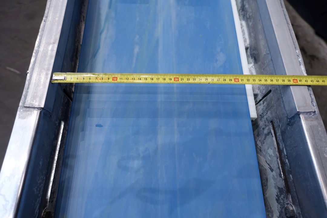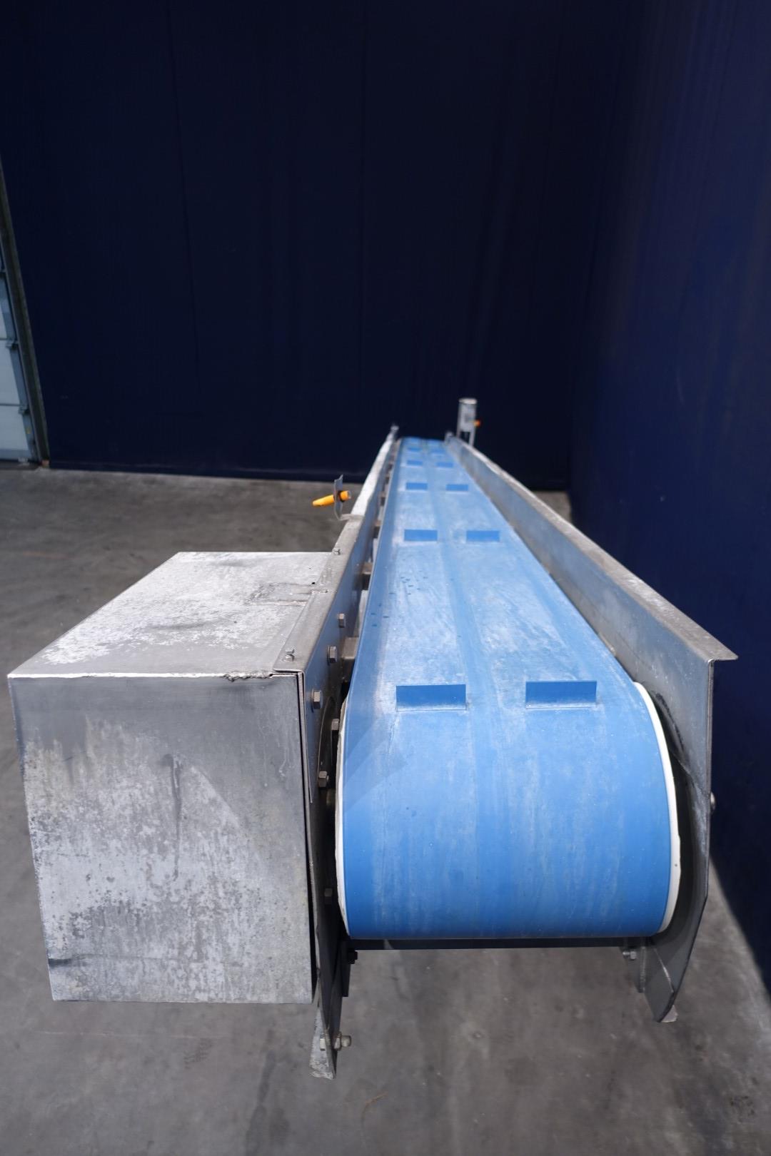Ascending beltconbeyor for butterblocks, 25kg. SS frame, movable to side. Ca. 30 degree angle up. Effective Belt L 592 x 35 cm. Distance between drivers 101,5 cm. Electric drive Motor. Total Dimensions: 622 x 95 x 252 cm. This butterblock transportconveyor has functioned with A Simon Freres Contimalax cm 300 reworker. Which has stocknumber 15329, and will only be sold togetgher.