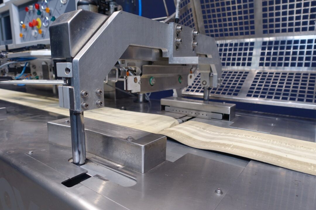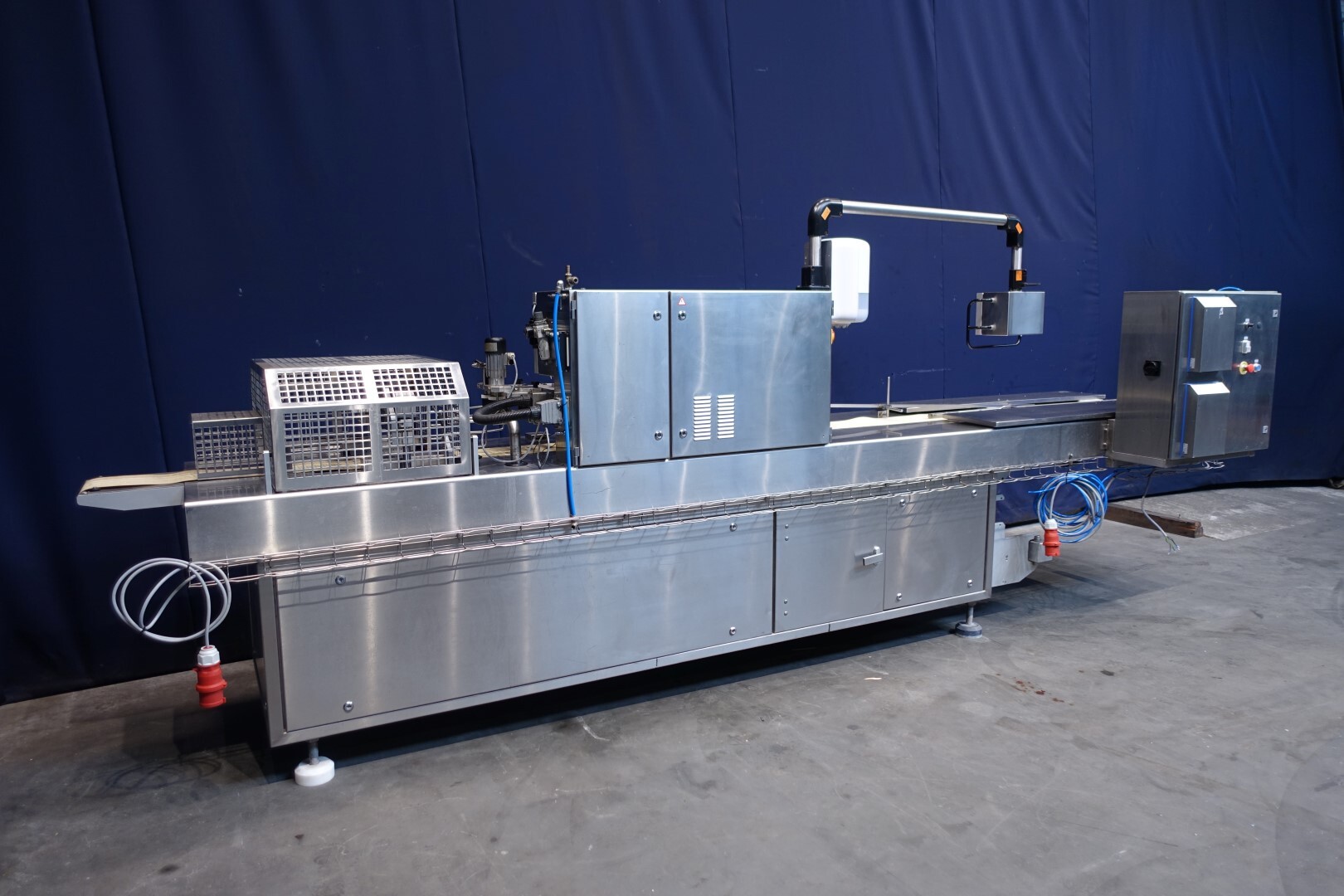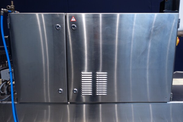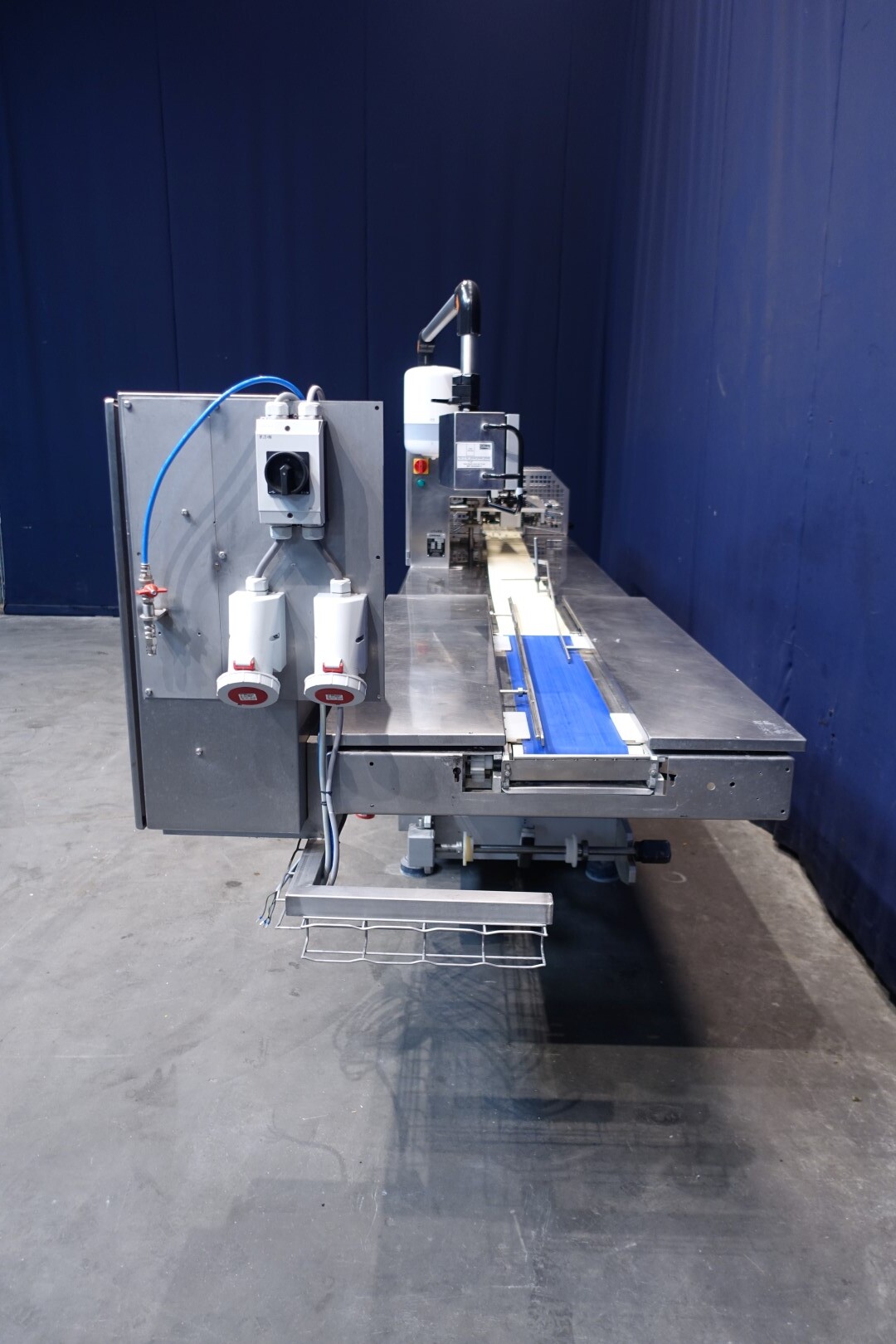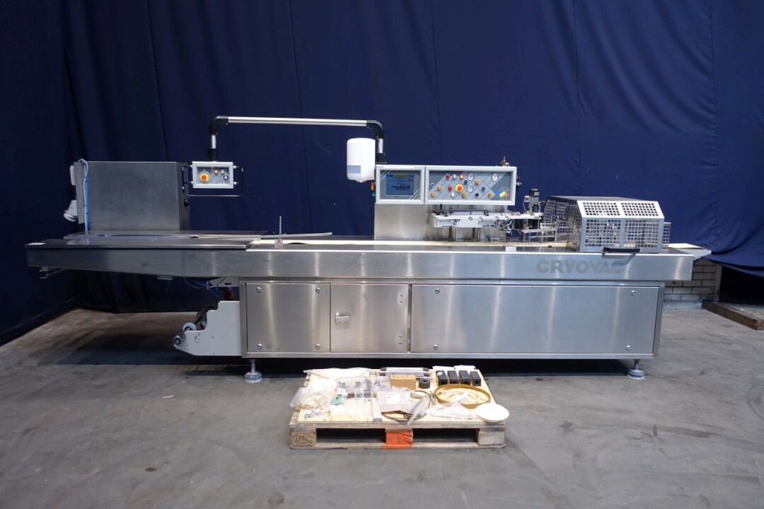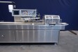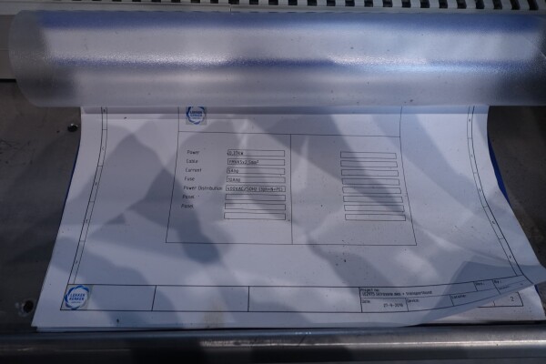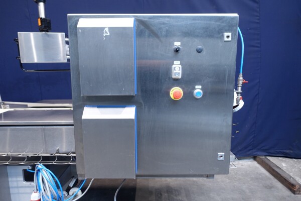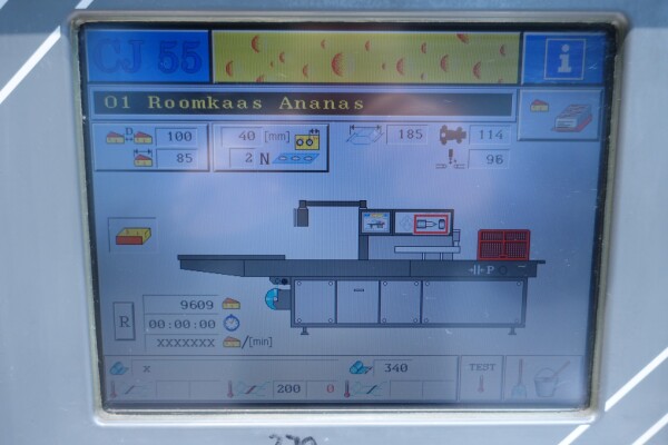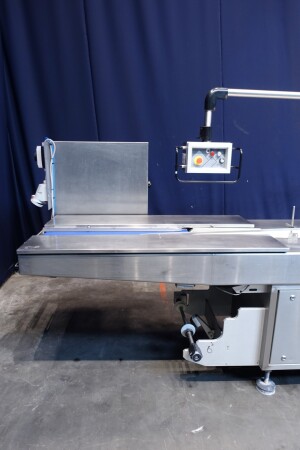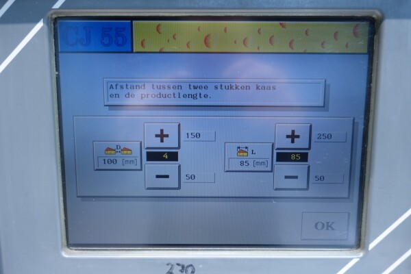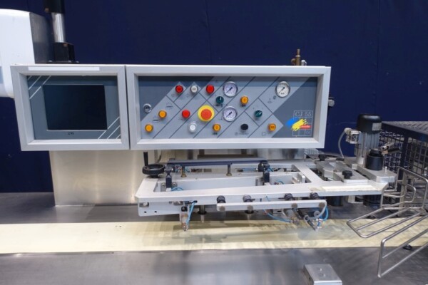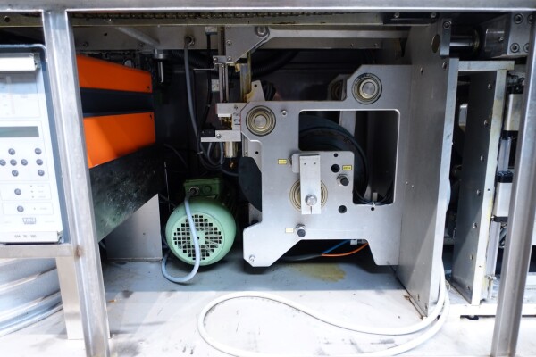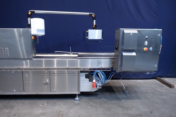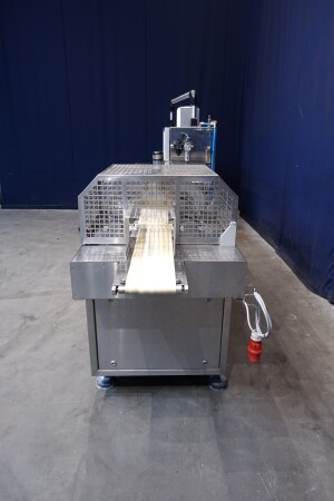 Horizontale Flow Wrapping machine. Productafmetingen: min. 50-150 mm tussen de porties en 20-250 mm lengte van de porties. Aan- en afvoerband. De machine kan de kaas alleen of kaas op een schaaltje in een plastic folie verpakken met een conserveringsgas of met een krimpfolie die naderhand strak rond het product wordt getrokken door een heet waterbad of krimptunnel. Breedte transportband 20 cm - lengte 500 cm. Staat van de machine: goede en werkende bedieningselementen.