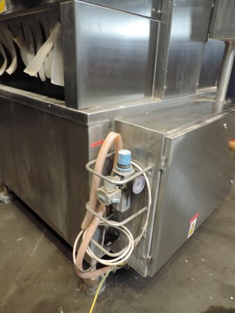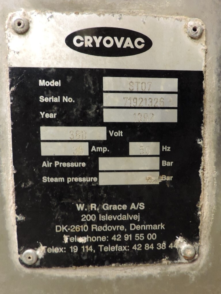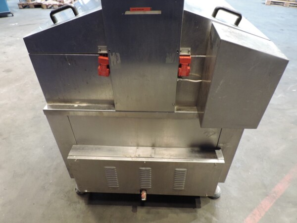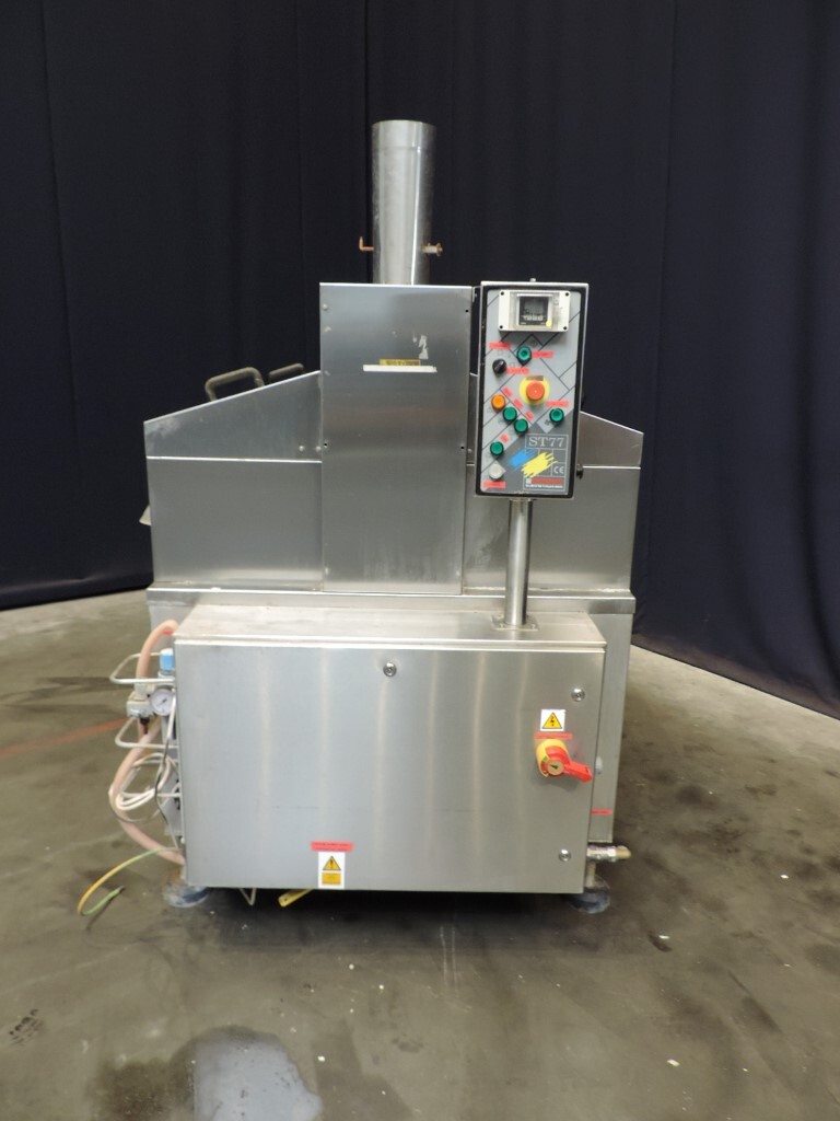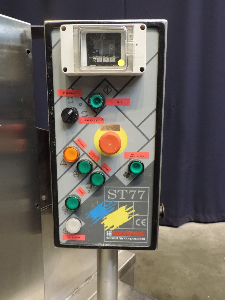 Automatische dompelbakken voor warm water, ontworpen om vacuüm verpakte plastic zakken te krimpen naar het product en om de rimpels die worden veroorzaakt door het vacuümproces te verwijderen om het uiterlijk van de verpakking te optimaliseren en de veiligheid van de verpakking te verbeteren. Geïsoleerde warmwatertank, elektrisch verwarmd. Instelbare temperatuur en dompeltijd. De ST77 is PLC-gestuurd (Siemens S5) en heeft een gemotoriseerde binnenband voor het overbrengen van pakketten in en uit de badmachine, (invoer- en uitvoerband naar / van de unit zijn uitgesloten) binnen afmetingen van de baden: ST07 : 60 x 40 x 30 cm + de ST77; 40 x 88 x 102 cm.