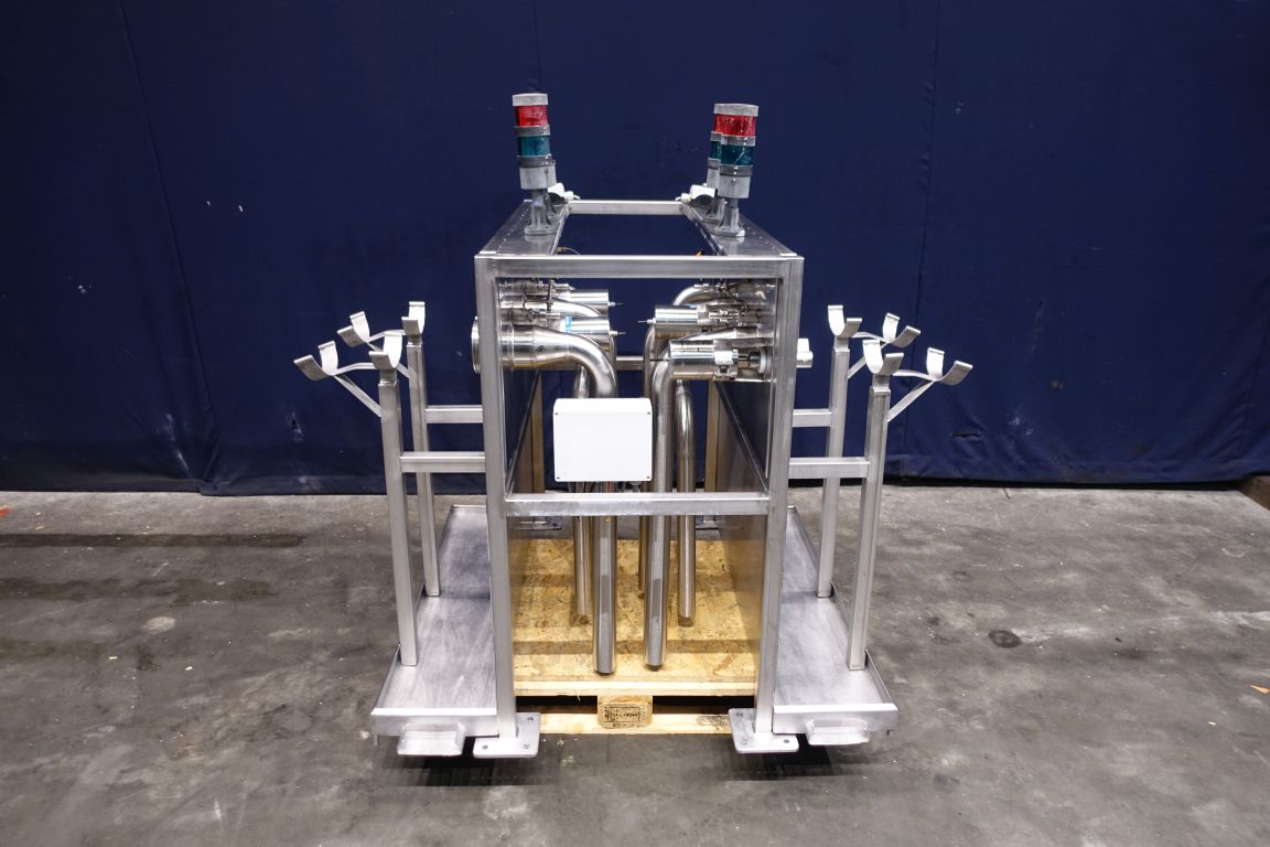 4 Reception units for truck unloading by gravity. 4 Flow transmitter Diesel (total count send to scada system), 1 panel for reception units with start/stop button for driver. Emptying of trucks with Raw milk by Free fall to the basement by gravity to lower placed tanks, capacity depending on the connection (outlet size) on the truck. Total dimensions of reception unit: 130 x 160 x 150 cm.