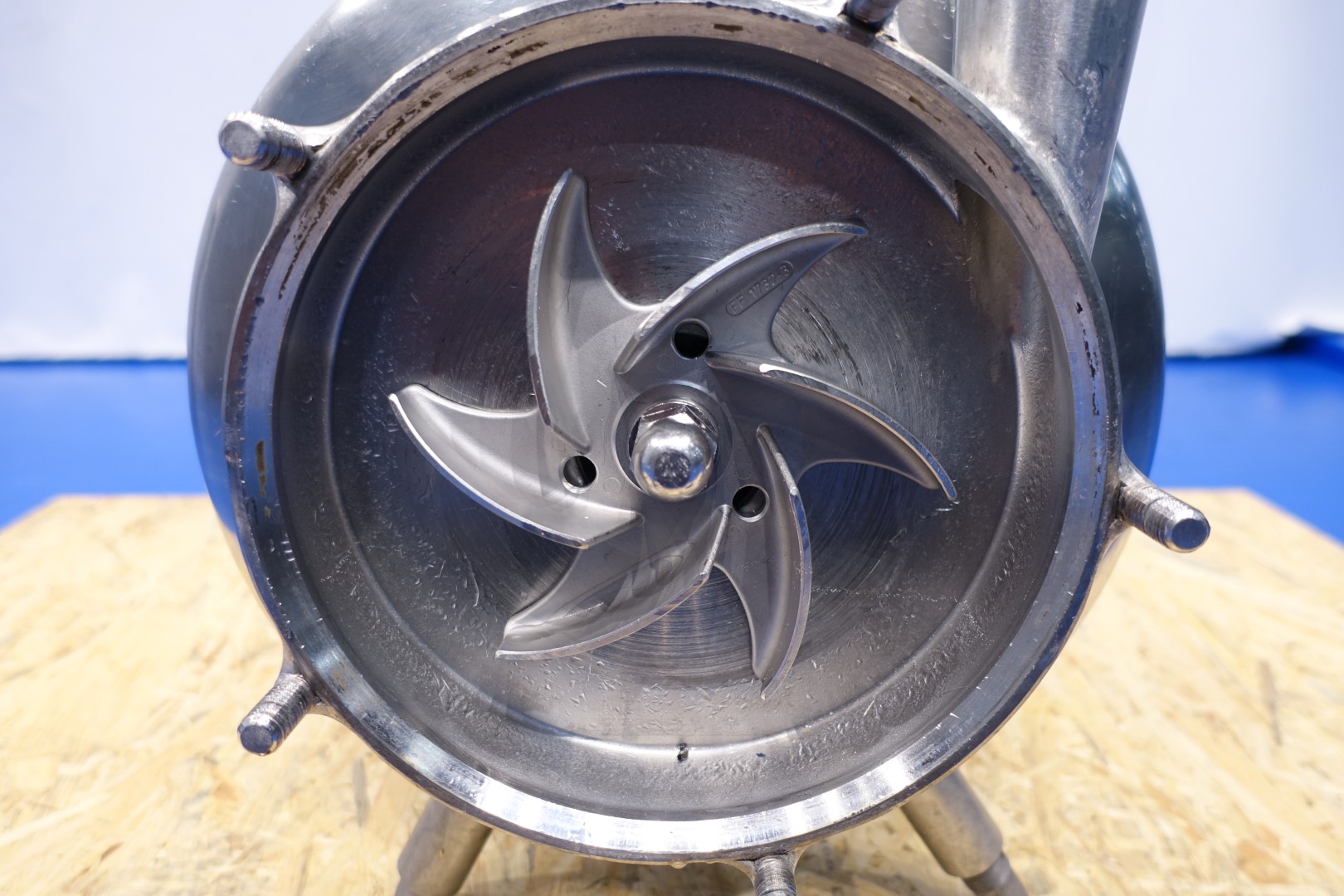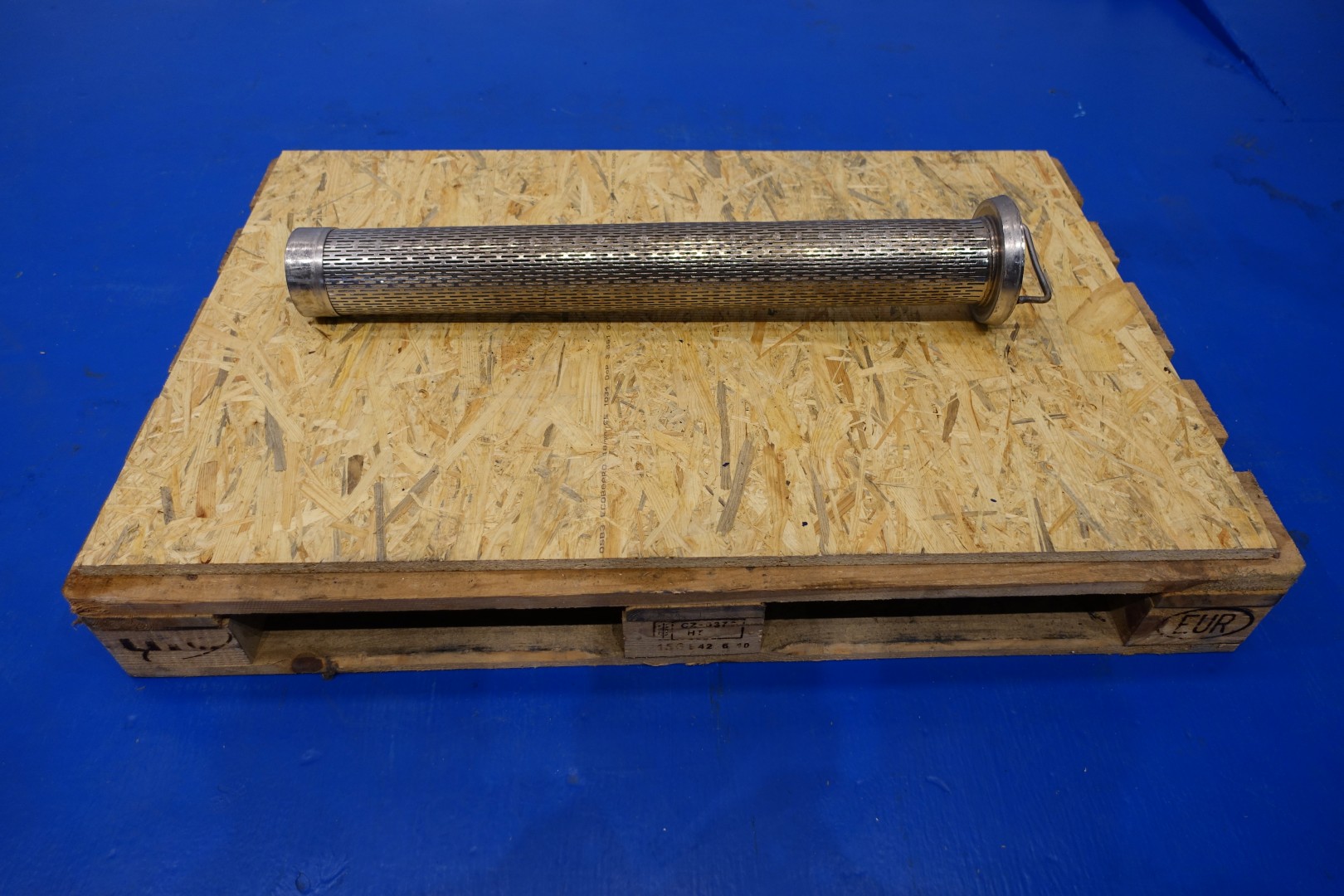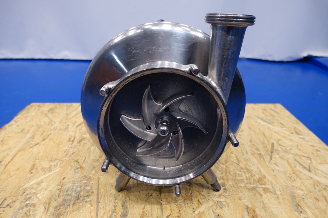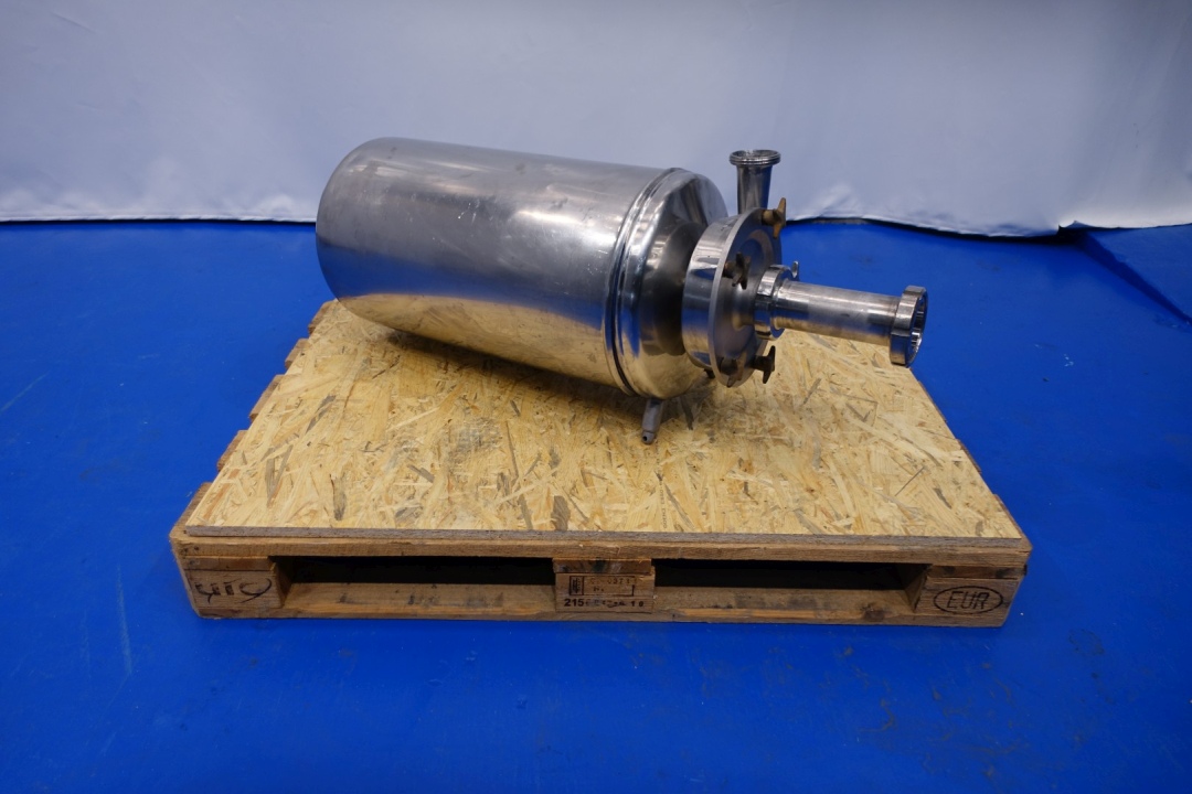 Milk reception unit with air elimination tank, pump and filter. Purpose to eliminate air to ensure accurate volume measurement before entering the flow transmitter and reception tank(s). Centrifugal pump Fristam FP742, impellor Ø 165 mm - motor 11,0 kW - 21,5 A - 2.880 rpm - 50 Hz. Connections pump In: 3" Din - Out: 2" Din. Tank capacity ca. 130 liter, dimensions Ø55 cm, height 55 cm with connections: 1 x 4" Din - 1 x 3" Din - 1 x 1" Din. Total dimensions: 100x35x42 (lxwxh) cm - weight: 245 kg.