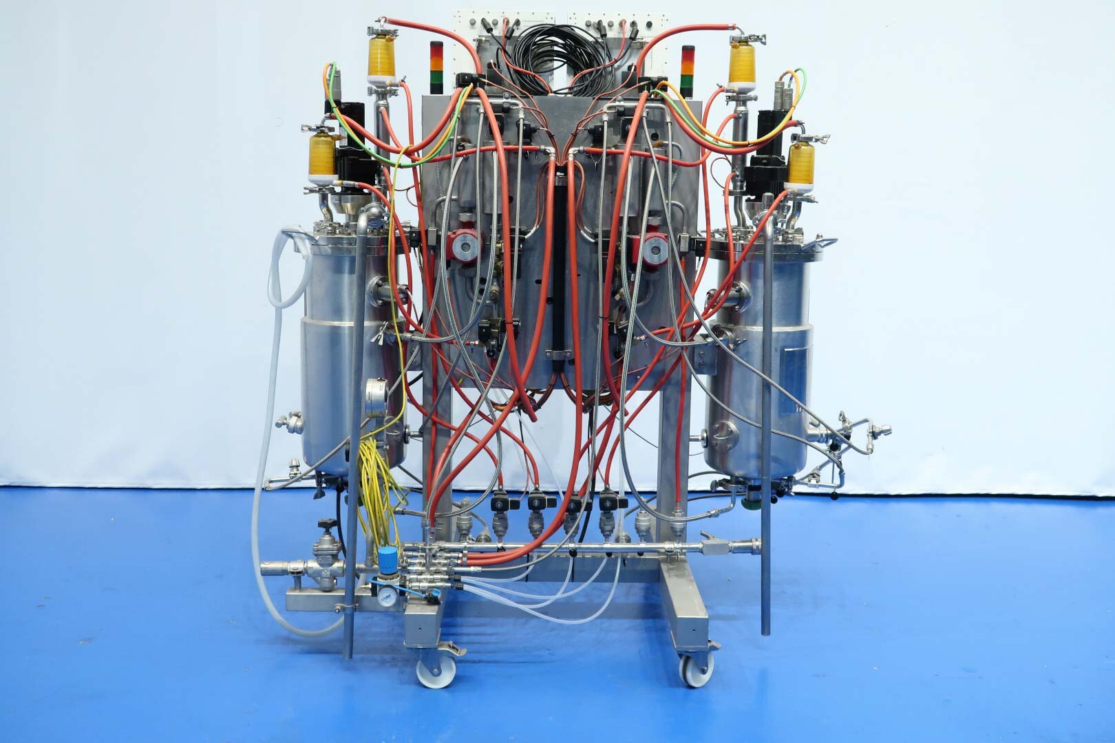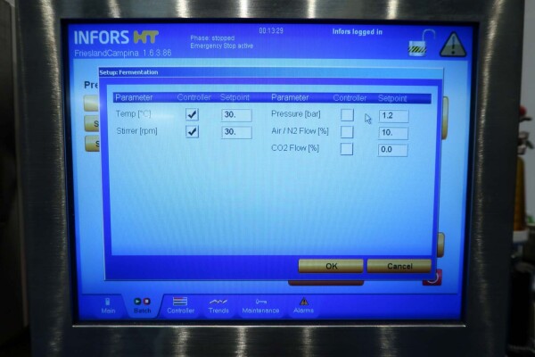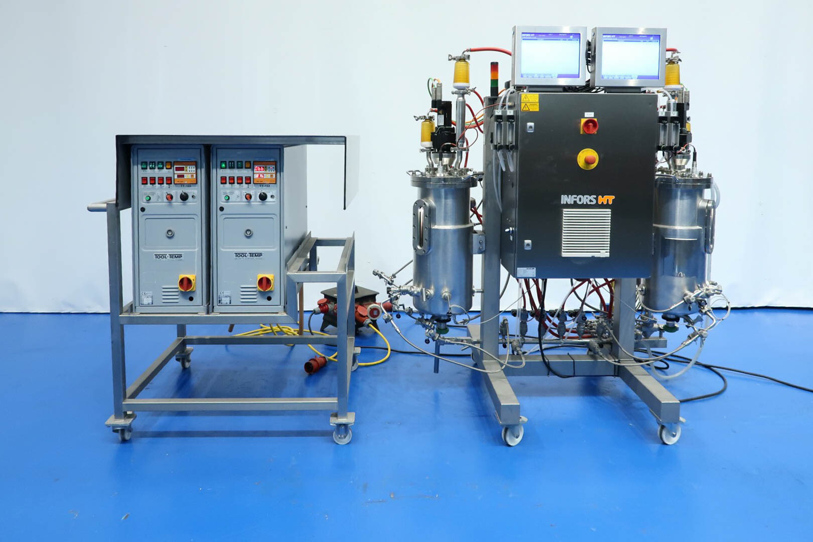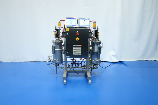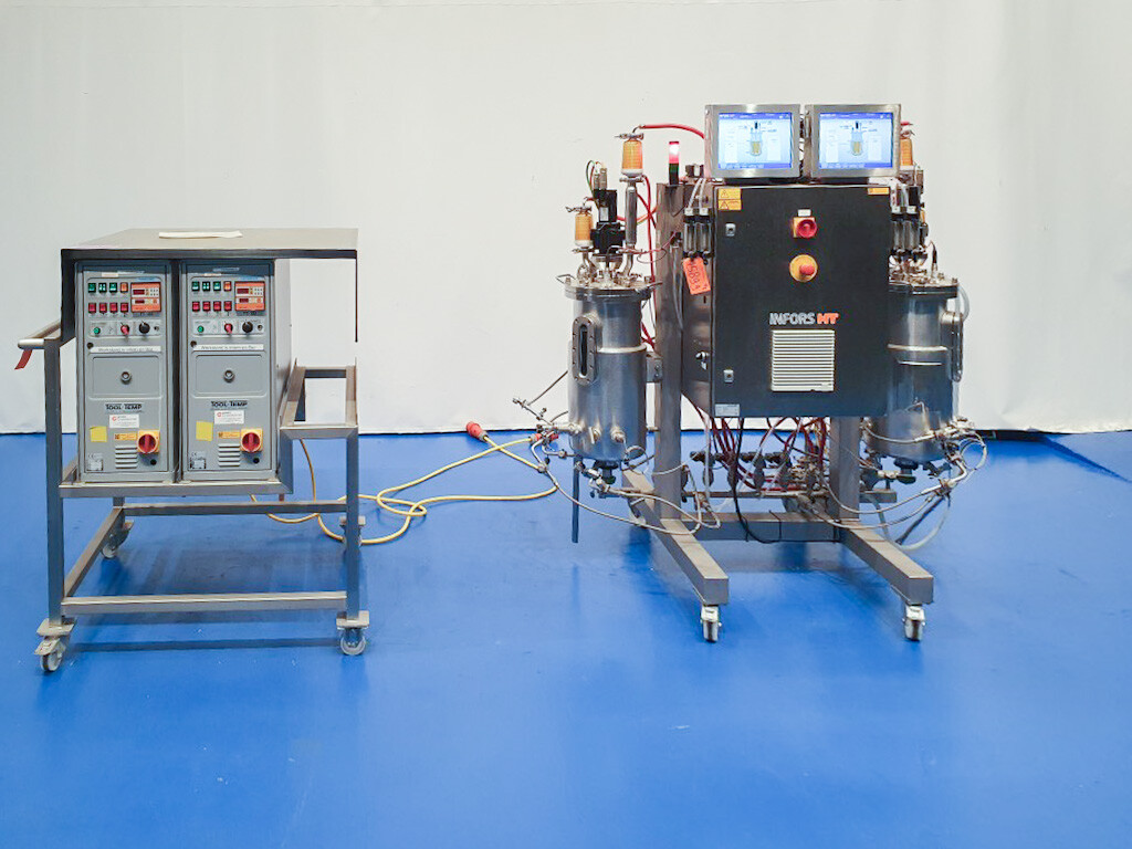 De dubbele bioreactor is eerder gebruikt voor schimmeltoepassingen en bestaat uit twee vaten met elk een werkvolume van 20 liter en een totaal volume van 30 liter per vat, inclusief een mantel van 2 liter. Beide vaten zijn vervaardigd uit hoogwaardig roestvrij staal (SS 316 / 1.4404 en 304L / 1.4307) en zijn uitgerust met een uitgebreide reeks systemen en sensoren, waaronder een lucht/N₂-gassysteem, een CO₂-gassysteem, temperatuursensoren in zowel het vat als de mantel, en een druksensor in het deksel. Elk vat beschikt over een ovaal kijkglas, een interne lamp en een U-vormige roerder aangedreven door een frequentiegeregelde servomotor. Het systeem omvat tevens twee Tool-Temp AG TT-133 waterbad-voorverwarminstallaties met een vermogen van 13,9 kW per stuk. De bioreactoren worden bediend en bewaakt via Siemens/Infors besturingssystemen met twee HMI-touchscreens.