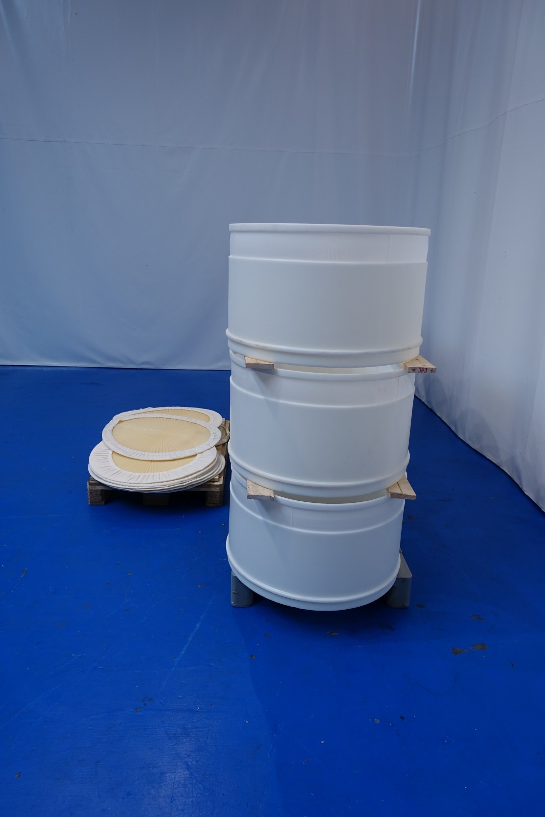Big cheese moulds, 12 pieces, previously used to make Emmental cheeses. Moulds are partly perforated with covers/nets (15 pieces). Inner Ø 75 cm - outer Ø 77 cm. Total height: 47 cm, perforated section 35 cm. Used in combination with Draining and pressing system, available under our STN15792 and STN15793. Dimensions per pallet 150x80x170 (lxwxh) cm - weight total 2 pallets: 182 kg.