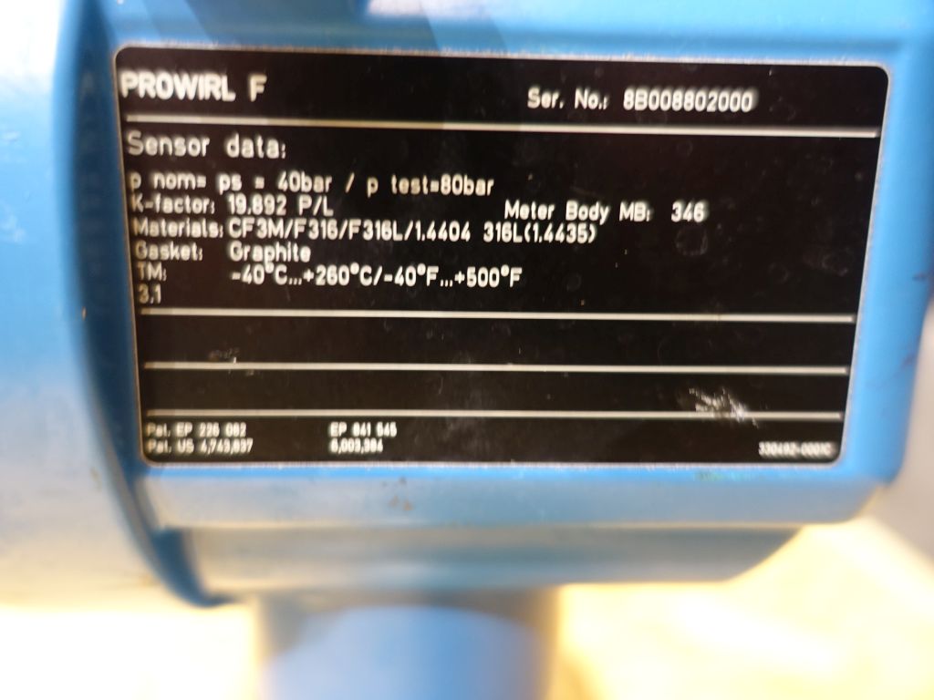 Volume flow meter for measurement of basic liquid / gas /steam applications. Vortex flow measuring system. Connections: DN40 / DN 40, Flange. Electronic head/display Prowirl 72.