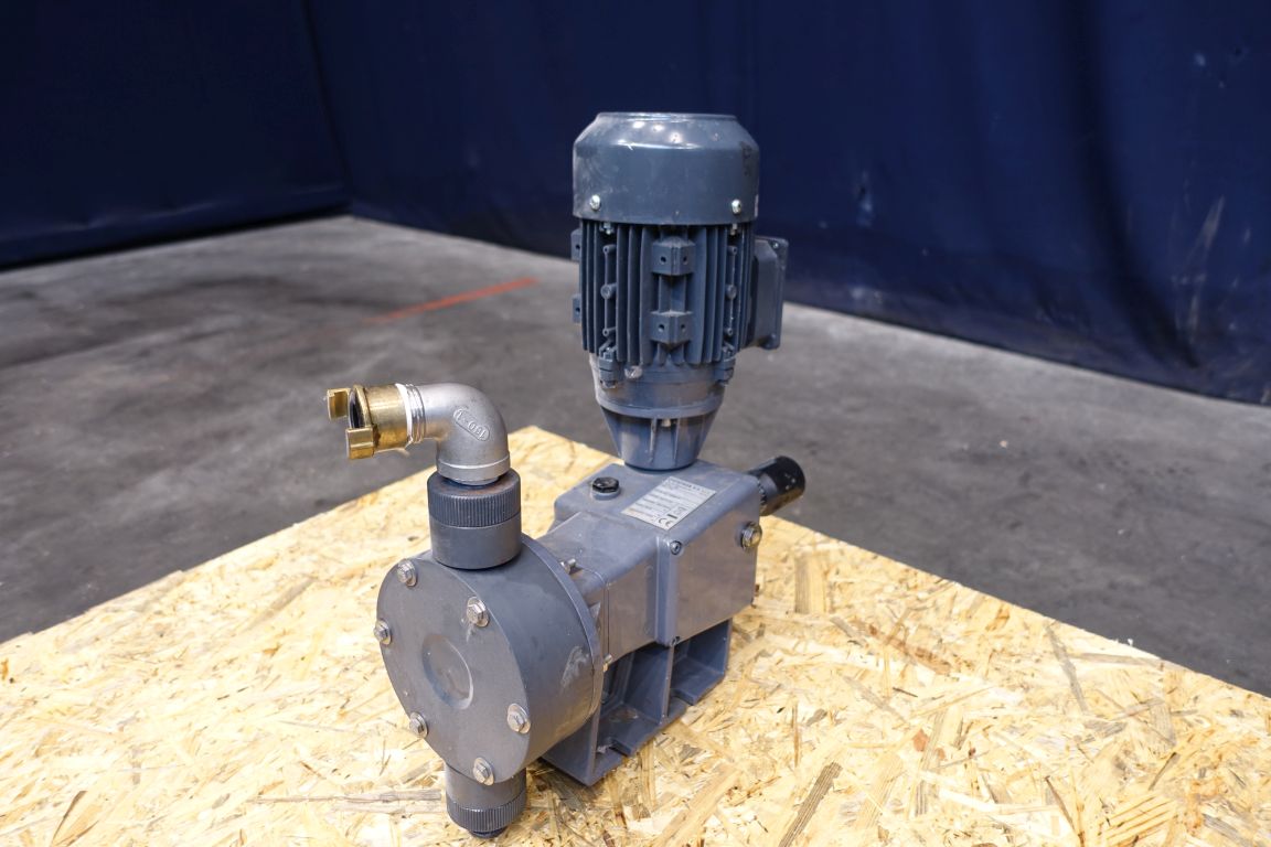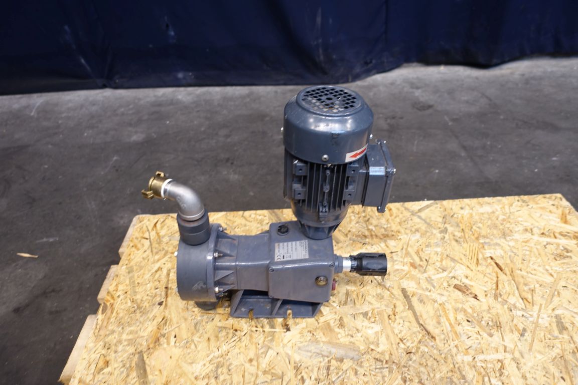 Membrane pump. Electric driven. Motor: 0,25 kW - 1350 rpm - 0,84 Pressure: 6 bar. PVC pump head. PTFE membrane. Manual stroke adjustment.