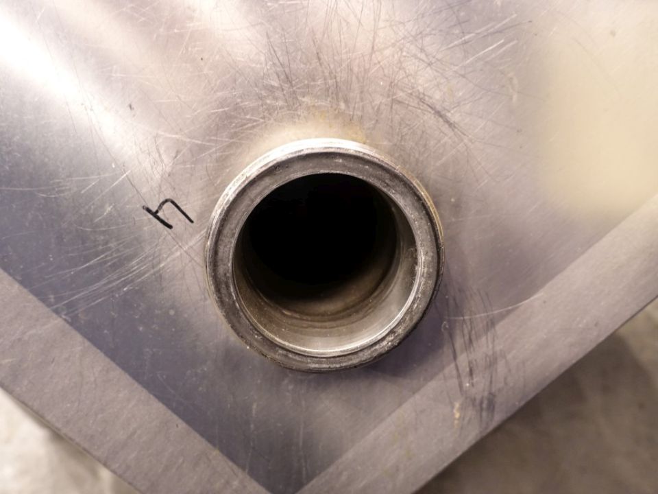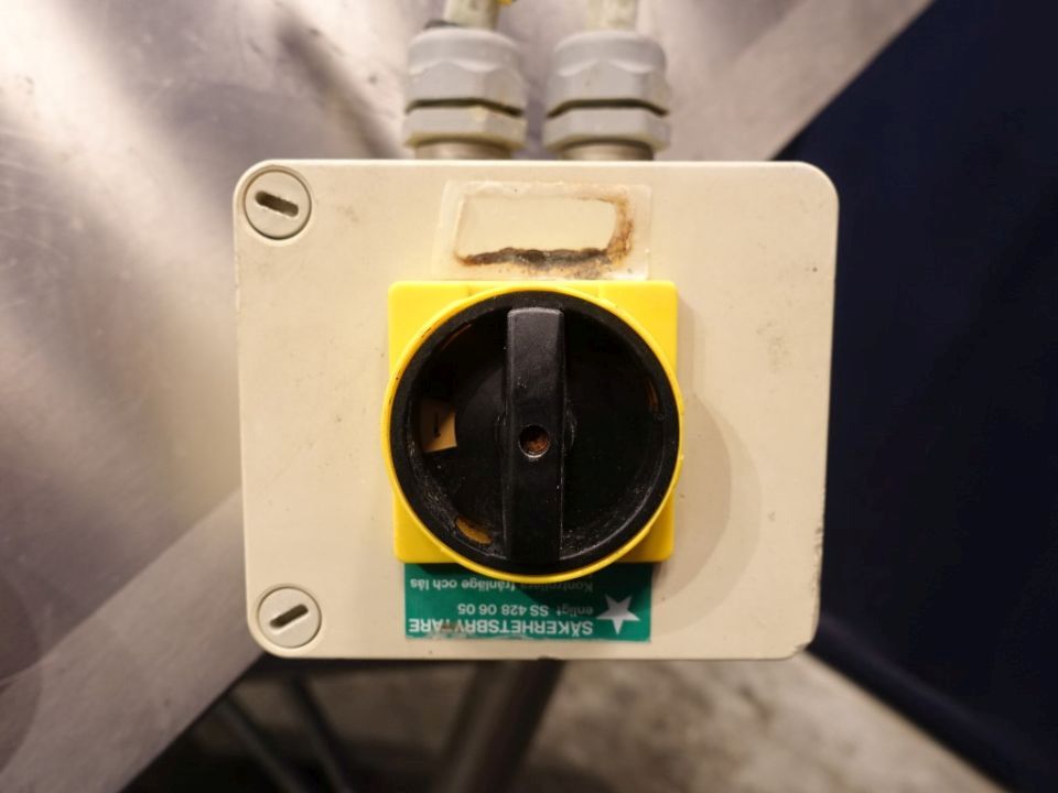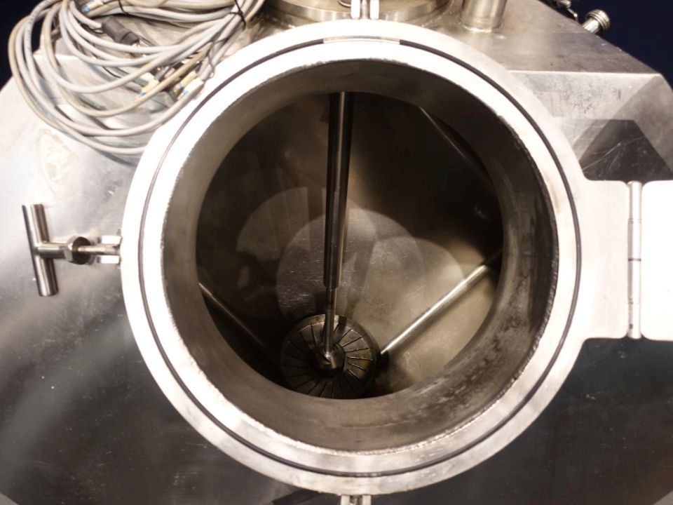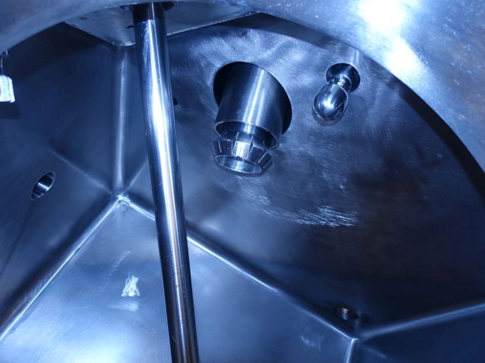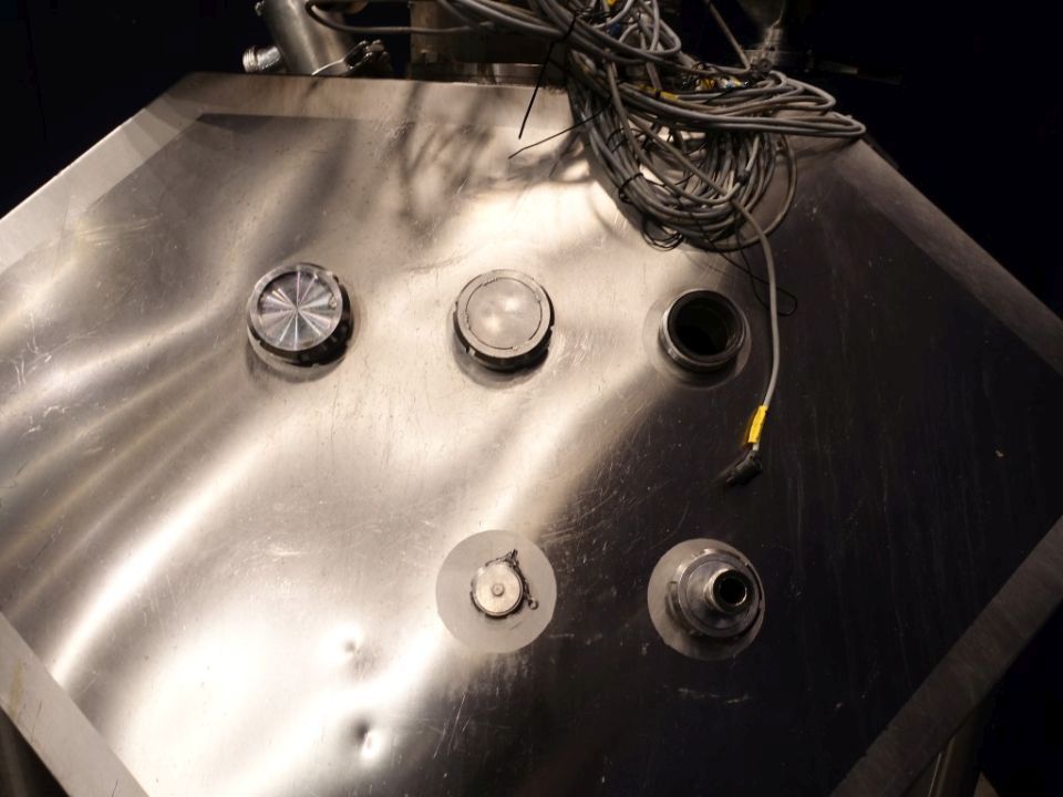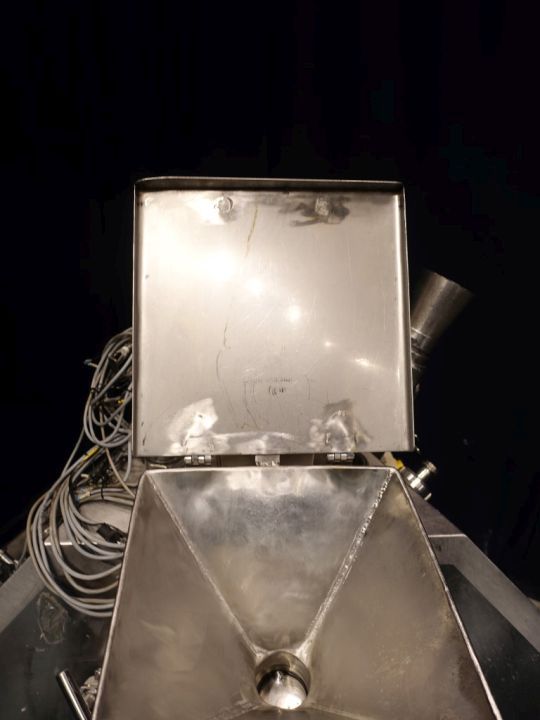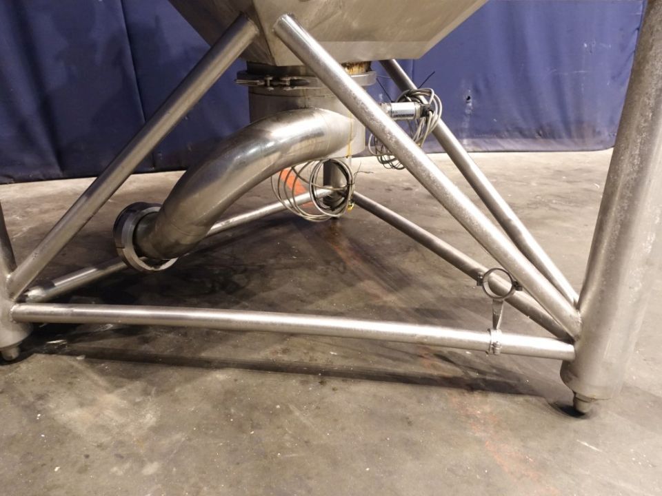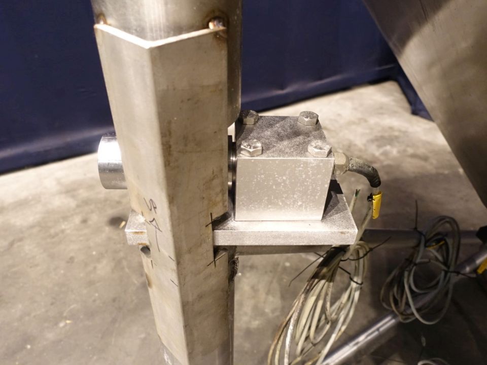 Food tech cubic powder dissolver on loadcells. Top driven mix agitator with powder disolving blades. Motor power: 7,5 kW - 15,3 A - 1450 rpm. CIP cleanable with 5 spraybowls. The powder is dosed through inlet on top and under the 'umbrella' shaped injected liquid, to have a minimum of dust (also called scubber type inlet). Working temperature: 0 / 95 °C. Outlet connection: 4'', DIN, outlet heigth: 25 cm. 2 ingredient inlets on top the circulation pipe line and a hopper on the manhole. Manhole diameter 45 cm. 3 adjustable feet, with 1 loadcells. Total dimensions: 1,7 x 2 x 2,4 meter. Total volume: 750ltr working volume 200-450ltr. Can work by constant circulation over a buffer tank. Working condition, video of test availalbe.