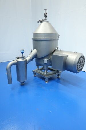 Verse kaas - kwark - yoghurt separator. Slechts 16 uur in gebruik. Nozzle separator. Droge stof instelbaar door nozzle grootte en gekozen flow tussen 15-21%. Invoercapaciteit van gefermenteerde magere melk 0% tot 5.400 liter per uur. Uitvoercapaciteit tot 1.100 kg per uur (bij 18%). Maximale trommelsnelheid: 6.000 tpm - droge stof 1,1 kg/dm3. De separator scheidt gefermenteerde magere melk in zware fase, wei en lichte fase wrongel/yoghurt om de eiwitten te concentreren met behulp van een nozzlesysteem. Verhouding invoer en uitvoer tussen 2 en 3 liter voor 1 liter geconcentreerd eindproduct. CIP reinigbaar. 6 nozzles van 0,6 mm in de trommel.