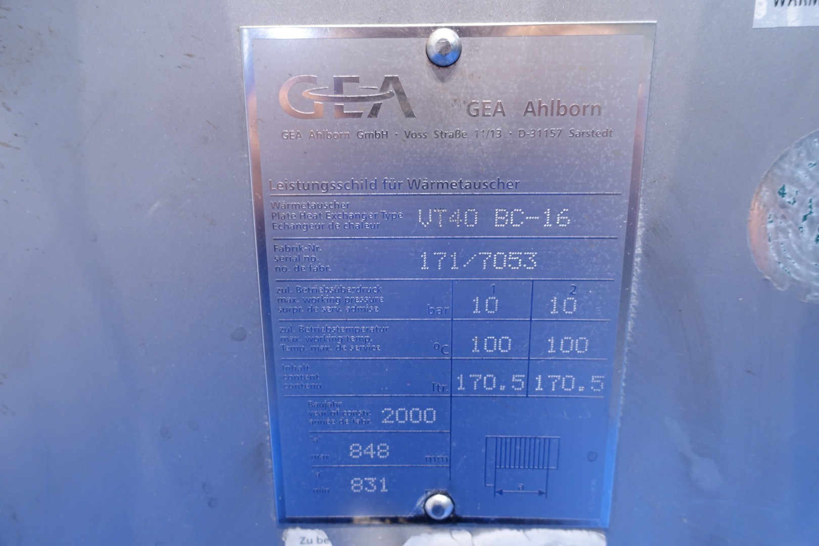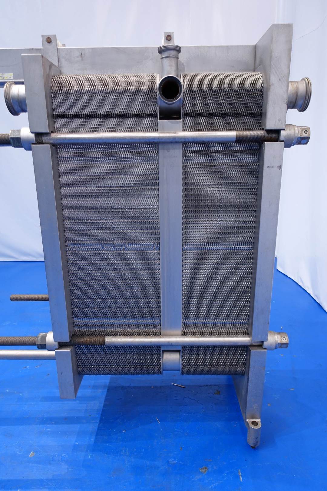 Plate heat exchanger, sanitary (PHE). Max working pressure: 10 bar - Max working temperature: 100 °C. Beam length: 194 cm, connections: 4x DN100 Din - 2 x DN65 Din. Current configuration: 2 Sections: 73-87 plates (total 160) - Connections head: 2 up, follower 2 up. Total volume: 2x 170,5ltr each section. Used as quark cooler 5,000ltr/h from 43->4°C in 2 steps. But other Flow- temperature cycles possible. Total dimensions: 217x70x187 (lxwxh) cm - weight: 2.139 kg.