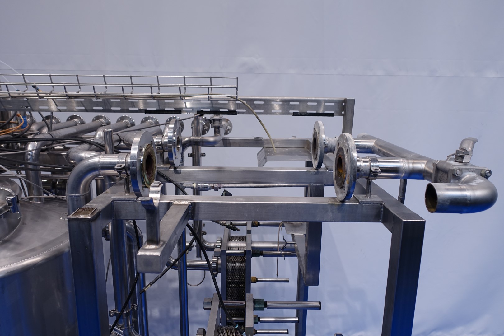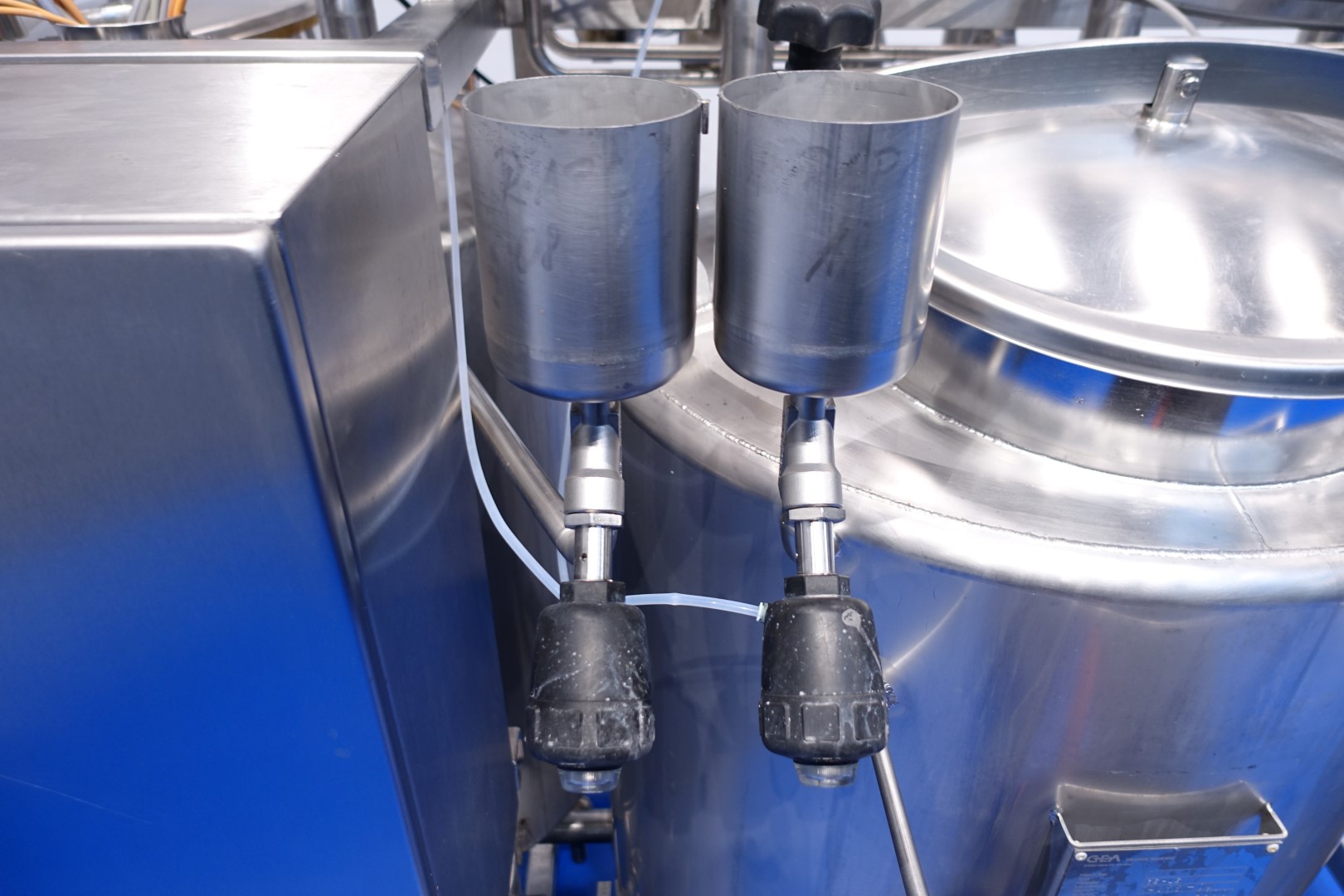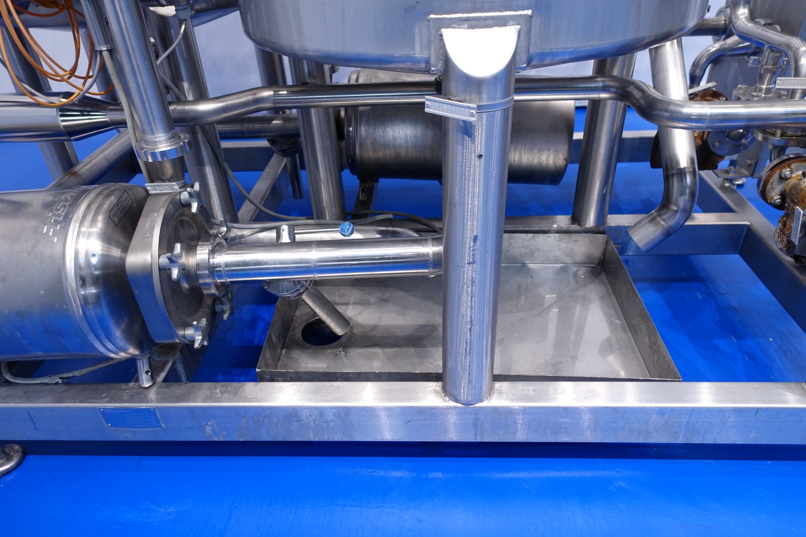 Skid mounted double Cip unit, 2 independent CIP units mounted in 1 frame. Each unit exists of: balance vessel 500ltr, Fristam centrifugal pump CIP + pump, Filter and a Plate heat exchanger. Pump details: Fristam type: FP742 A - no. 0443440080 motor: ABM 5,5 kW - 12 A - 2.890 rpm - 50 Hz - impellor Ø 175 mm - connections in: 2,5" Din - out: 2" Din. Pump 2 identical only no. 2 0443440081 and motor: 5,5 kW - 10,3 A - 2.930 rpm both giving 25-50m3/h at >4bar - connections in: 3" Din - out: 2" Din. 2x GEA plate heat exchanger to heat the cleaning detergent to the set temperature. Both type: VT20CDS-C-10 - no.: 170/13975 and 170/13976 - 1 section 22 plates. 11x pipes at the side of skid with connections 2" Flange. Controls: Siemens remote I-O box. Complete with piping for condensate and cip + return valves, 2 small vats connected to the vat for enzymes adding. The units were used to clean Quark separatores KDA30 and KDB45 (only steam control valves missing). Total dimensions: 285x135x235 (lxwxh) cm - weight: 1.415 kg's.