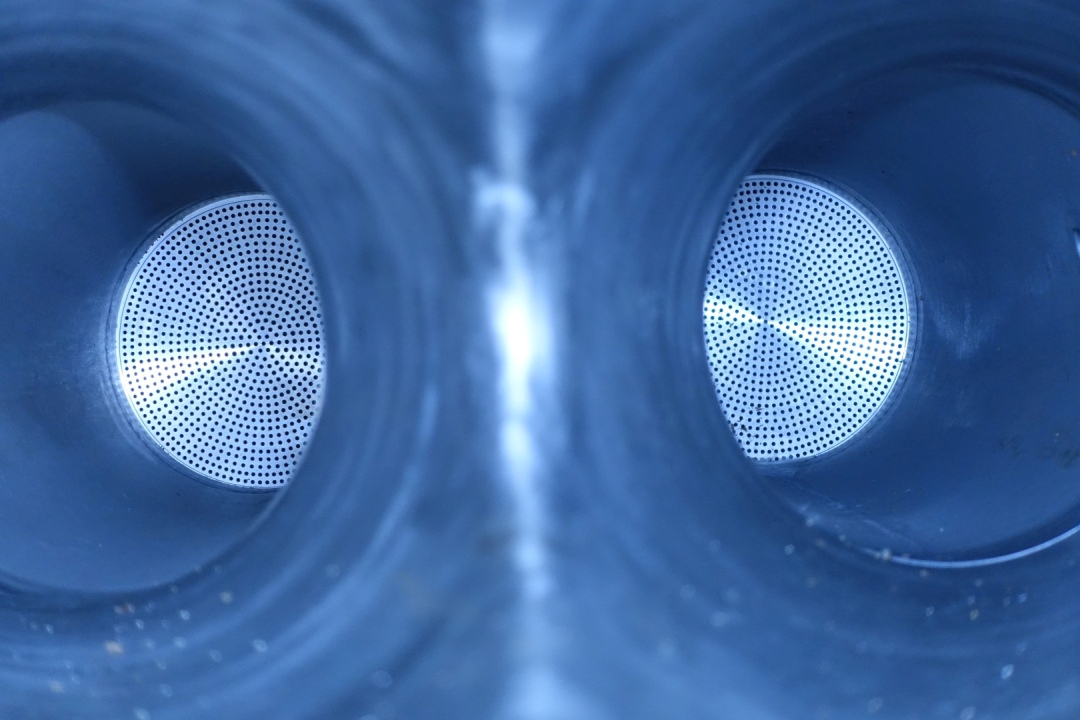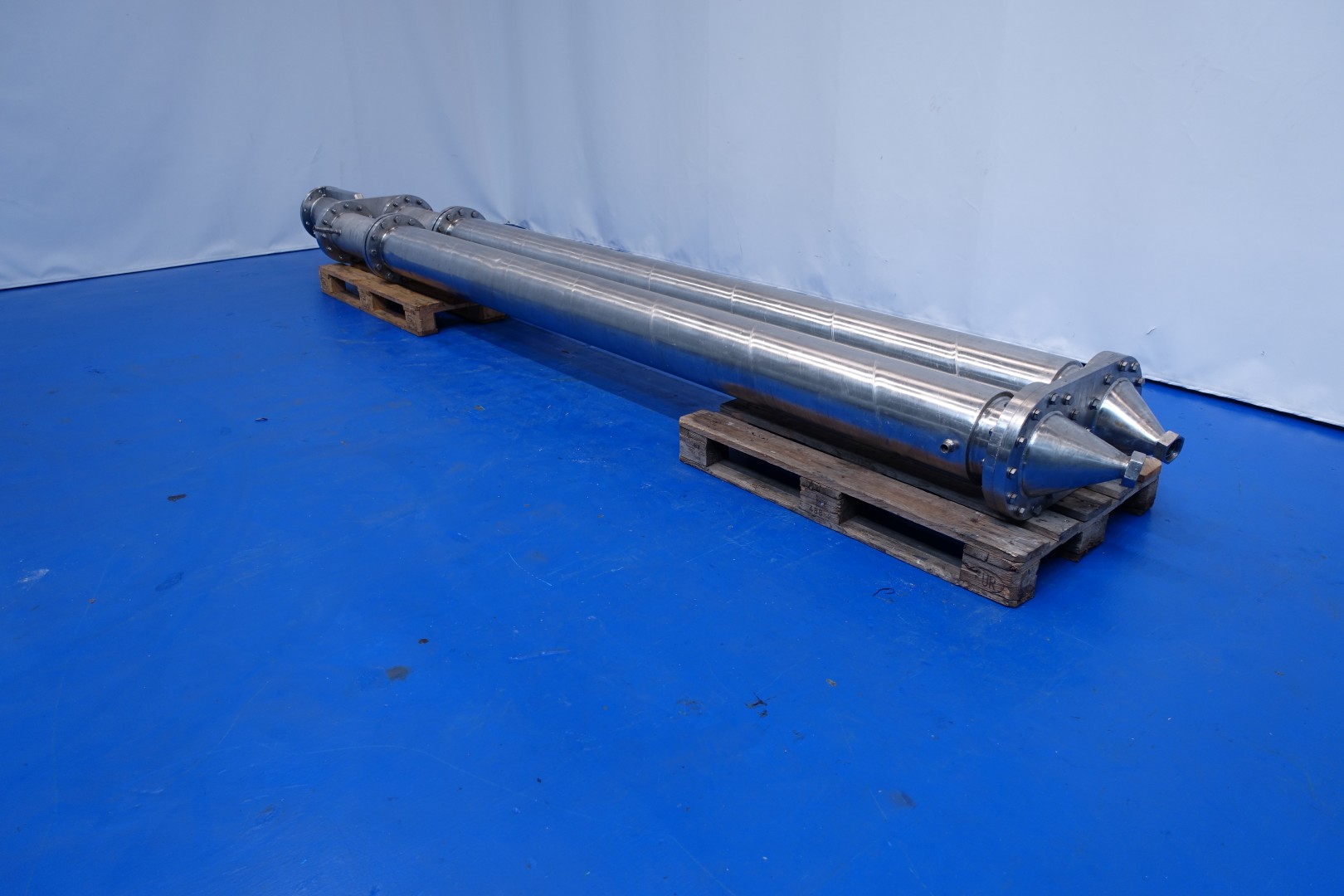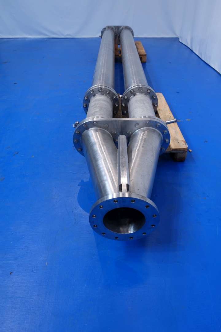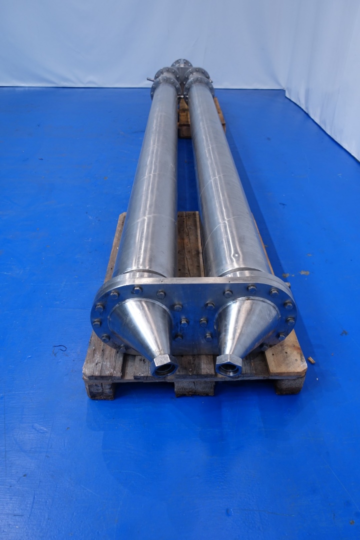 Resting tube, with filter, double resting tube in parallel for stand still during crystalisation on infeed of a wrapper. Double jacketed. With throuser piece on outlet, switch valve on inlet can be offered on request. Volume per tube ± 150 ltr total 300ltr + 30ltr in/outfeed piece. With 2x filter flange: holes 2mm. Inner tube diameter 20,5 cm - outer flange diameter 34 cm - length total 500 cm. Connections input side: 2x RJT 2". Total dimensions: 500x70x50 (lxwxh) cm - weight: 595 kg.