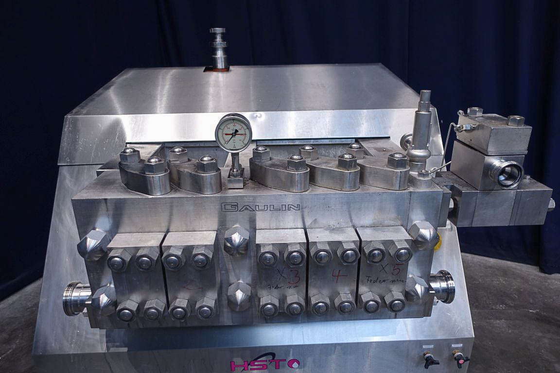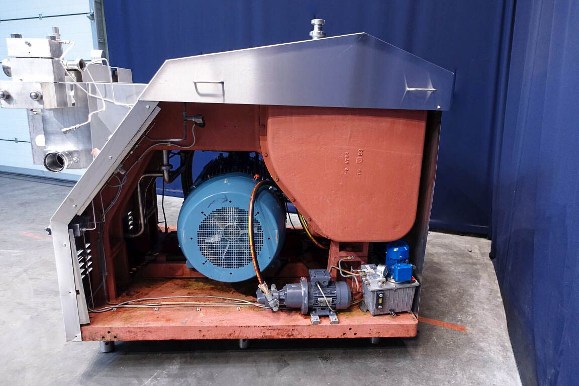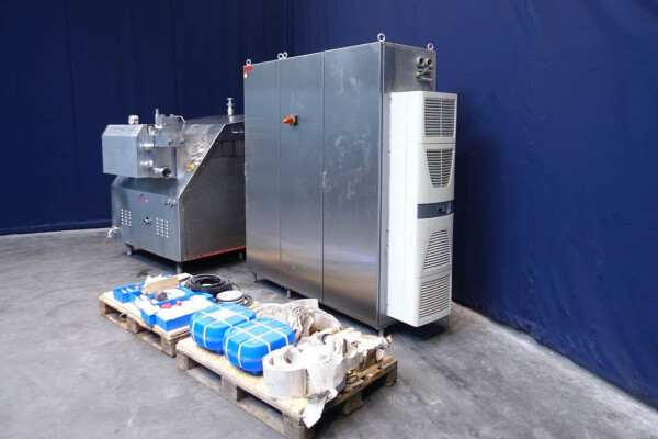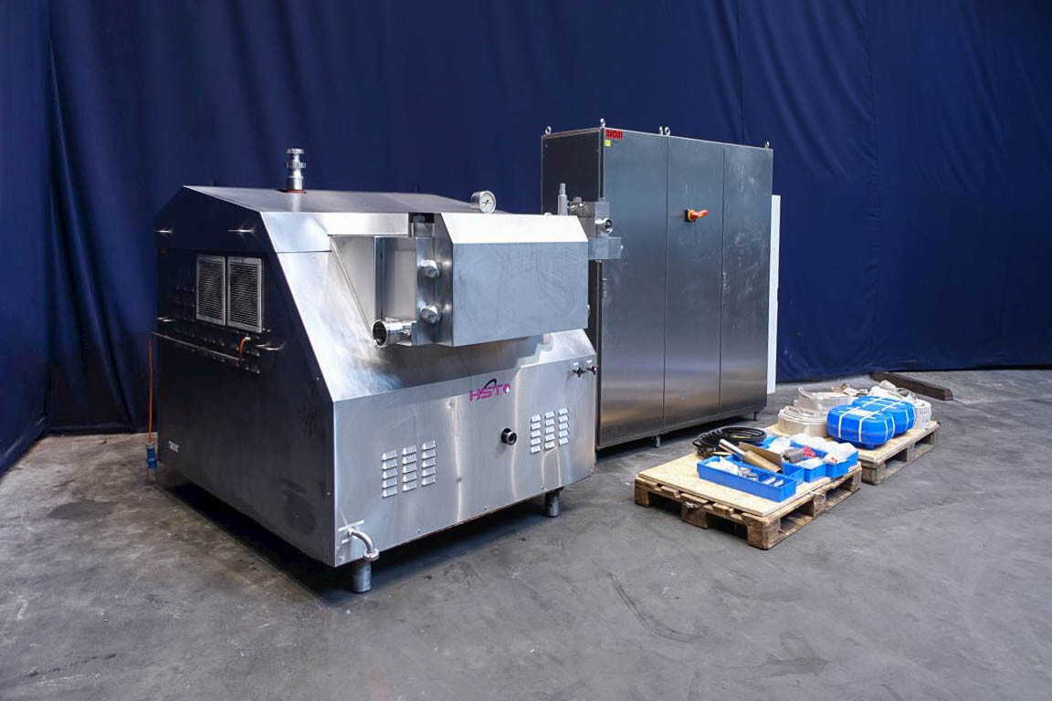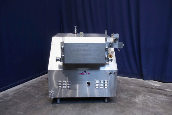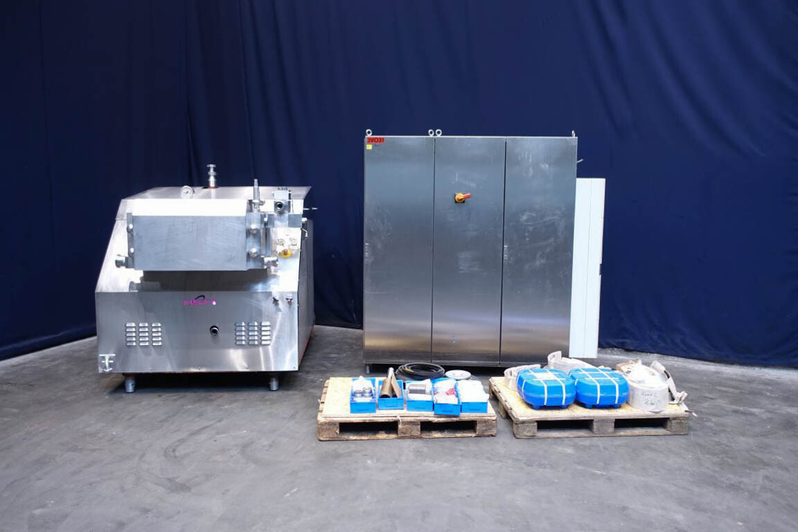 Hogedruk homogenisator. Gereviseerd door HST Maschinenbau Duitsland in 2013. 2 traps met handmatige drukregeling. 5 pistons. Piston diameter: 2 3/4''. RVS bekleed. Aansluitingen: 80 mm/50 mm, DIN. Vrijstaand RVS Rittal schakelkast met frequentieomvormer, Emerson M701 en een koelunit. Overdrukklep. Manometer op uitlaat. 2 zij-inlaten. Inclusief een grote partij nieuwe reserveonderdelen. Inclusief handleiding en onderdelenlijst in het Duits.