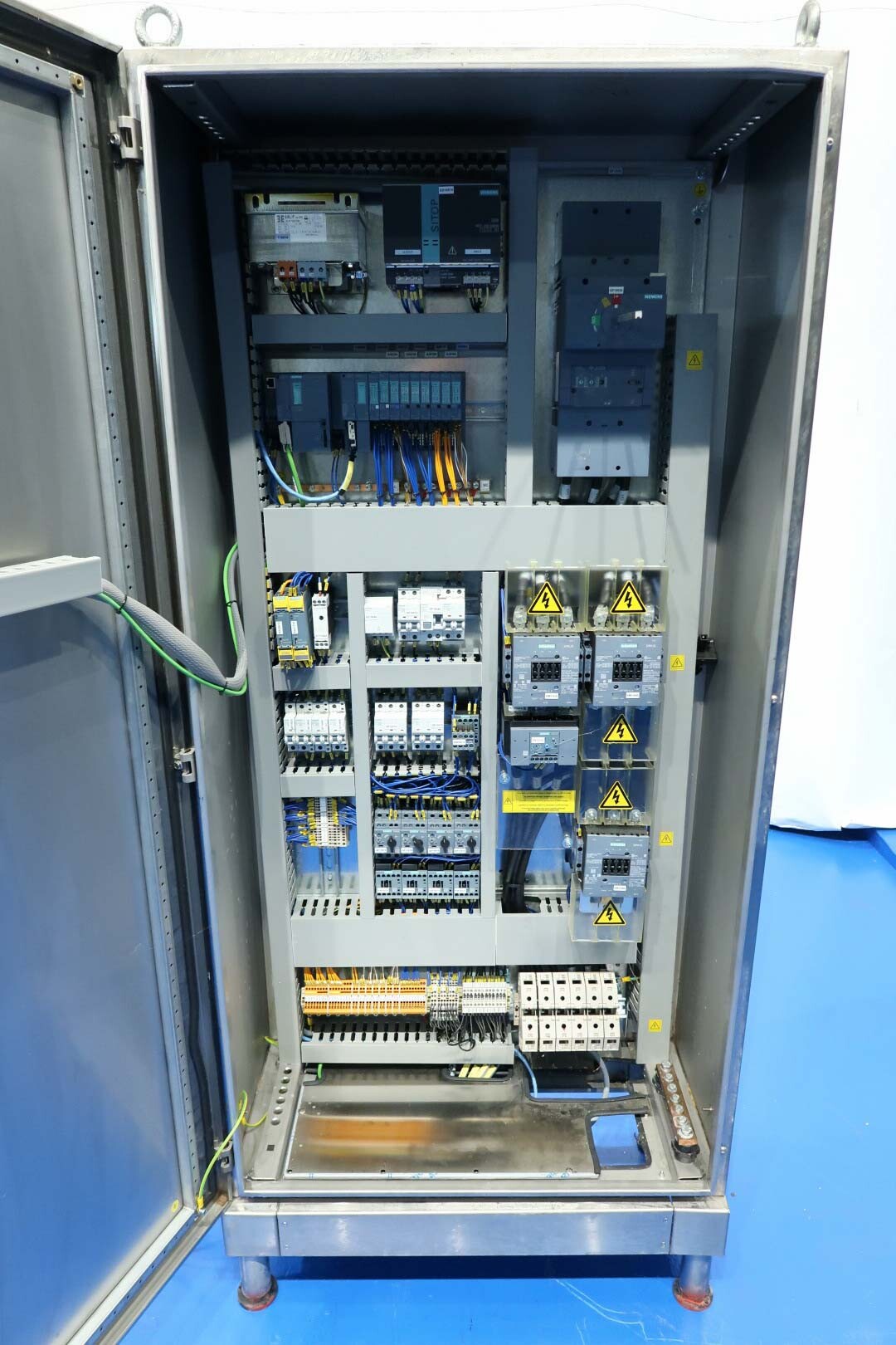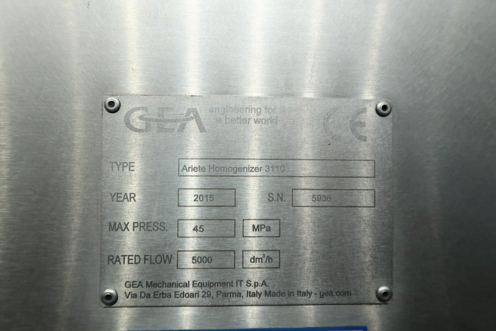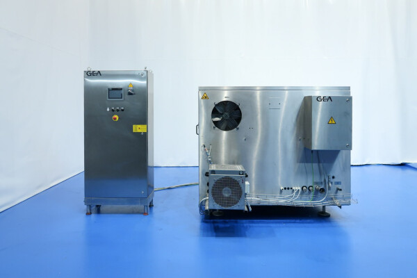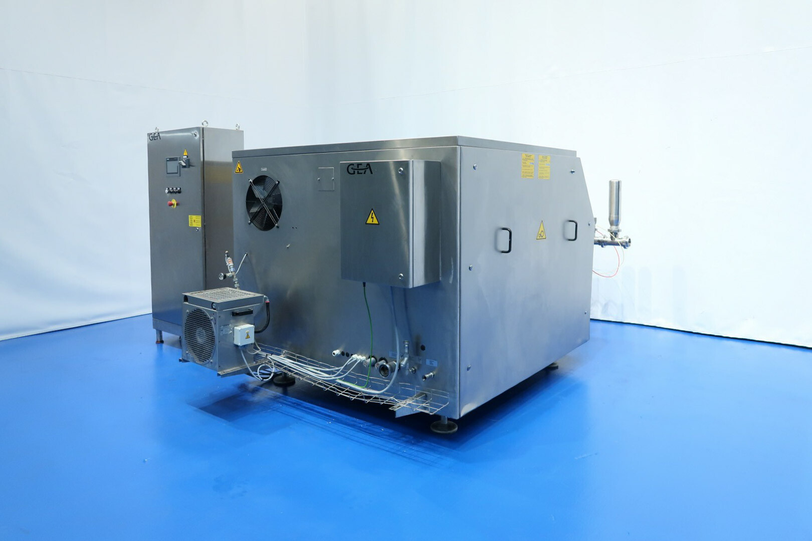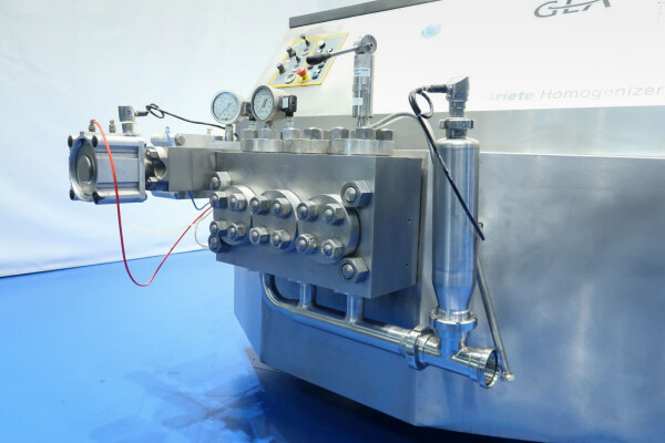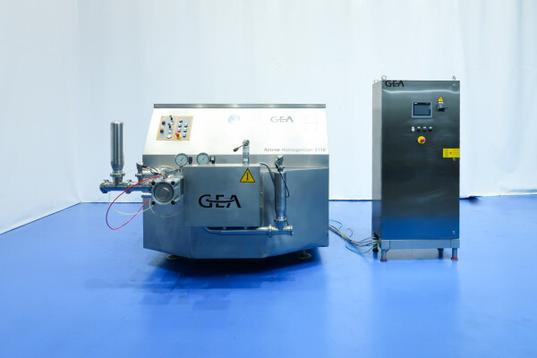 Hogedrukhomogenisator. 2 trappen met pneumatische drukregeling. 3 keramische zuigers, zuigerdiameter: 55 mm en slag: 100 mm. Roestvrij staal bekleed met geluiddempend materiaal. Aansluitingen: 2 x 3" Din. Huidig motorvermogen: 132 kW en maximale druk in stroomconfiguratie met deze motor 450 bar. Vrijstaand bedieningspaneel met Siemens Simatic ET 200SP-besturing. Kleine schakelkast op machine met Siemens Simatic ET 200SP-besturing. Met overdrukventiel (ingesteld op 540 bar). Manometer op 1e en 2e trap. Elektronische druktransmitter op in- en uitlaat. Stromingsschakelaar op koelwater. Pulsatiedemper op inlaat. Drukregeling op afstand. Met reserve-pulsatiedemper en overdrukventiel. Documentatie: gebruiksaanwijzing, elektrisch schema, Onderdelenlijst en servicerapport. Afmetingen bedieningspaneel: 80x40x187 (lxbxh) cm.