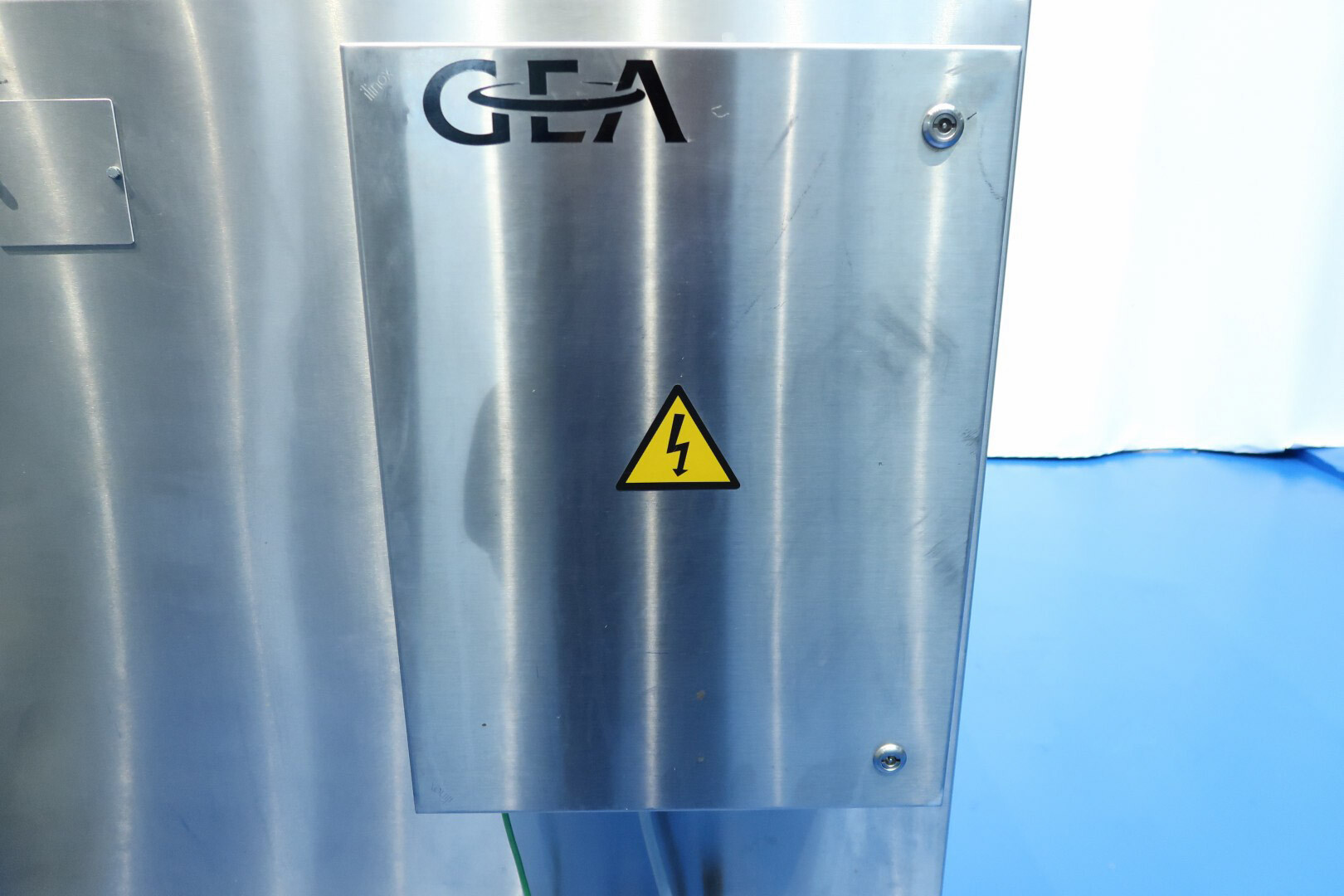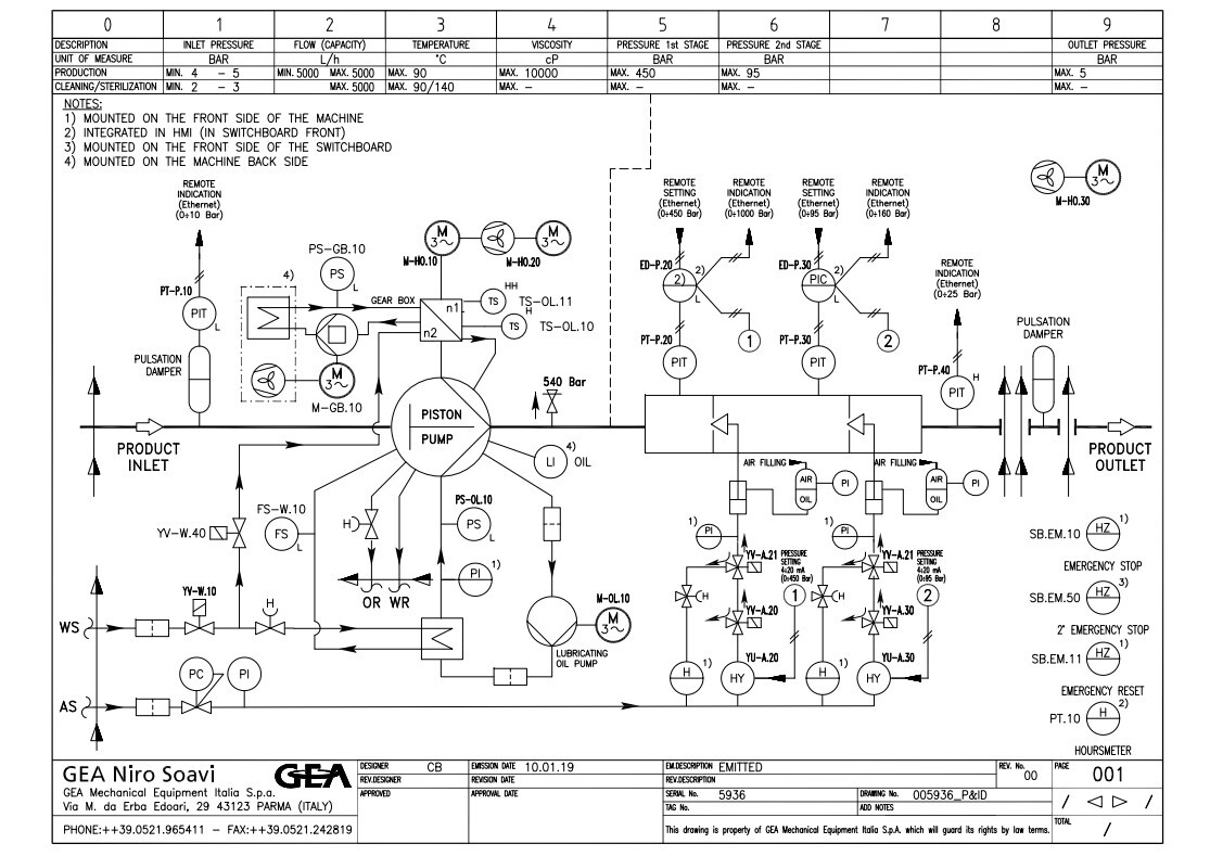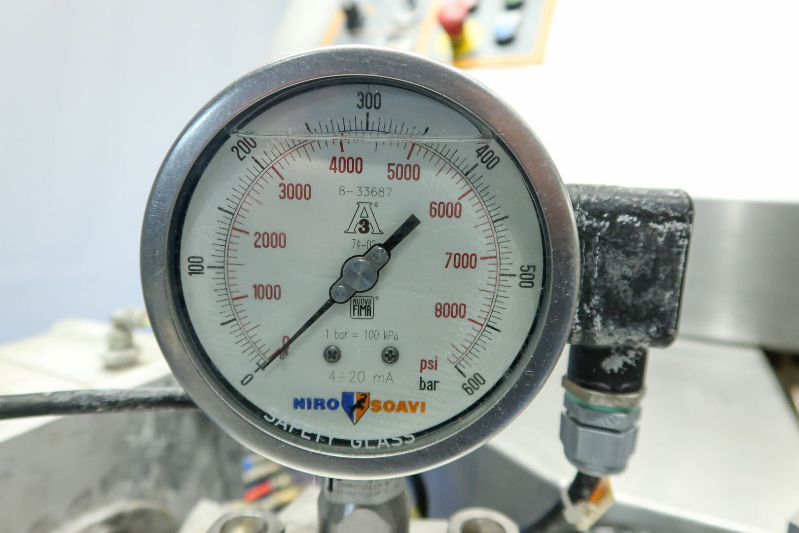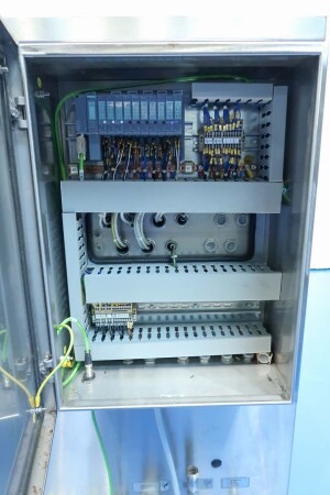 Hogedrukhomogenisator. 2 trappen met pneumatische drukregeling. 3 keramische zuigers, zuigerdiameter: 55 mm en slag: 100 mm. Roestvrij staal bekleed met geluiddempend materiaal. Aansluitingen: 2 x 3" Din. Huidig motorvermogen: 132 kW en maximale druk in stroomconfiguratie met deze motor 450 bar. Vrijstaand bedieningspaneel met Siemens Simatic ET 200SP-besturing. Kleine schakelkast op machine met Siemens Simatic ET 200SP-besturing. Met overdrukventiel (ingesteld op 540 bar). Manometer op 1e en 2e trap. Elektronische druktransmitter op in- en uitlaat. Stromingsschakelaar op koelwater. Pulsatiedemper op inlaat. Drukregeling op afstand. Met reserve-pulsatiedemper en overdrukventiel. Documentatie: gebruiksaanwijzing, elektrisch schema, Onderdelenlijst en servicerapport. Afmetingen bedieningspaneel: 80x40x187 (lxbxh) cm.