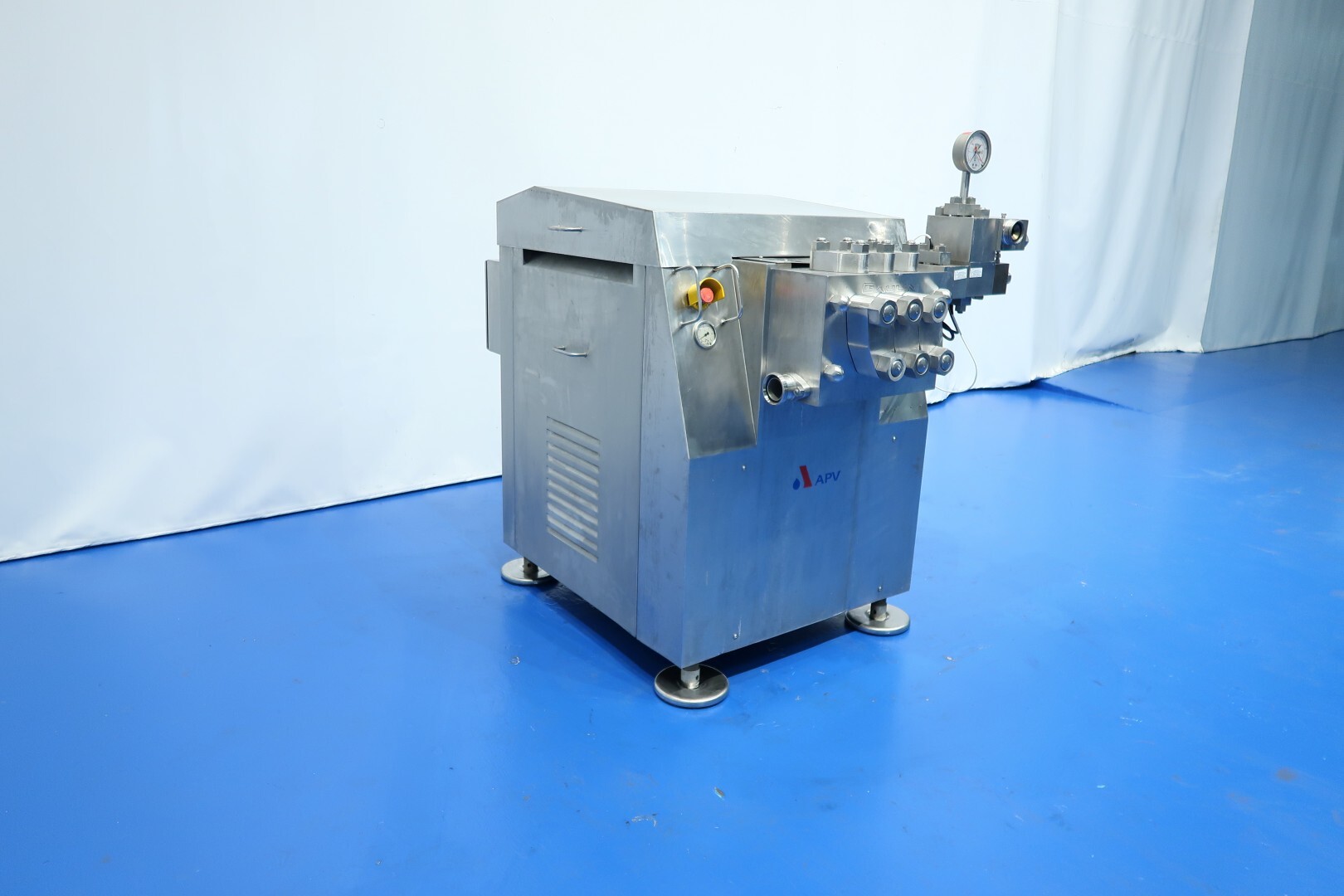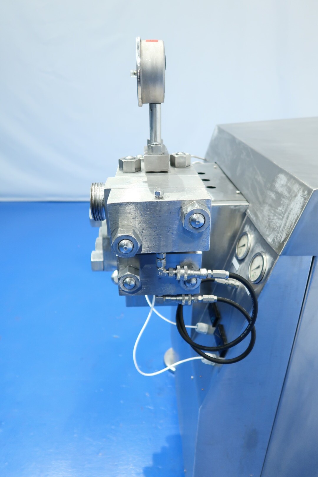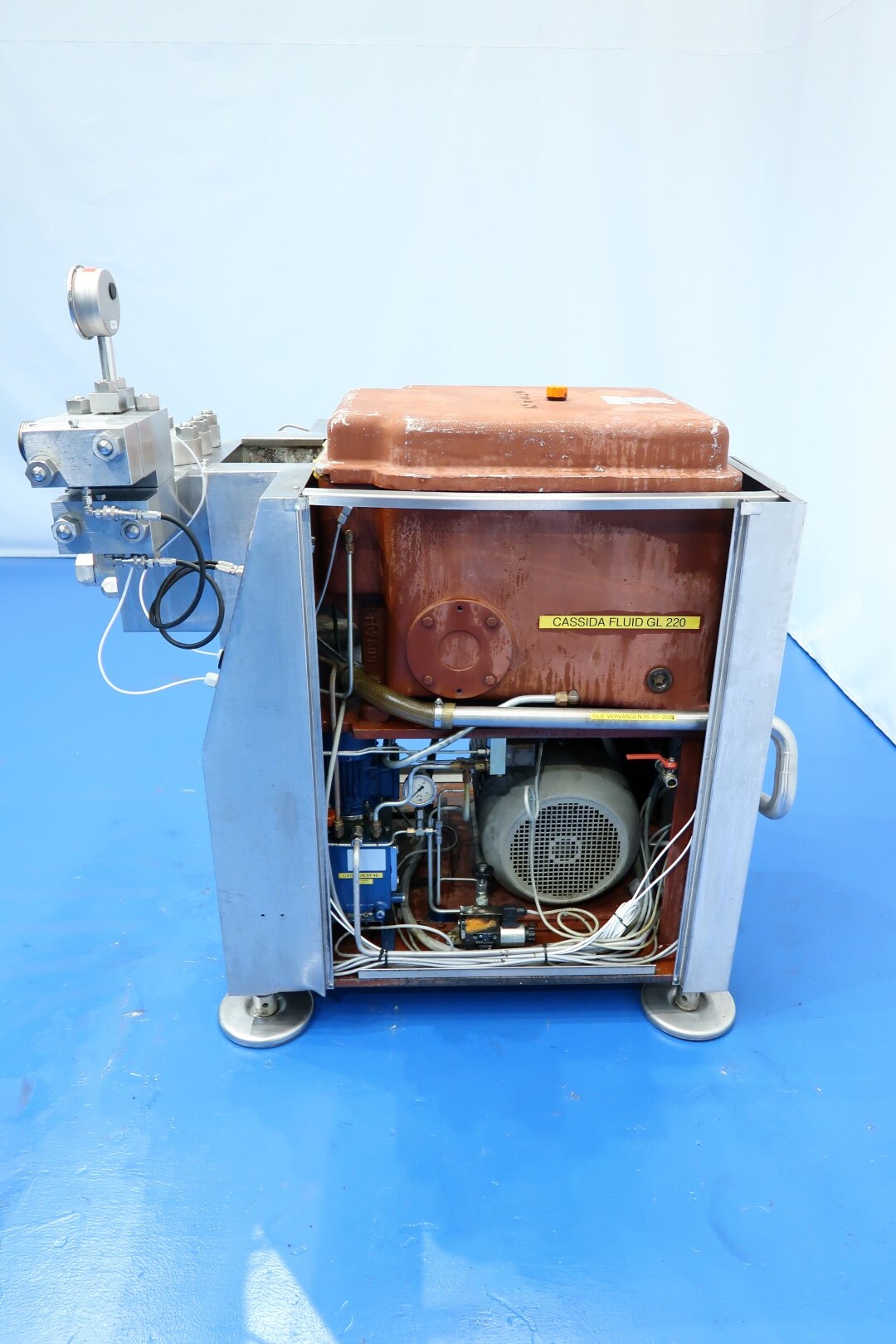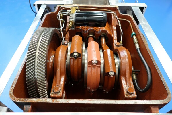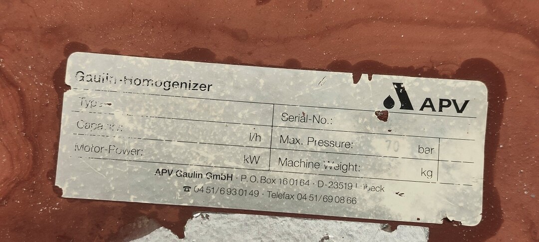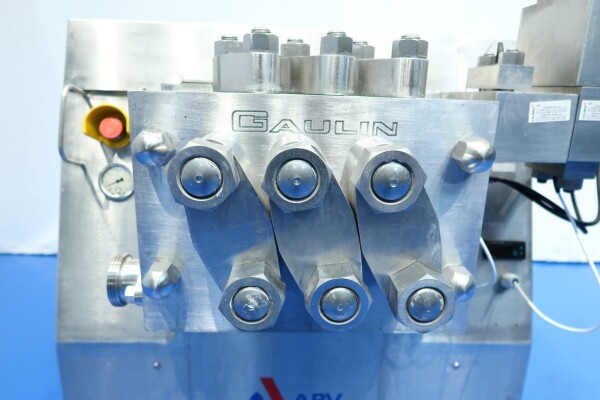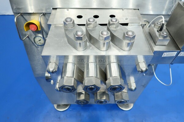 Hogedrukhomogenisator met 2 fasen, uitgerust met kogelkranen en keramische zuigers, speciaal ontworpen voor viskeuze en schurende producten, of producten die vezels of kleine deeltjes bevatten. Hydraulische drukregeling is inbegrepen. De machine heeft 3 keramische zuigers met een diameter van 49,2 mm (1 15/16"). De aansluitingen zijn DN50 DIN voor de inlaat en DN40 DIN voor de uitlaat. Het huidige motorvermogen is 18,5 kW en levert een maximale druk van 140 bar in de huidige configuratie.