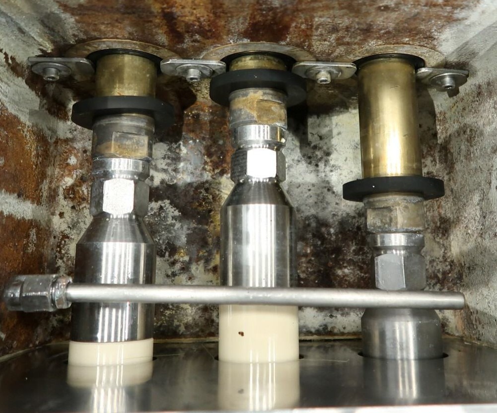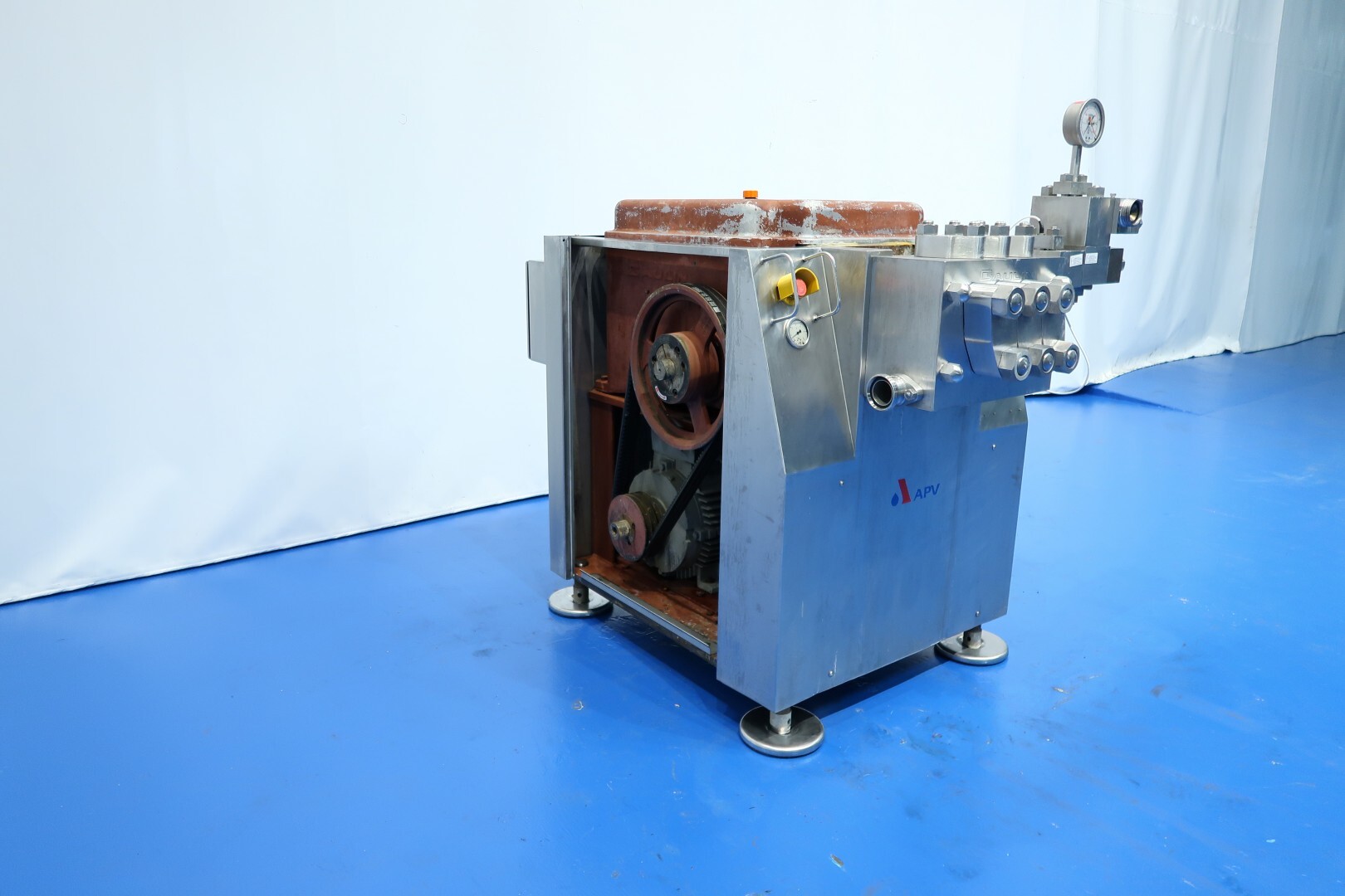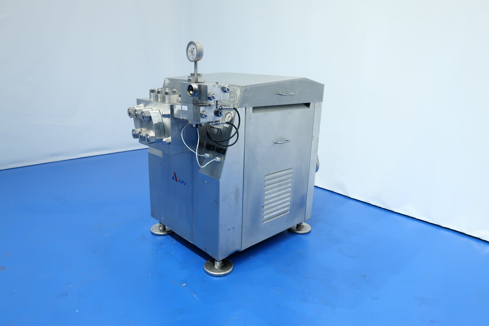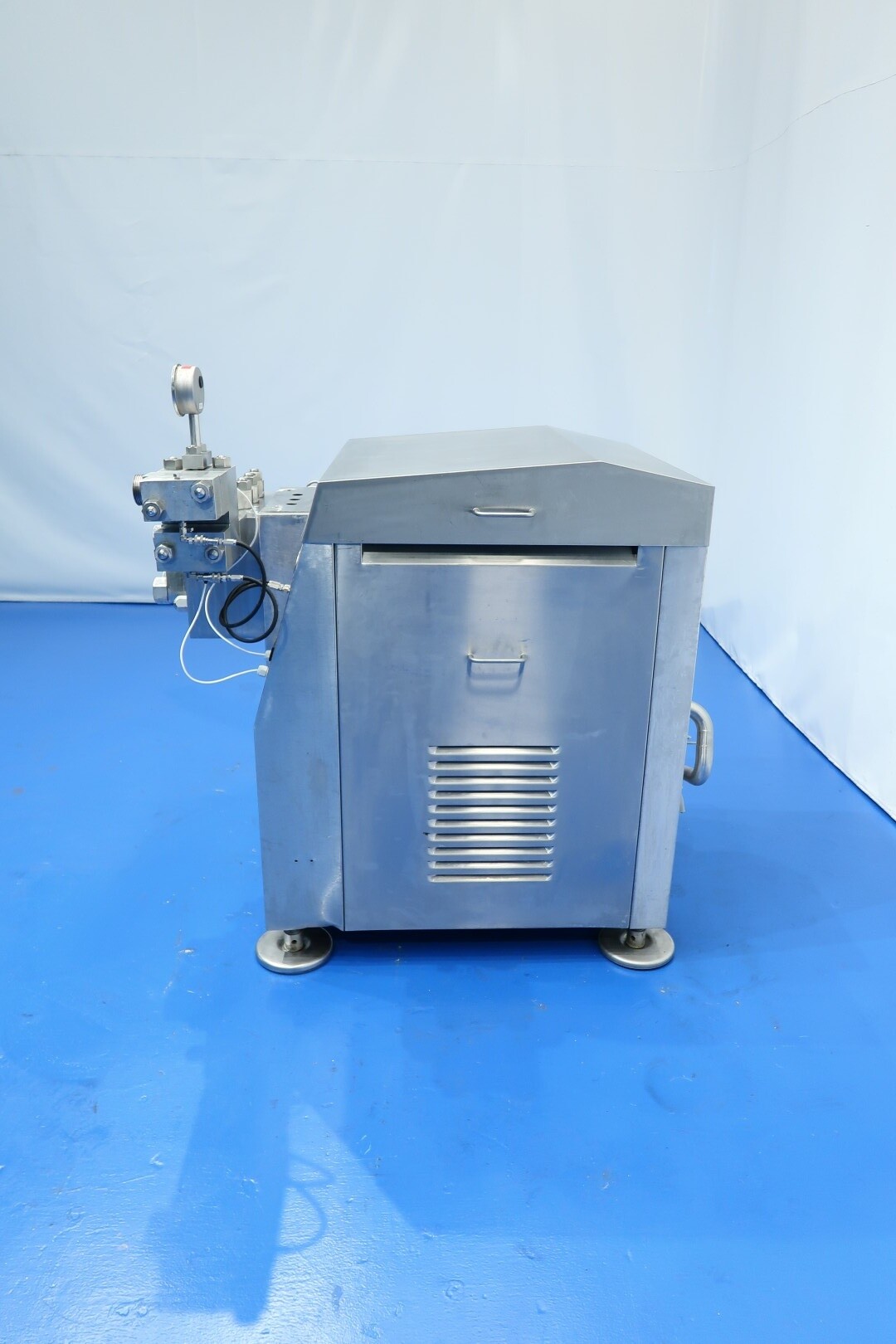 Hogedrukhomogenisator met 2 fasen, uitgerust met kogelkranen en keramische zuigers, speciaal ontworpen voor viskeuze en schurende producten, of producten die vezels of kleine deeltjes bevatten. Hydraulische drukregeling is inbegrepen. De machine heeft 3 keramische zuigers met een diameter van 49,2 mm (1 15/16"). De aansluitingen zijn DN50 DIN voor de inlaat en DN40 DIN voor de uitlaat. Het huidige motorvermogen is 18,5 kW en levert een maximale druk van 140 bar in de huidige configuratie.
