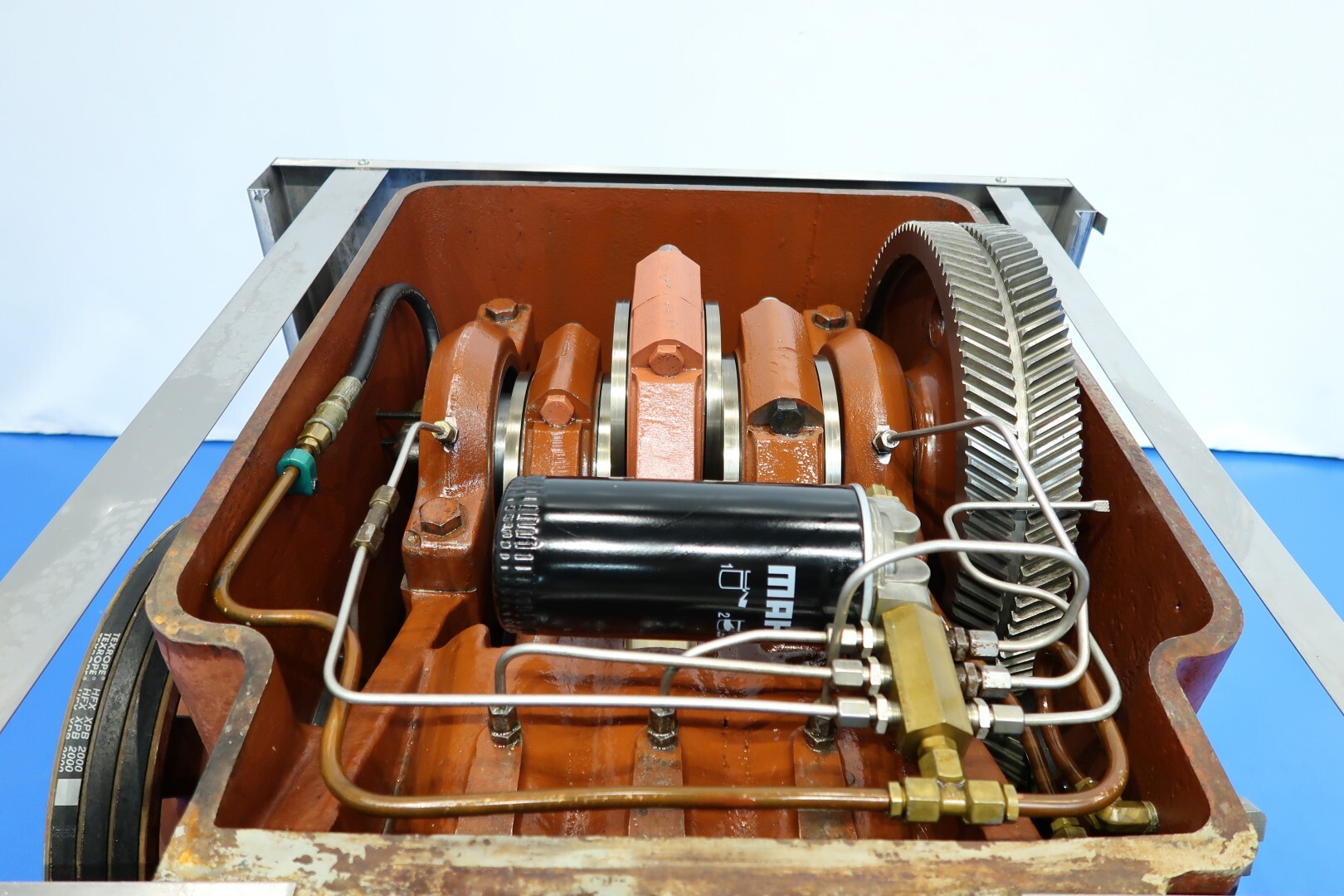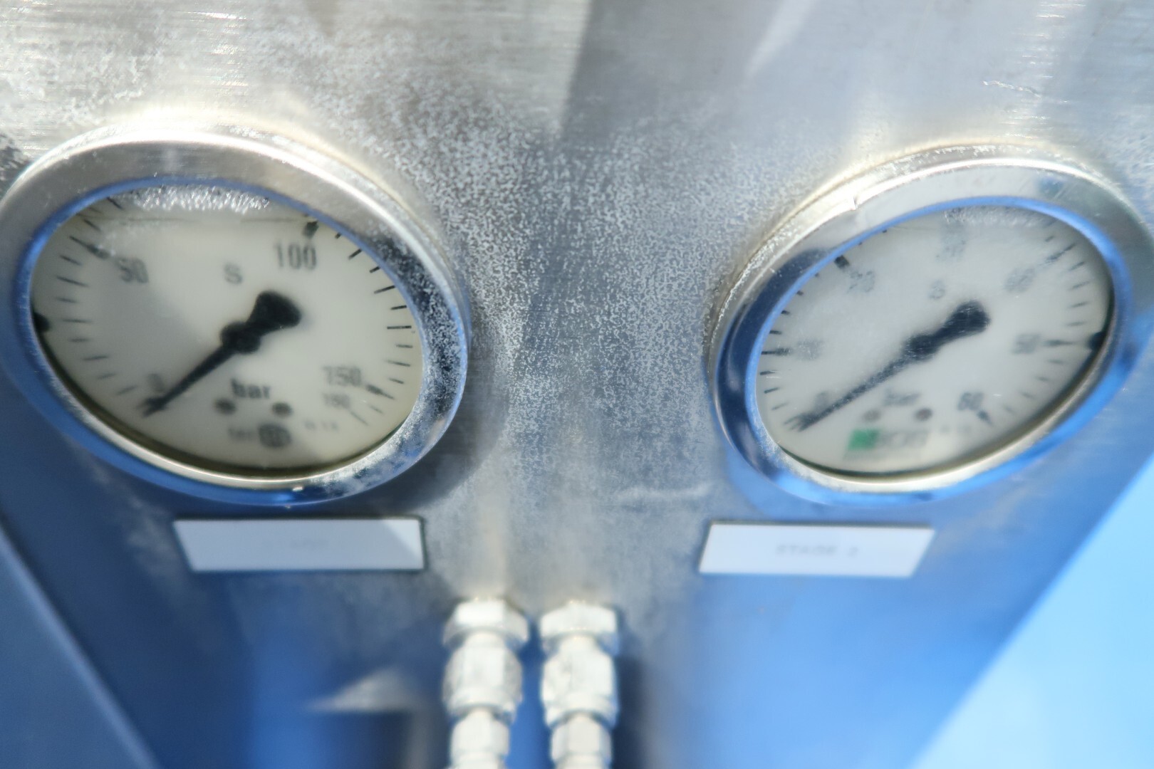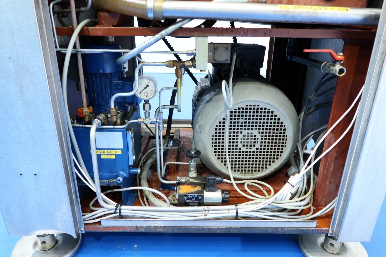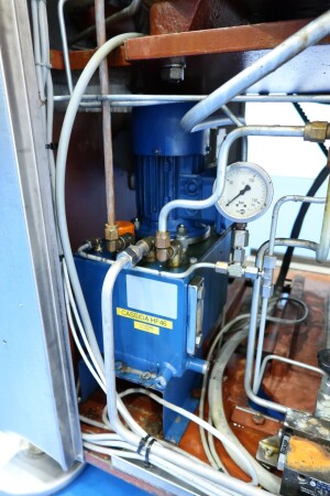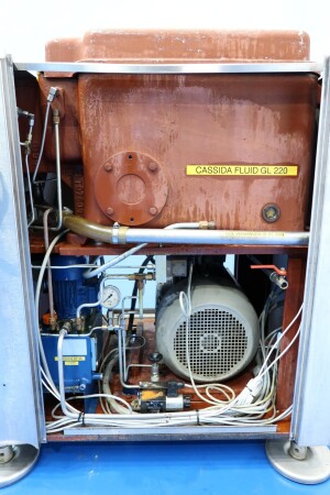 Op het hoogste drukpunt is een manometer geïnstalleerd, samen met twee elektronische druktransmitters voor de eerste en tweede fase, waarvan de waarden op de machine worden weergegeven. Het systeem omvat een oliecirculatiepomp en een hoge viscositeitspomp (HVA) met oliekoelers, evenals een stromingsschakelaar voor het koelwater.