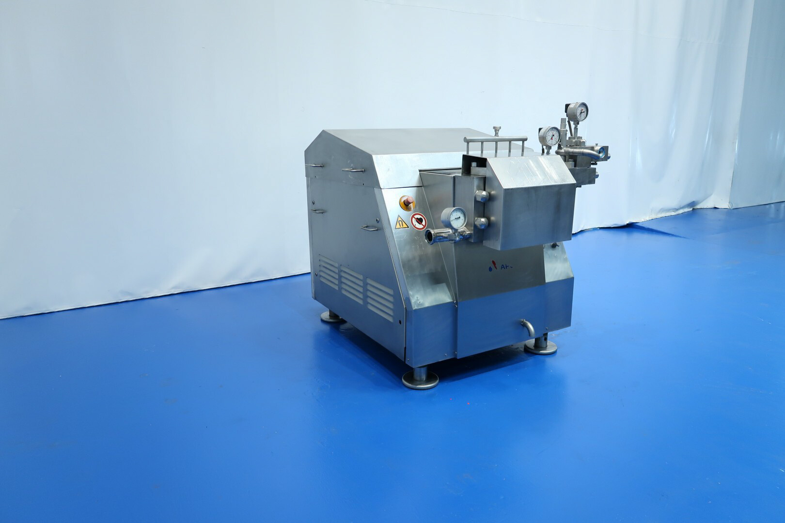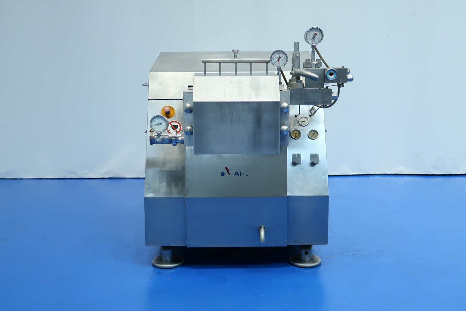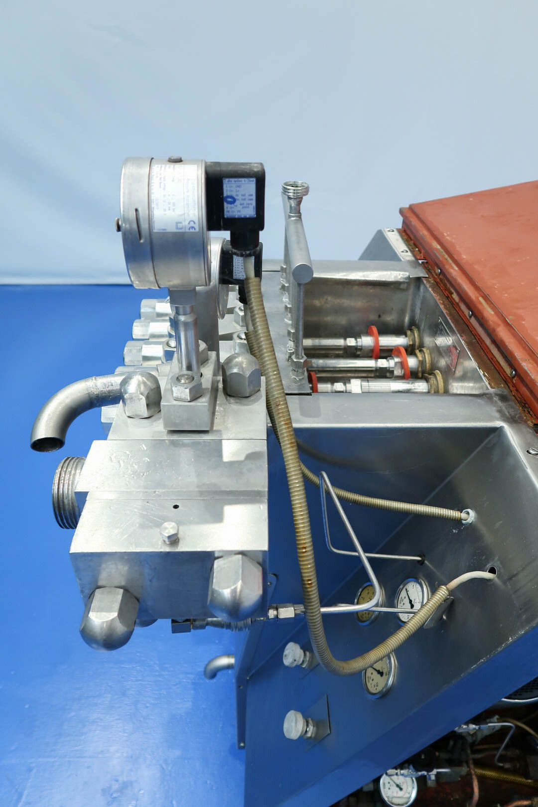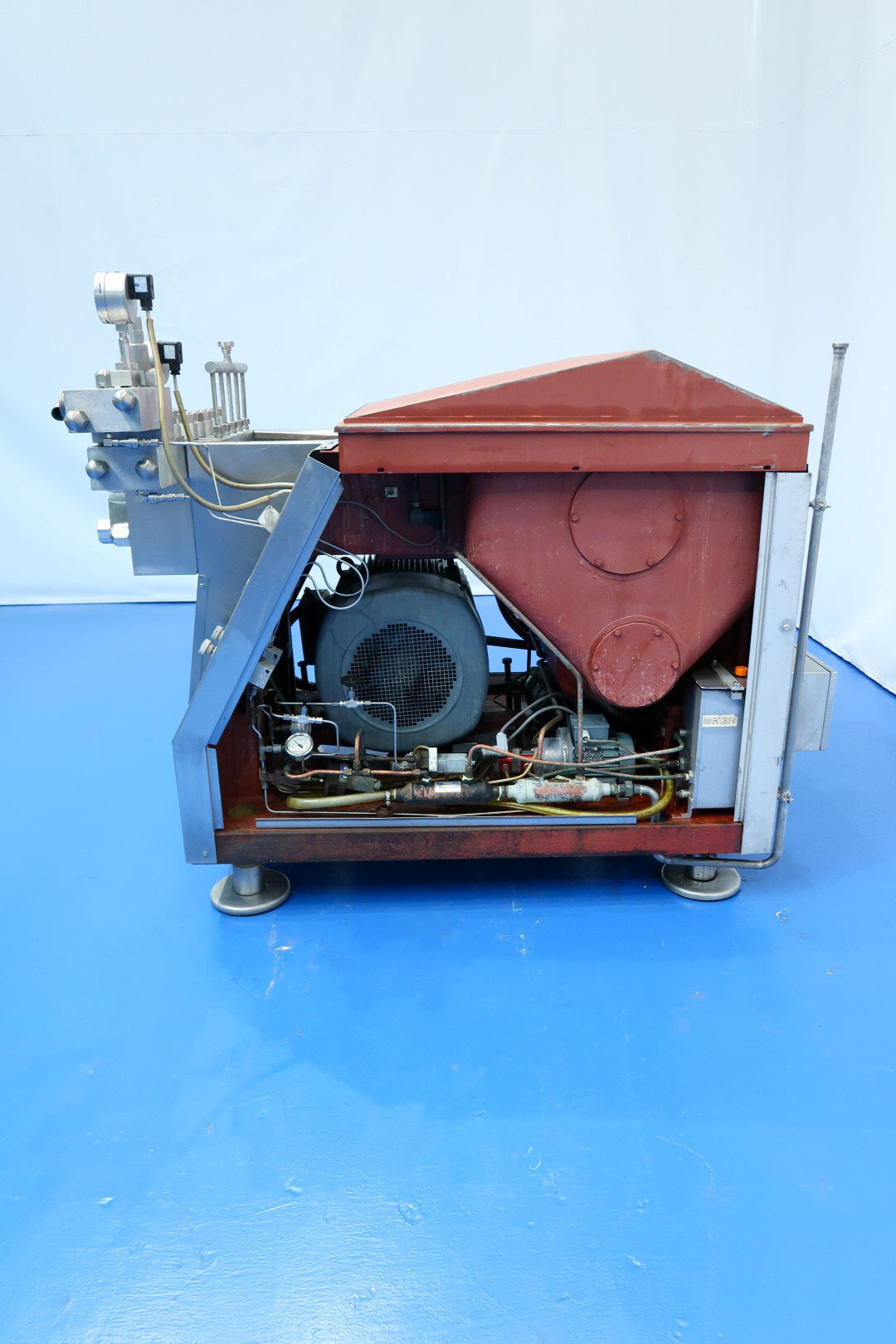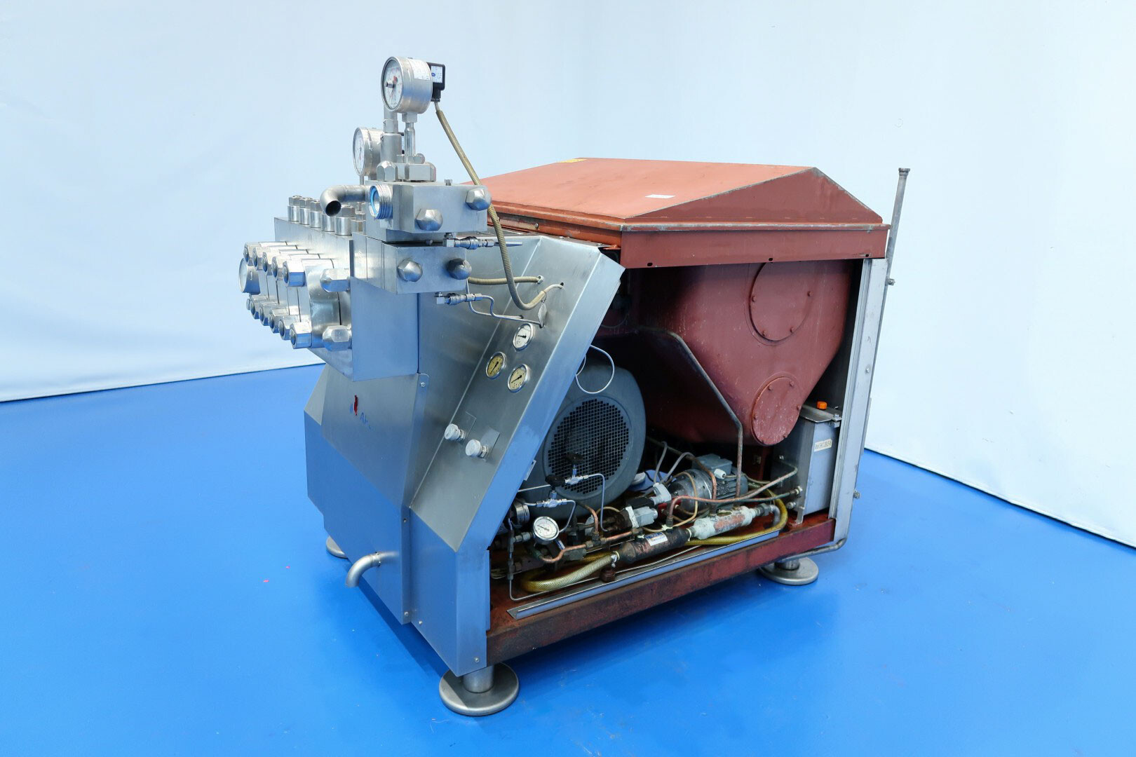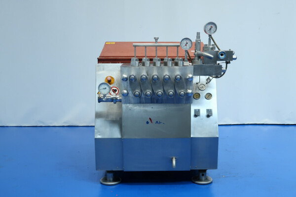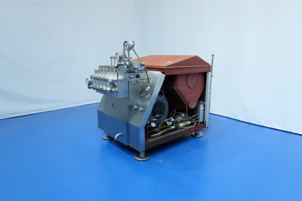 Hogedrukhomogenisator met kogelklep voor viskeuze producten, uitgerust met twee fasen en hydraulische drukregeling.De machine werkt met vijf zuigers, elk met een diameter van 38 mm (1,5") en een slag van 115 mm, en is volledig met roestvrij staal bekleed. Hij wordt aangedreven door een 55 kW motor, waardoor een maximale werkdruk van 280 bar in de huidige configuratie mogelijk is.De machine is uitgerust met een overdrukventiel, een inlaatfilter, drukmeters op zowel de inlaat als de uitlaat, een elektronische drukzender na de eerste trap, en een elektronische drukzender met drukmeter na de tweede trap. Er is een koelwaterstroomschakelaar geïnstalleerd, evenals pulsatiedempers met membranen aan zowel de inlaat als de uitlaat. Monsterkleppen zijn beschikbaar voor en na homogenisatie, en de machine heeft 2,5" DIN-inlaat- en uitlaataansluitingen.