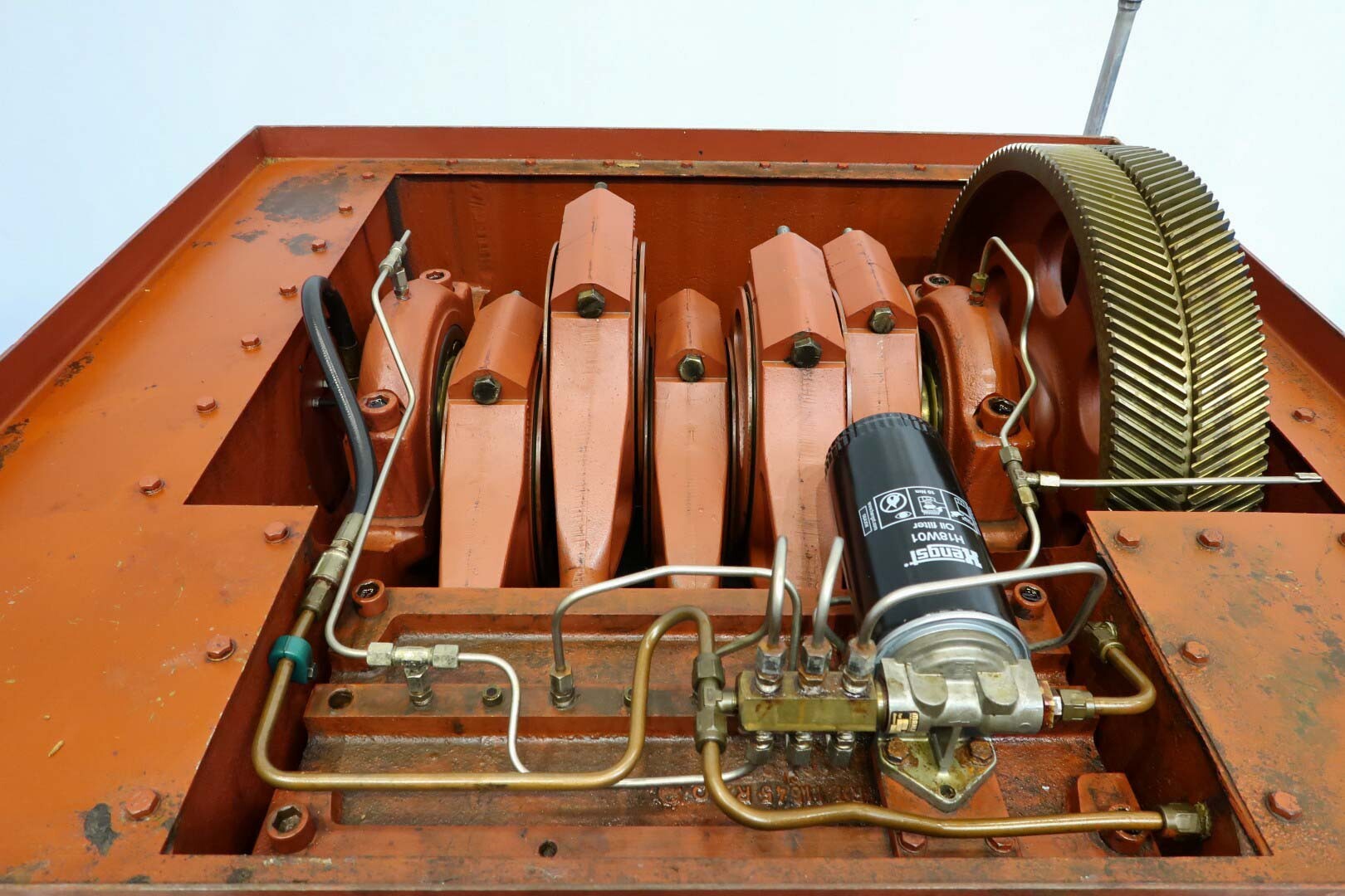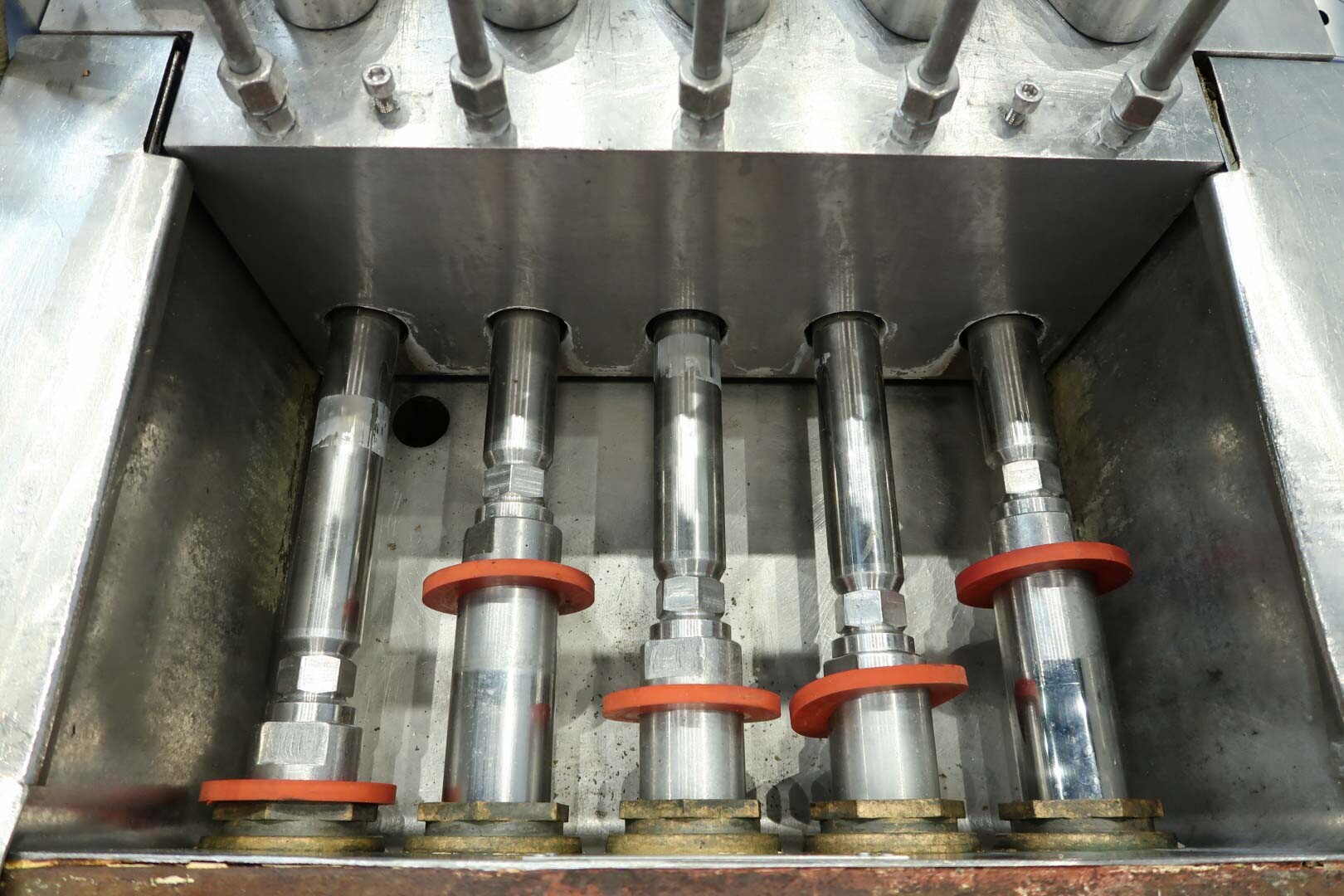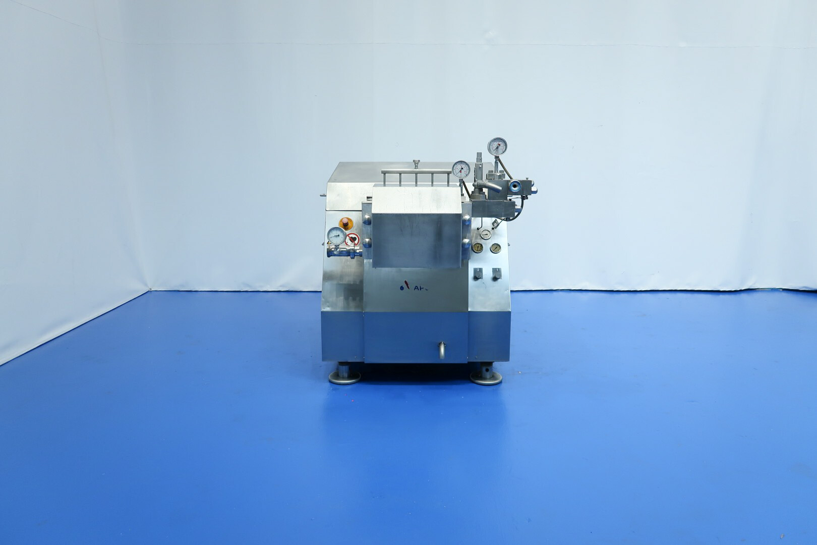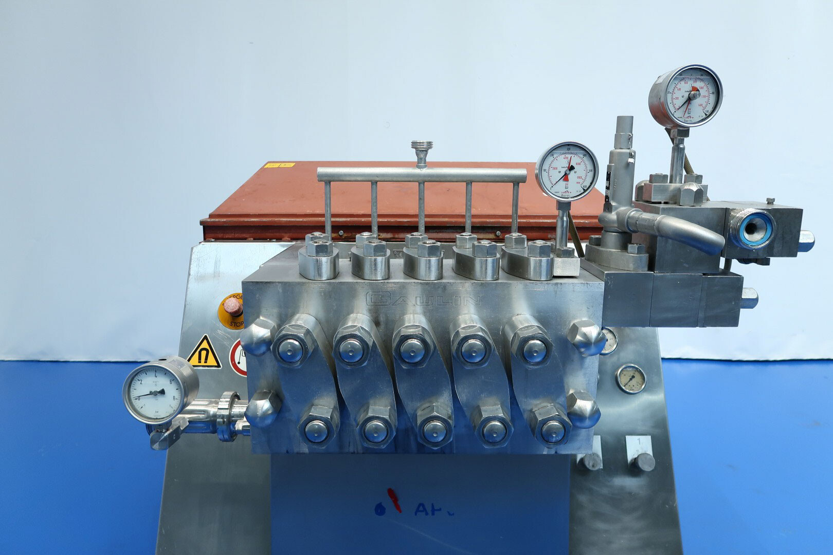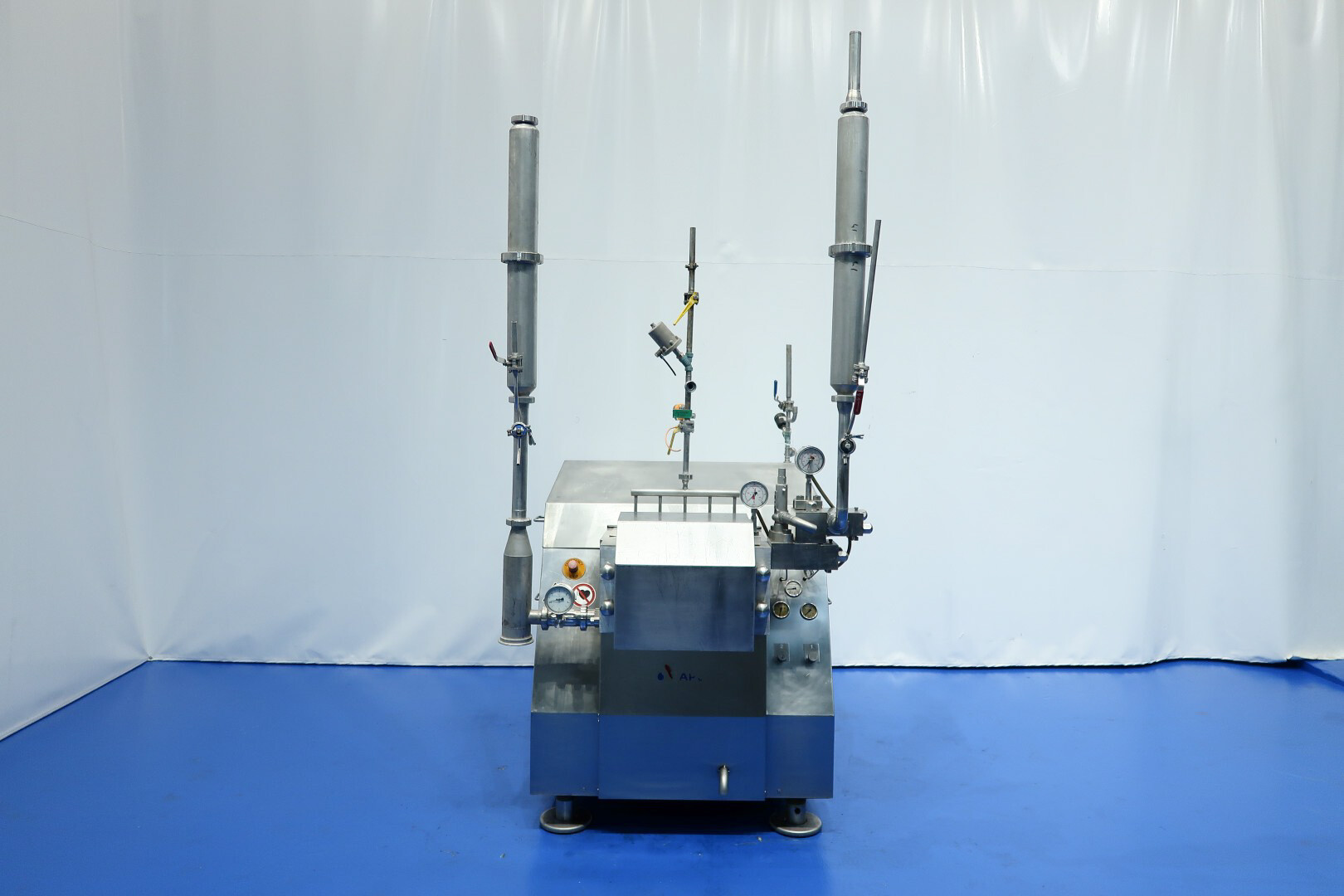 Hogedrukhomogenisator met kogelklep voor viskeuze producten, uitgerust met twee fasen en hydraulische drukregeling.De machine werkt met vijf zuigers, elk met een diameter van 38 mm (1,5") en een slag van 115 mm, en is volledig met roestvrij staal bekleed. Hij wordt aangedreven door een 55 kW motor, waardoor een maximale werkdruk van 280 bar in de huidige configuratie mogelijk is.De machine is uitgerust met een overdrukventiel, een inlaatfilter, drukmeters op zowel de inlaat als de uitlaat, een elektronische drukzender na de eerste trap, en een elektronische drukzender met drukmeter na de tweede trap. Er is een koelwaterstroomschakelaar geïnstalleerd, evenals pulsatiedempers met membranen aan zowel de inlaat als de uitlaat. Monsterkleppen zijn beschikbaar voor en na homogenisatie, en de machine heeft 2,5" DIN-inlaat- en uitlaataansluitingen.