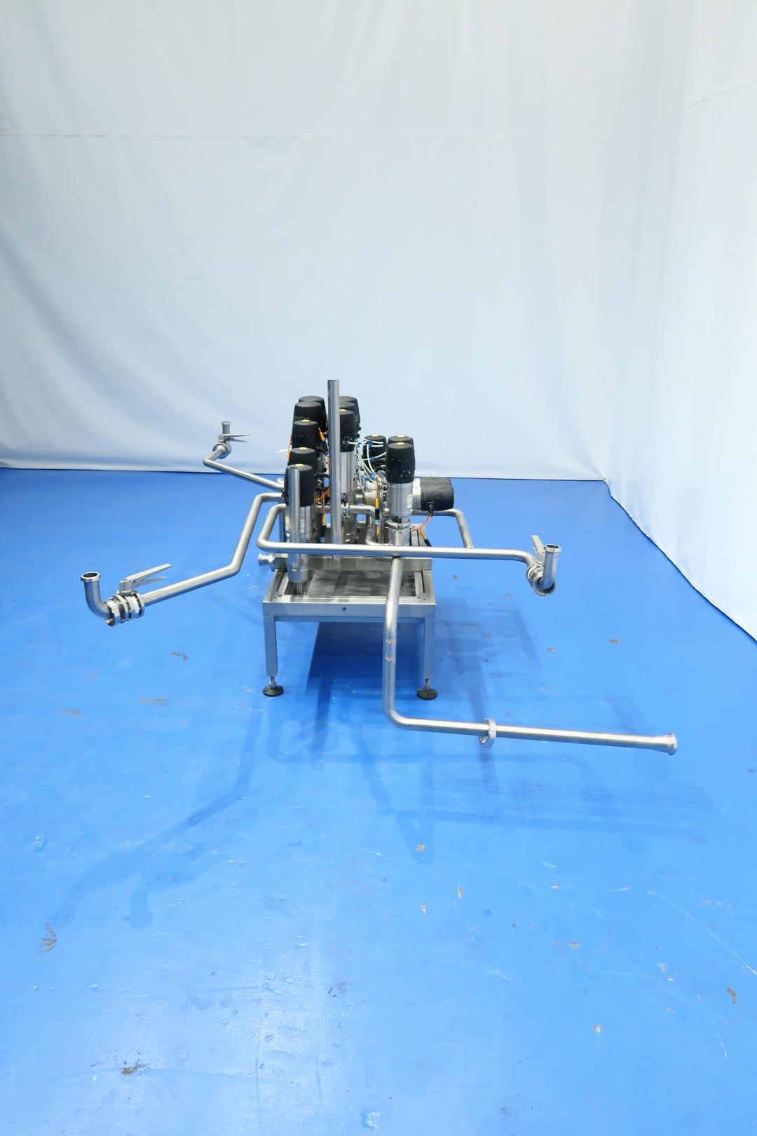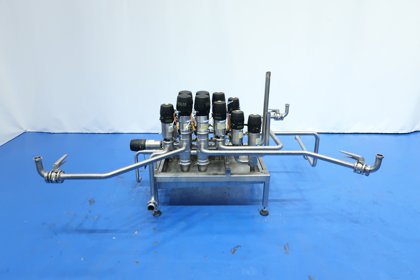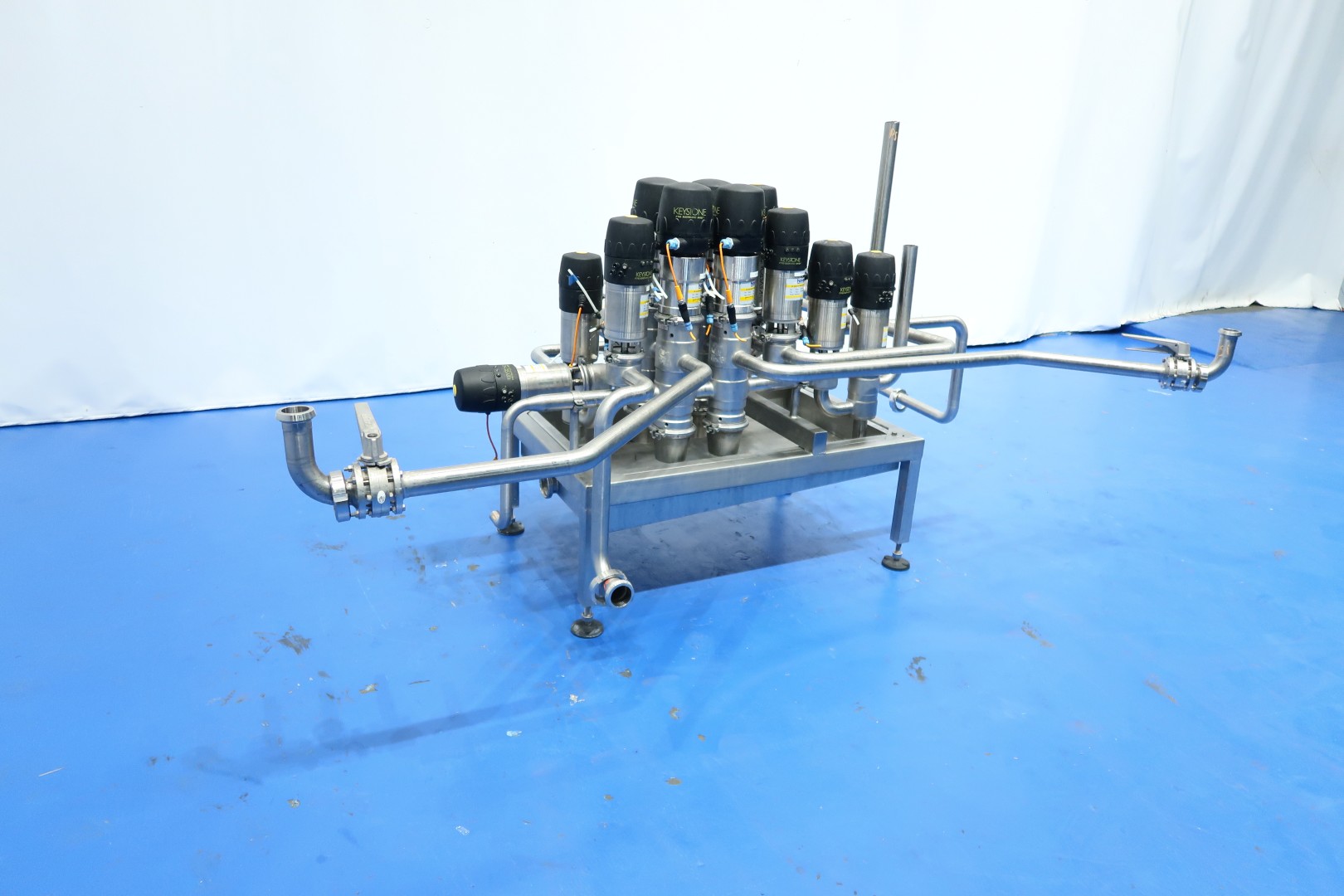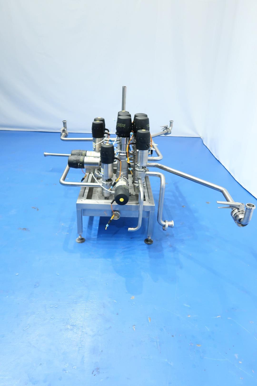 Product valve-manifold, air operated, DN40. With 15 x Hovap and Keyston Smart heads valves: 9x 2Way - 2x 3Way - 4x 4Way and 3x manual butterfly valve. 9 Mixproof valves. Connections DN40. On stainless steel frame with leakage plate with 4 x adjustable feet. Total dimensions: 230x180x135 (lxwxh) cm - weight: 200 kg.