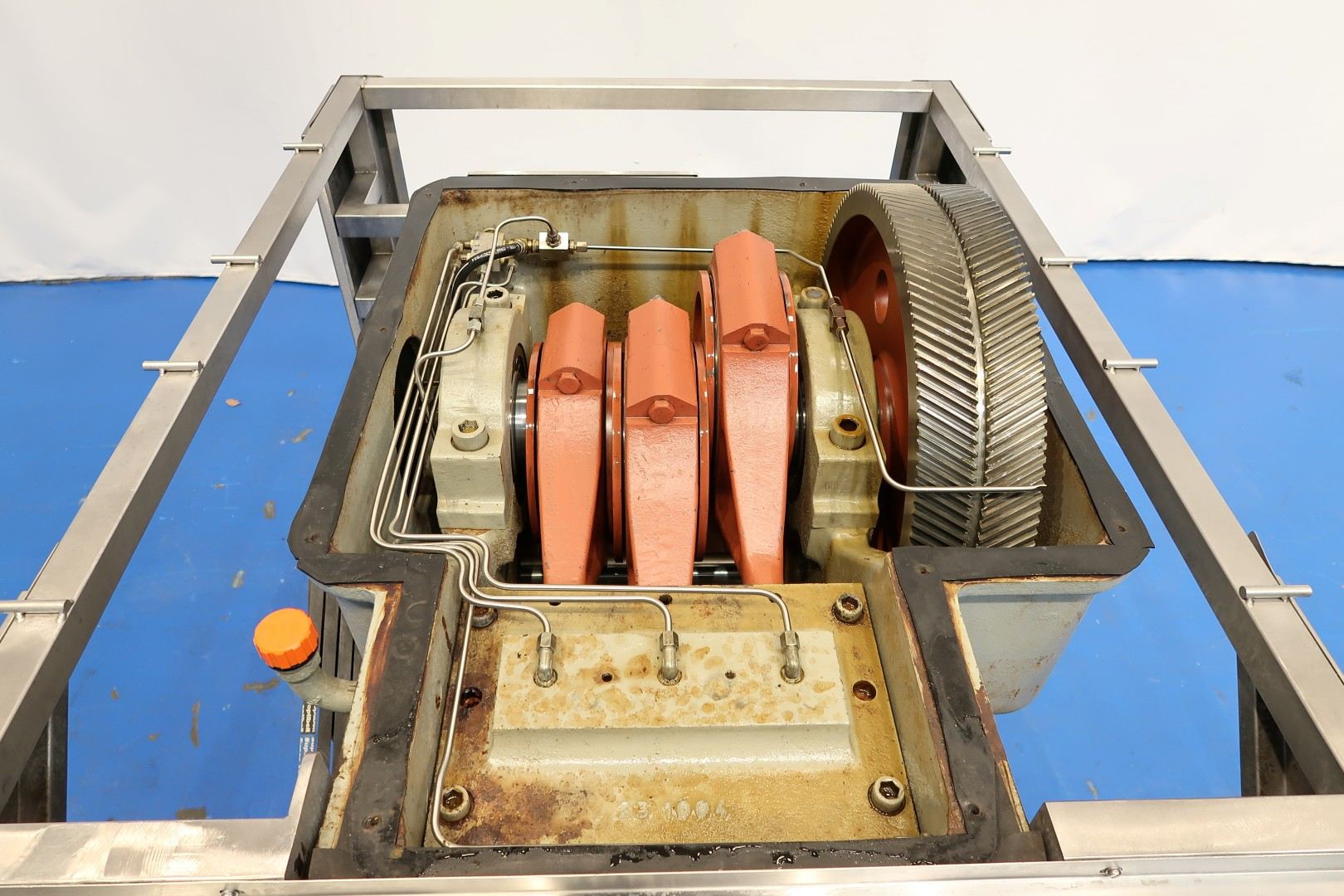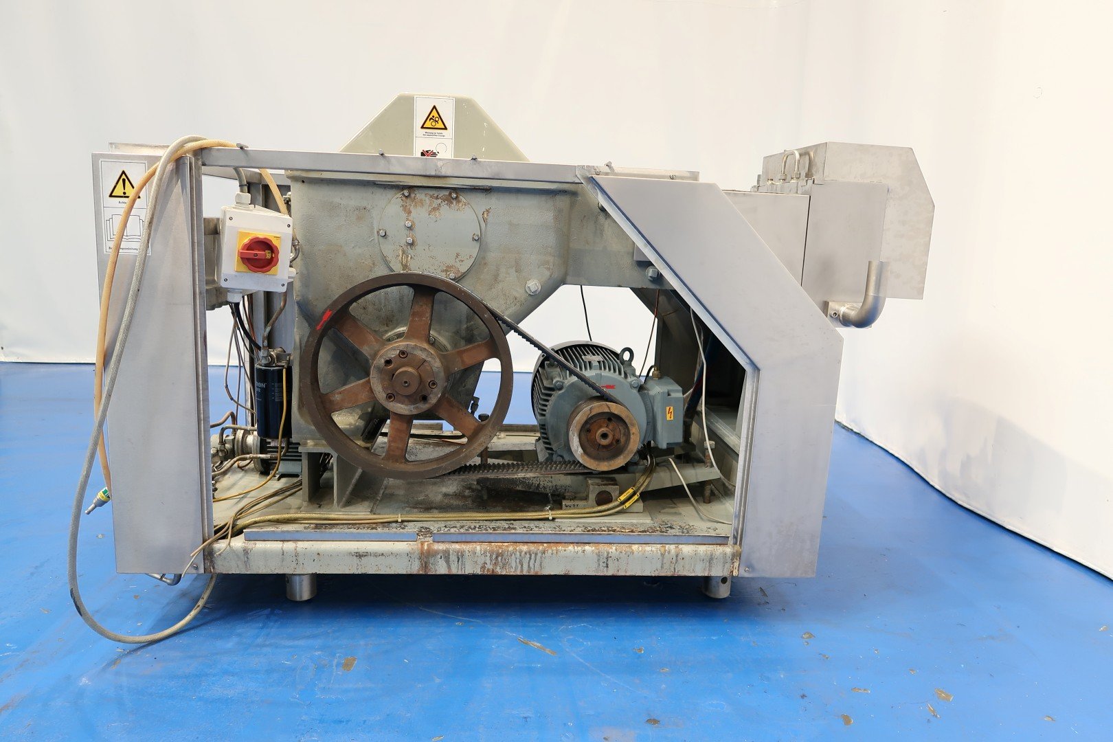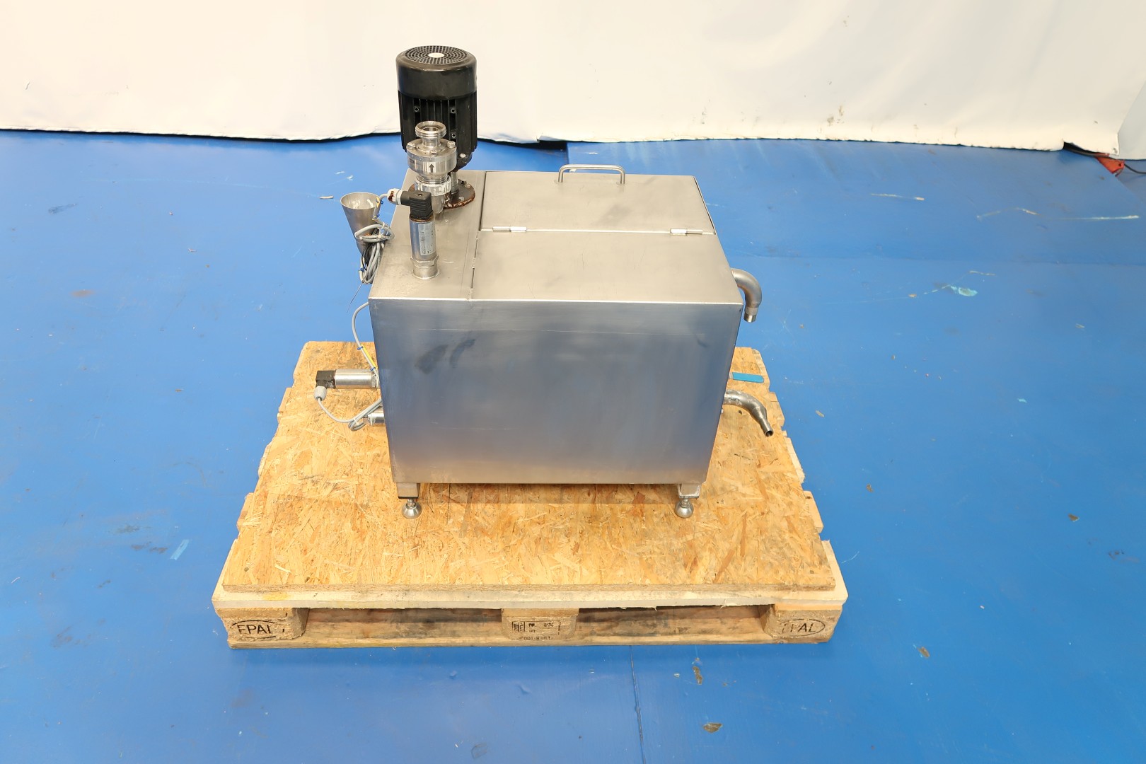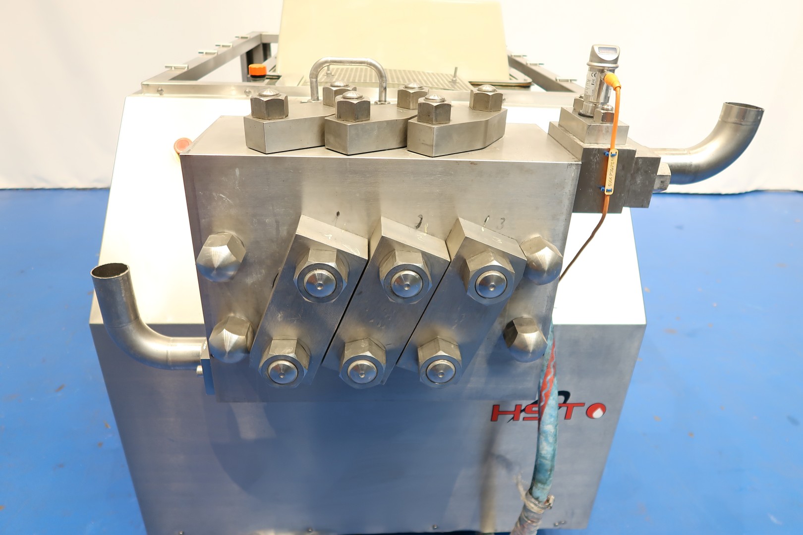 High pressure pump (can be rebuilt to homogeniser). 3 Pistons, piston diameter: 51 mm. Stainless steel cladded. Connections: 2 x 2" pipe. Motor power: 15 kW and maximum pressure in current confirguration with this motor 100 bar. Manometer on inlet (ingoing pressure). Electronic pressure transmitter (IFM) with display on the sensor. Flowswitch on cooling water. Water circulation unit with pump and tank for piston lubrication water tank (for less water use) with 2 x levelsensor, capacity ca. 90 ltr. No controls. Total dimensions high pressure pump: 200x115x130 (lxwxh) cm - weight: 2.288 kg.
