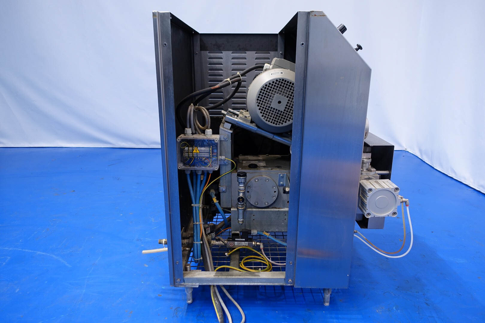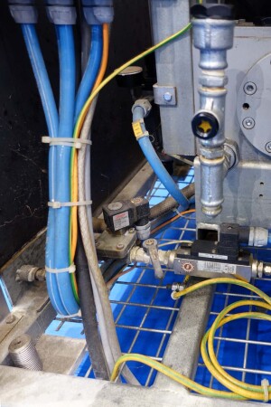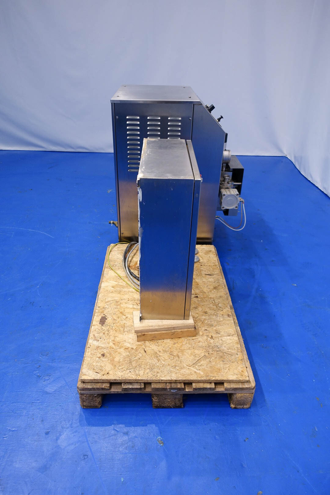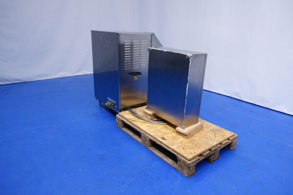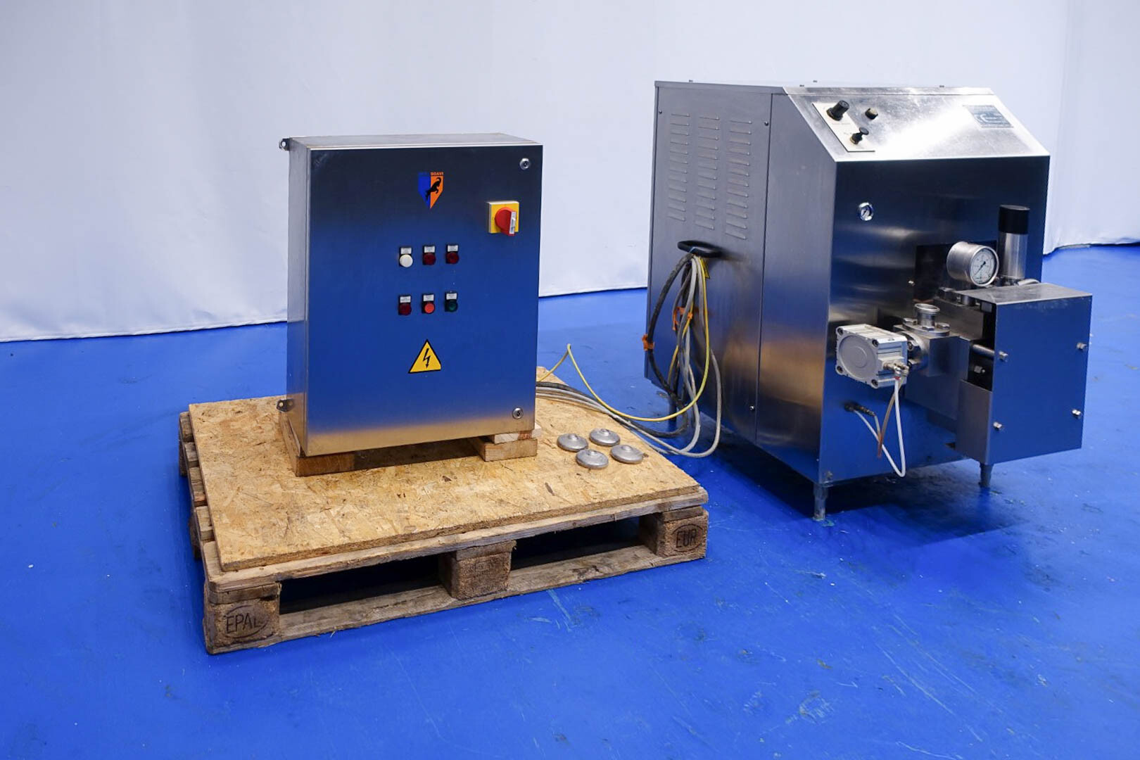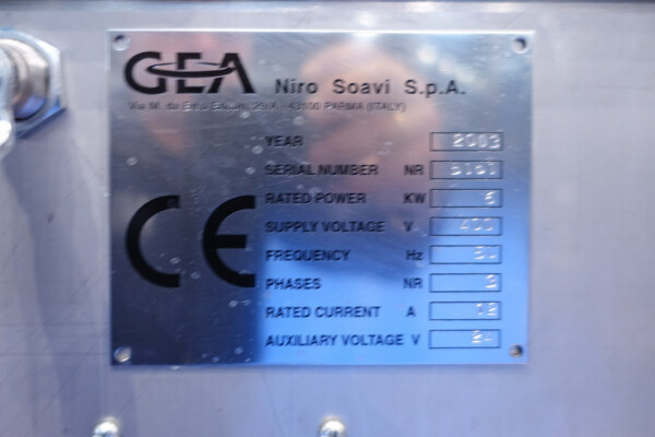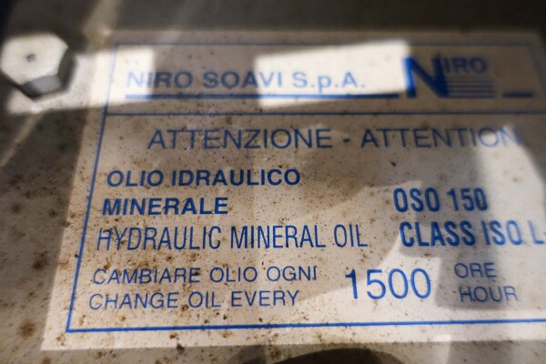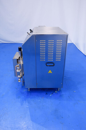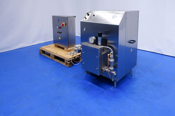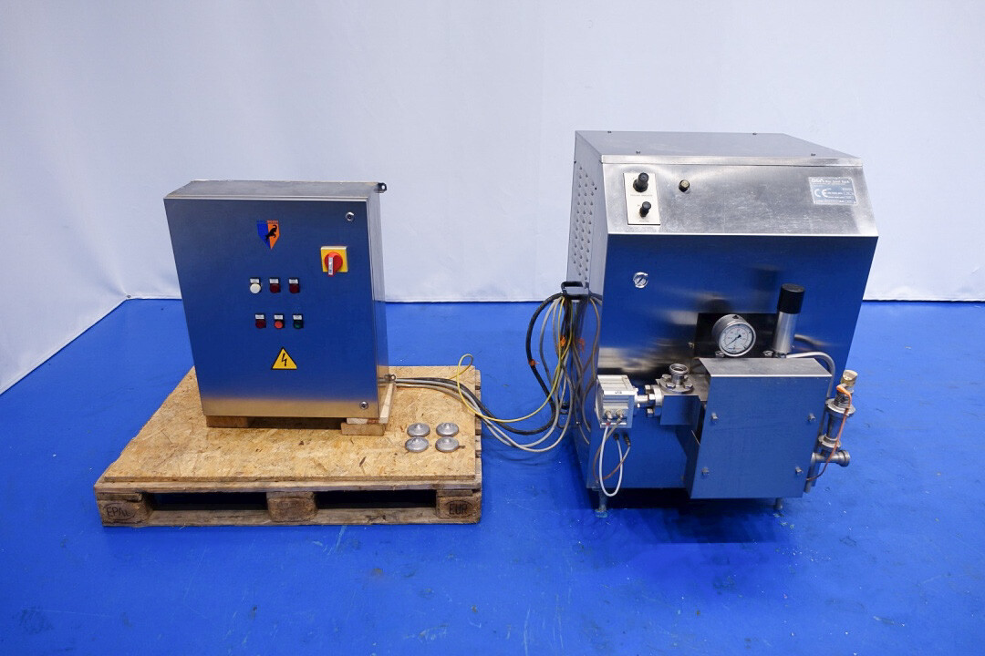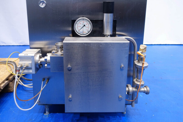 Hogedrukhomogenisator. 3 zuigers, 1-traps, met handmatige drukregeling. Zuigers, zuigerdiameter 30 mm en slag: ca. 55 mm. RVS bekleed. Huidig motorvermogen: 6,0 kW - 12 A - 50 Hz - 400 V - 3 fasen. Maximale druk in stroomconfiguratie met deze motor tot 250 bar. Vrijstaand bedieningspaneel (voor wandmontage). Bedrijfsuren op meter: 1.202. Inclusief elektronische druktransmitter op de inlaat, drukindicator, overdrukventiel, flowswitch (en handmatige klep) op het koelwater.